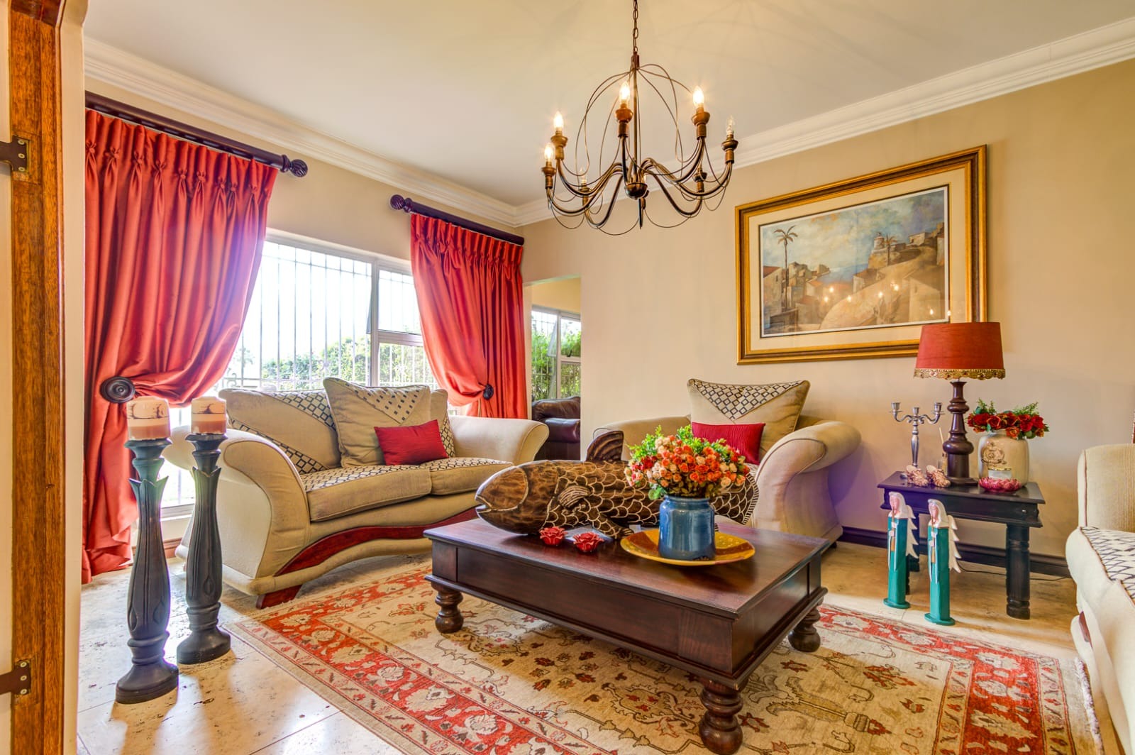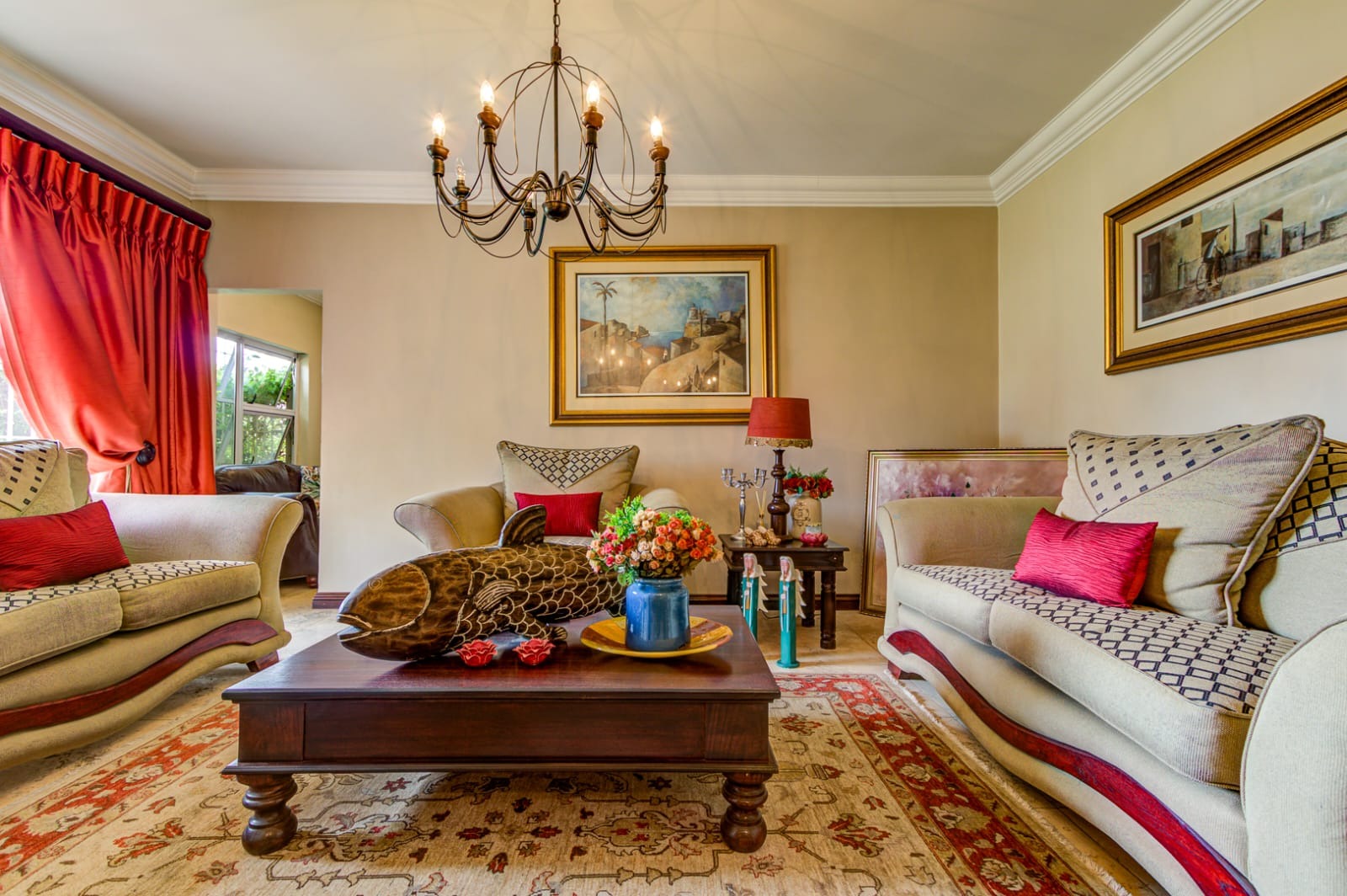 - Inviting Living Areas – a cozy lounge and living room featuring a charming fireplace, fitted curtains, and a stunning chandelier that adds a touch of sophistication