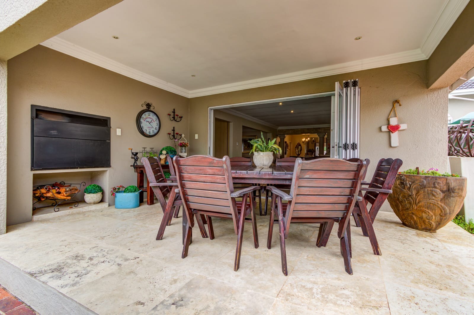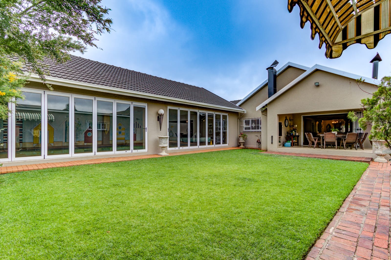 Step out through stacking doors from the lounge into the sunny garden and patio area, complete with a built-in braai — perfect for entertaining or relaxing on warm days. Enjoy the seamless flow of fresh air and natural light throughout the home.