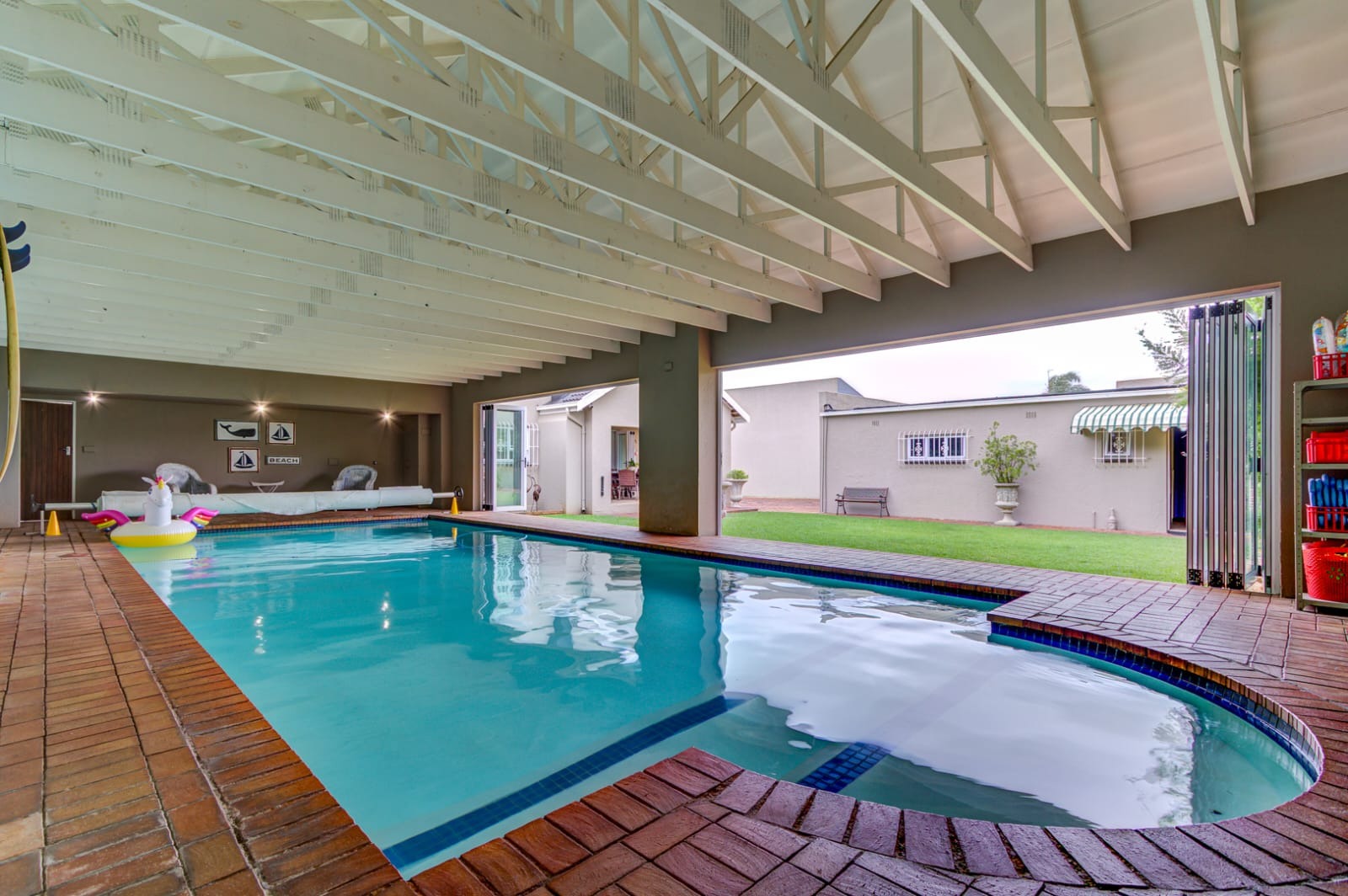 One of the standout features of this property is its enclosed, heated swimming pool area, currently utilized as a swimming school. The space is beautifully designed with stacking doors to allow for both climate control and an abundance of natural light. There’s also a separate bathroom with a toilet and basin, ideal for guests or pool users.
