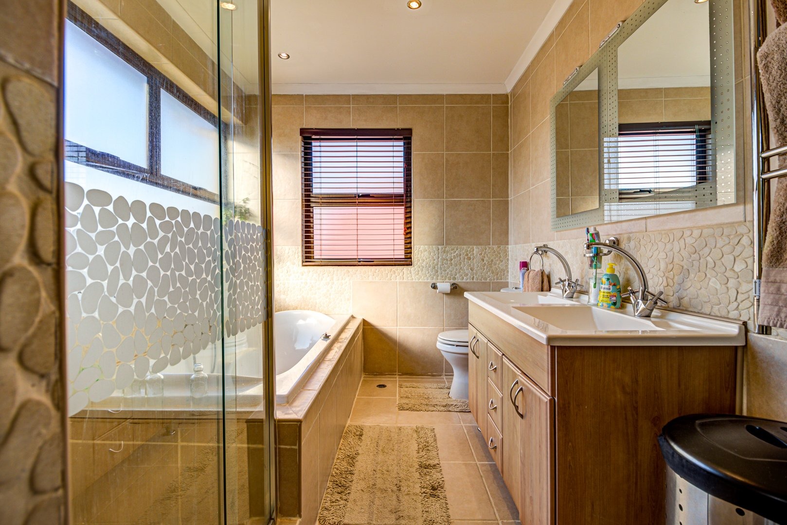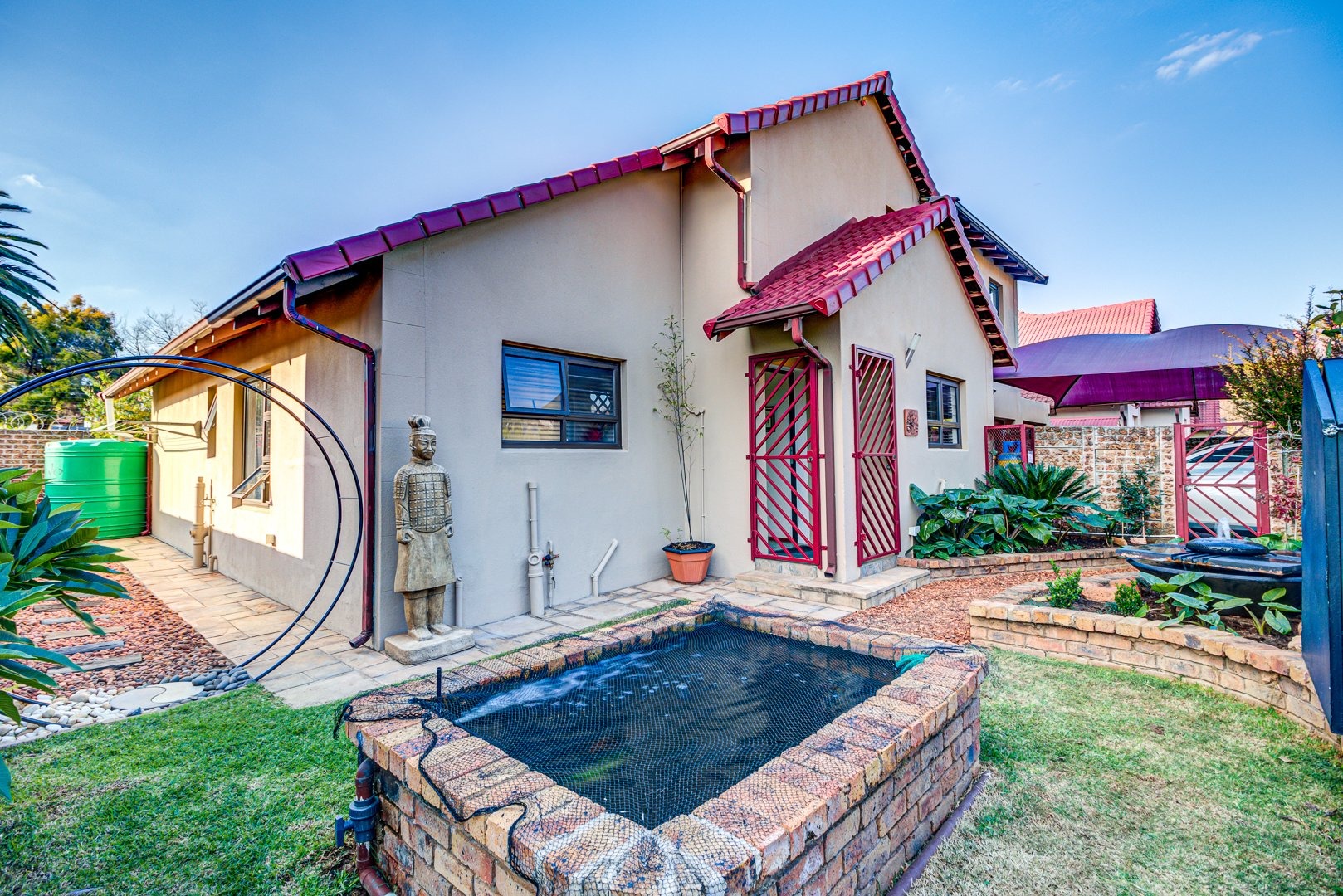 Open plan lounge and dining room. Open plan kitchen with granite tops, a breakfast counter and scullery. 3 Spacious bedrooms. 3 Modern bathrooms. Main bedroom with an en-suite bathroom and pajama lounge/ study. Two bedrooms has their own en-suite bathrooms. There is also an aircon inside the home for those hot summer days. Triple garage with automated doors and direct entry to the home. Triple carport parking. Solar heated pool to make a splash in! Landscaped garden. Covered patio. Security guard on duty 24/7.