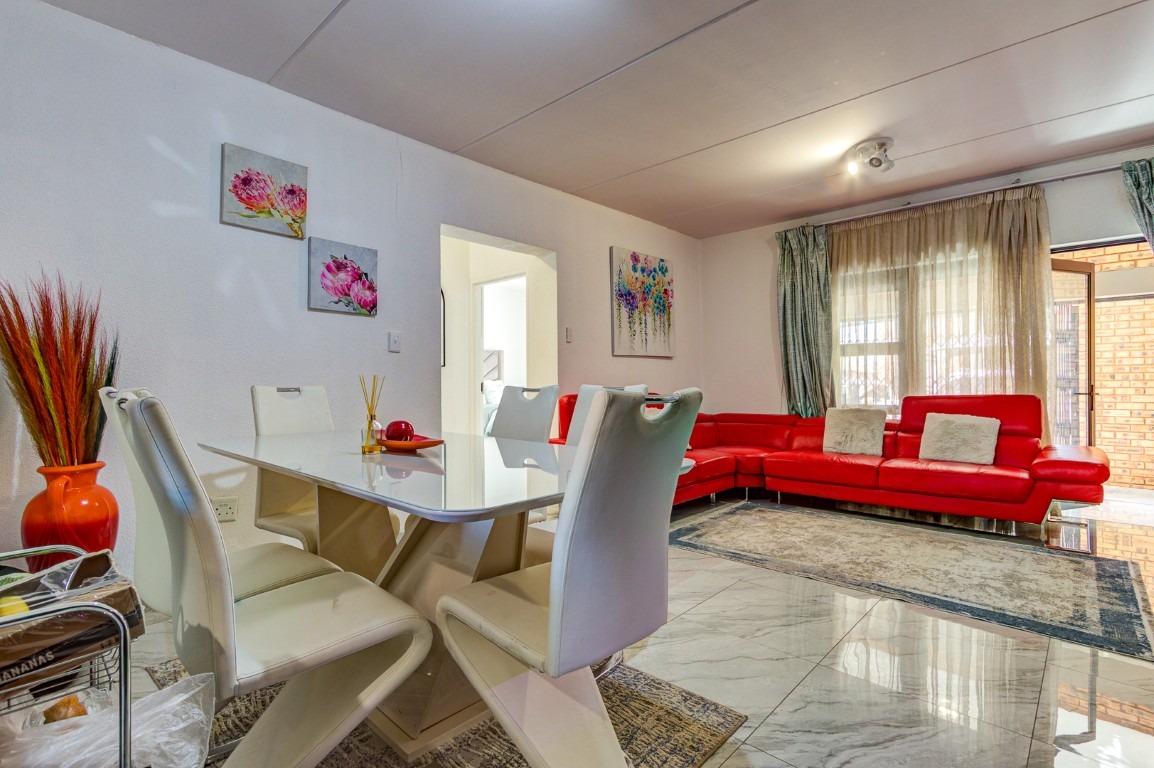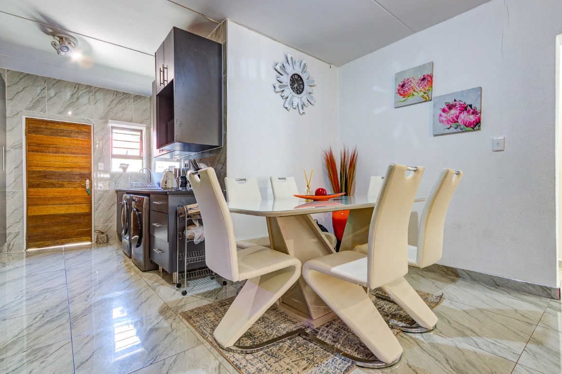 Upon entering the home, you are welcomed by a tiled entrance hall that leads into a spacious open-plan lounge, neatly tiled and designed for relaxed everyday living. The lounge flows seamlessly into the open-plan dining area, creating a warm and inviting space perfect for family meals and entertaining guests.