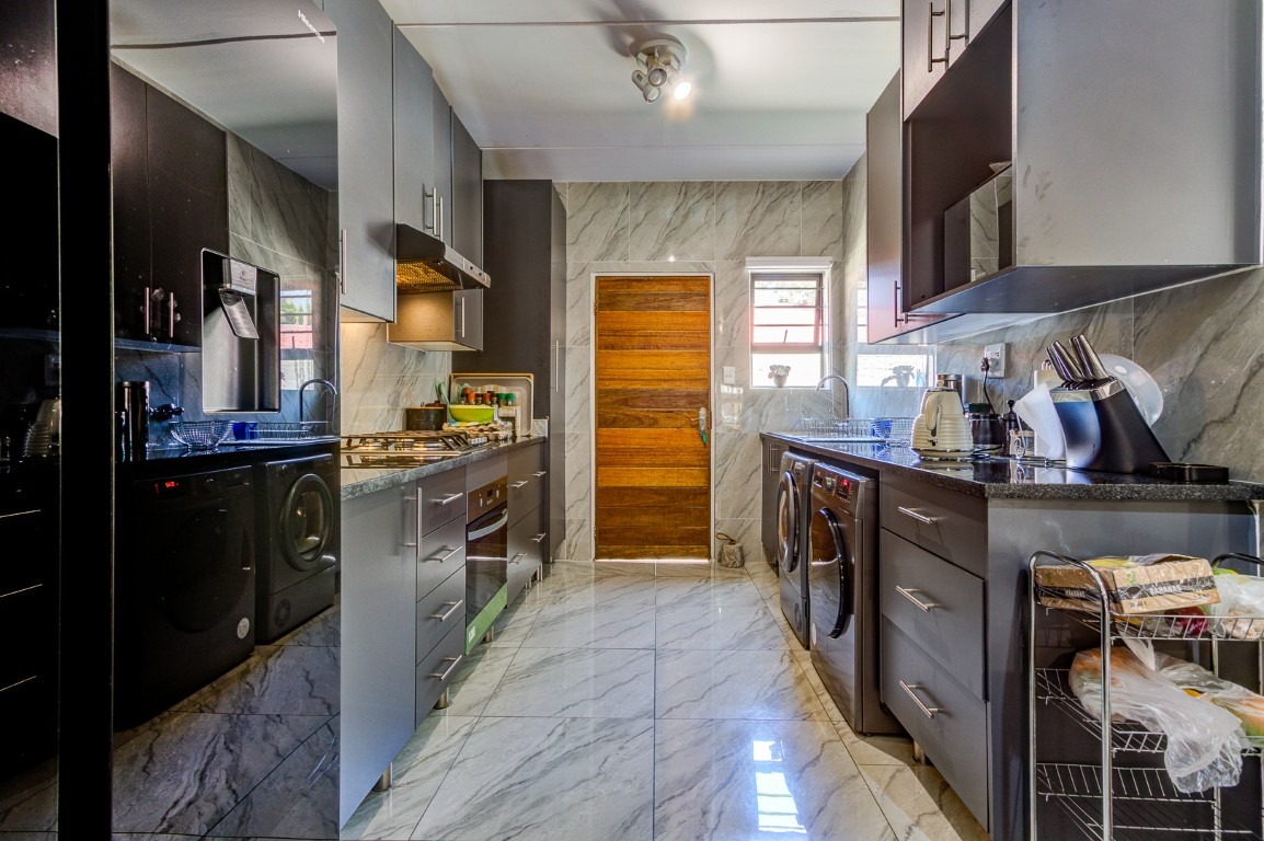 The large open-plan kitchen is practical and spacious, offering ample cupboard space and a functional layout for meal preparation while still being connected to the main living areas.