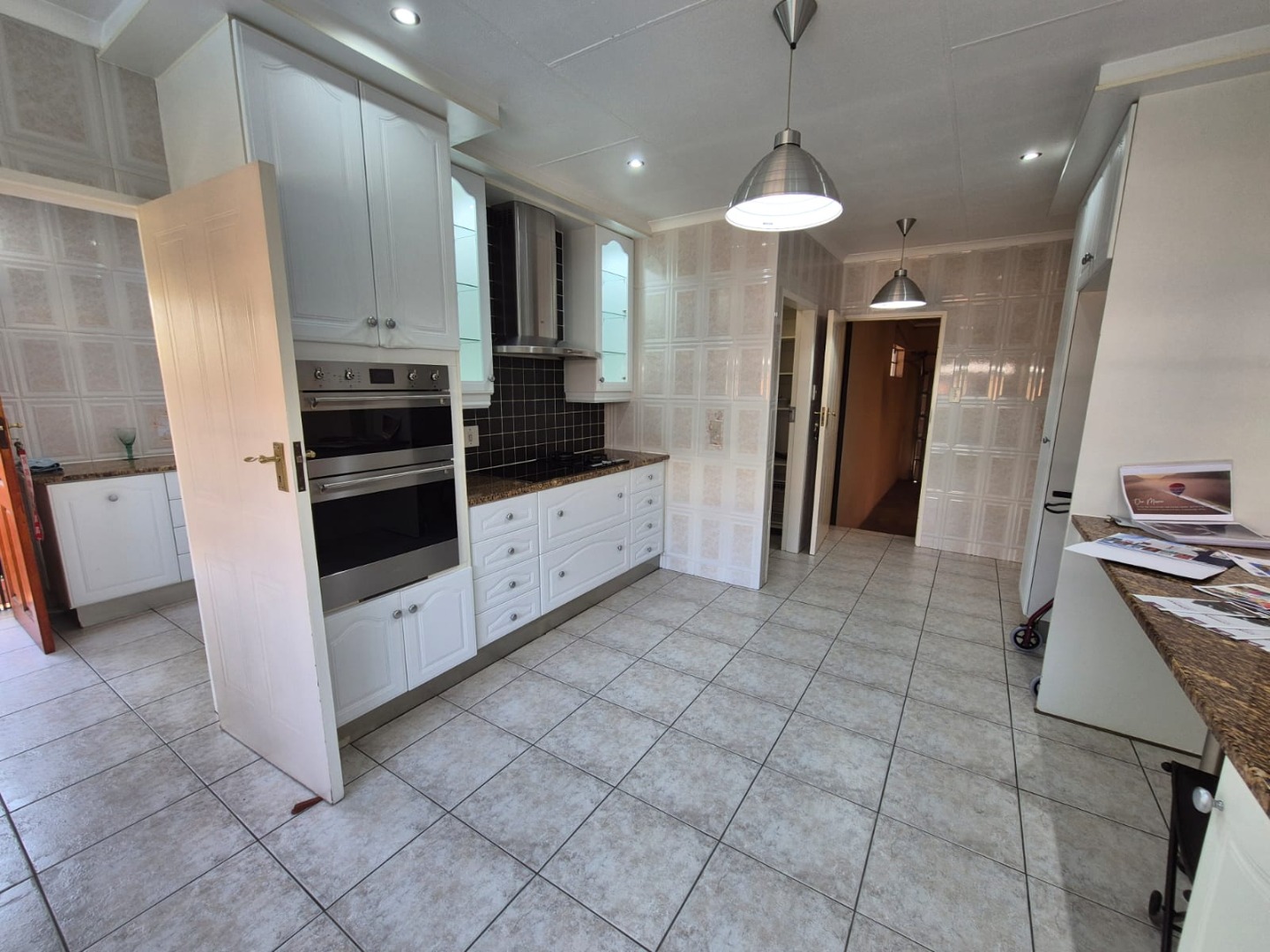 The gourmet Kitchen - a spacious, well-appointed kitchen boasting ample crisp white cabinetry, luxurious granite countertops, double eye-level Smeg ovens, both gas and electric cooking options, and a separate laundry/scullery area for ultimate practicality.