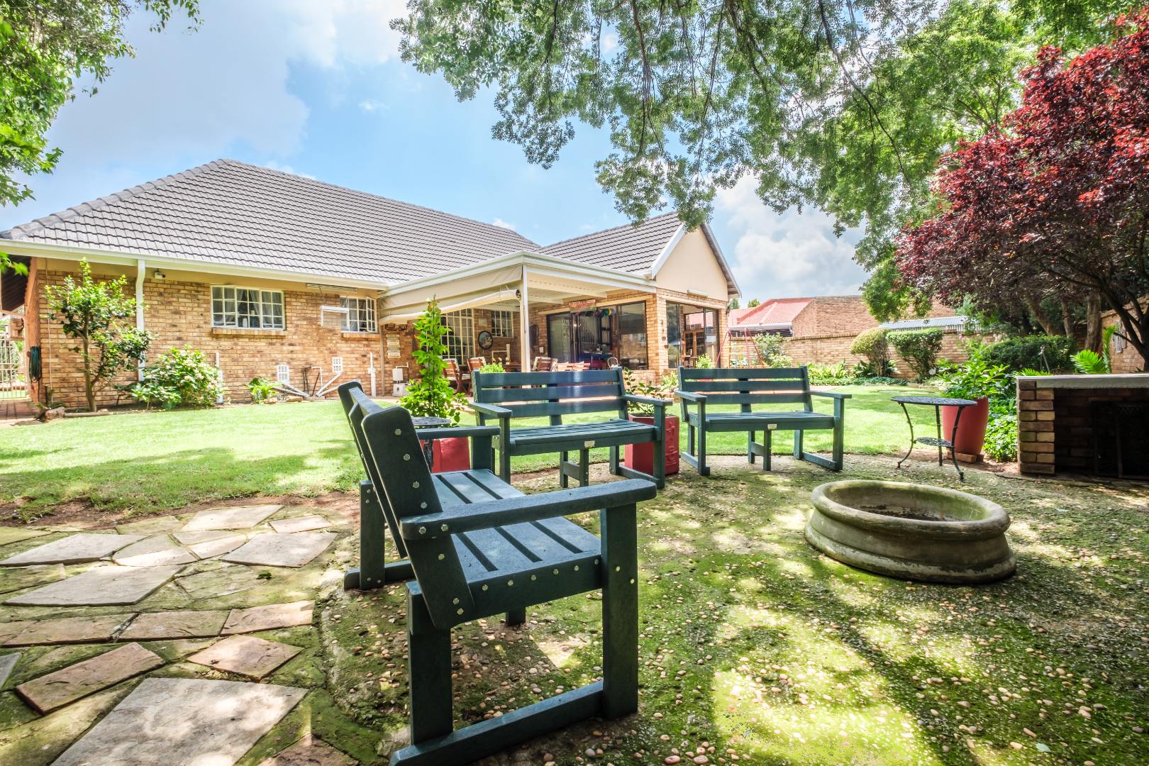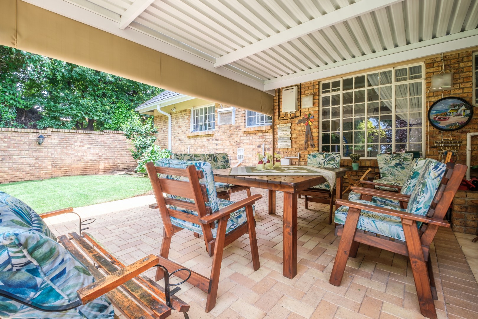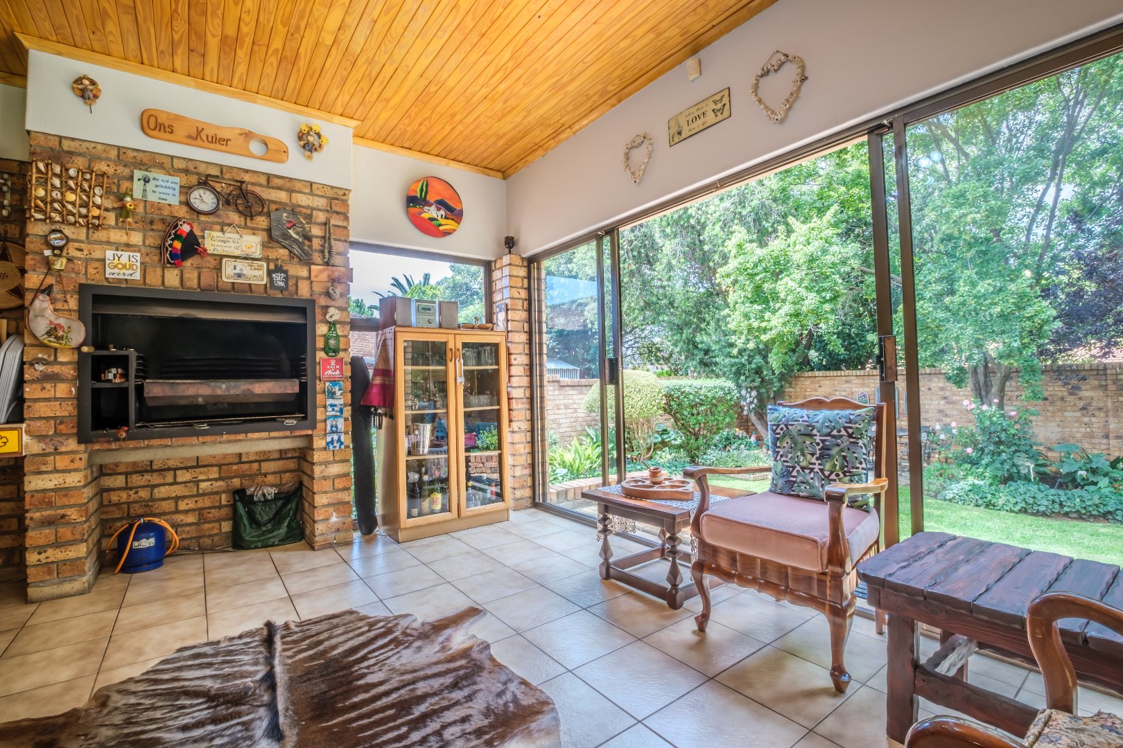The enclosed entertainment area has a built-in braai and it opens up to a lovely garden with a patio area, boma and lovely established garden.