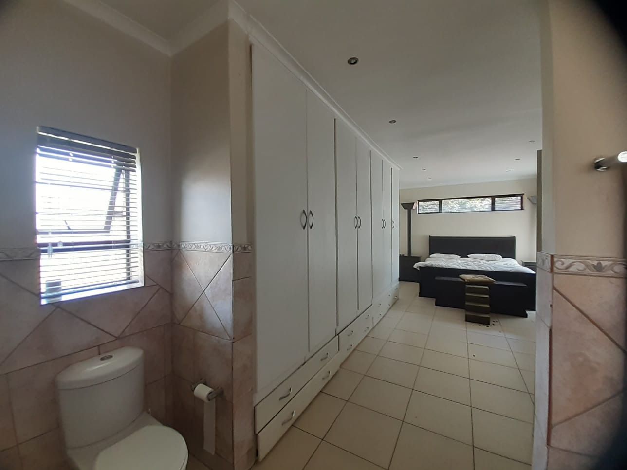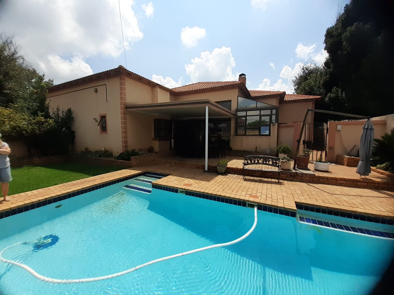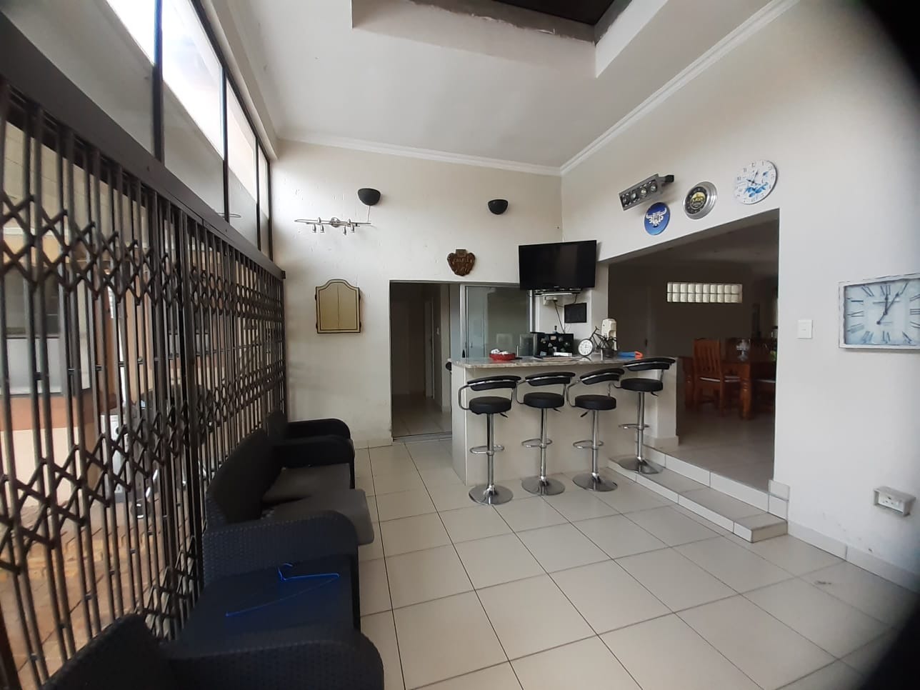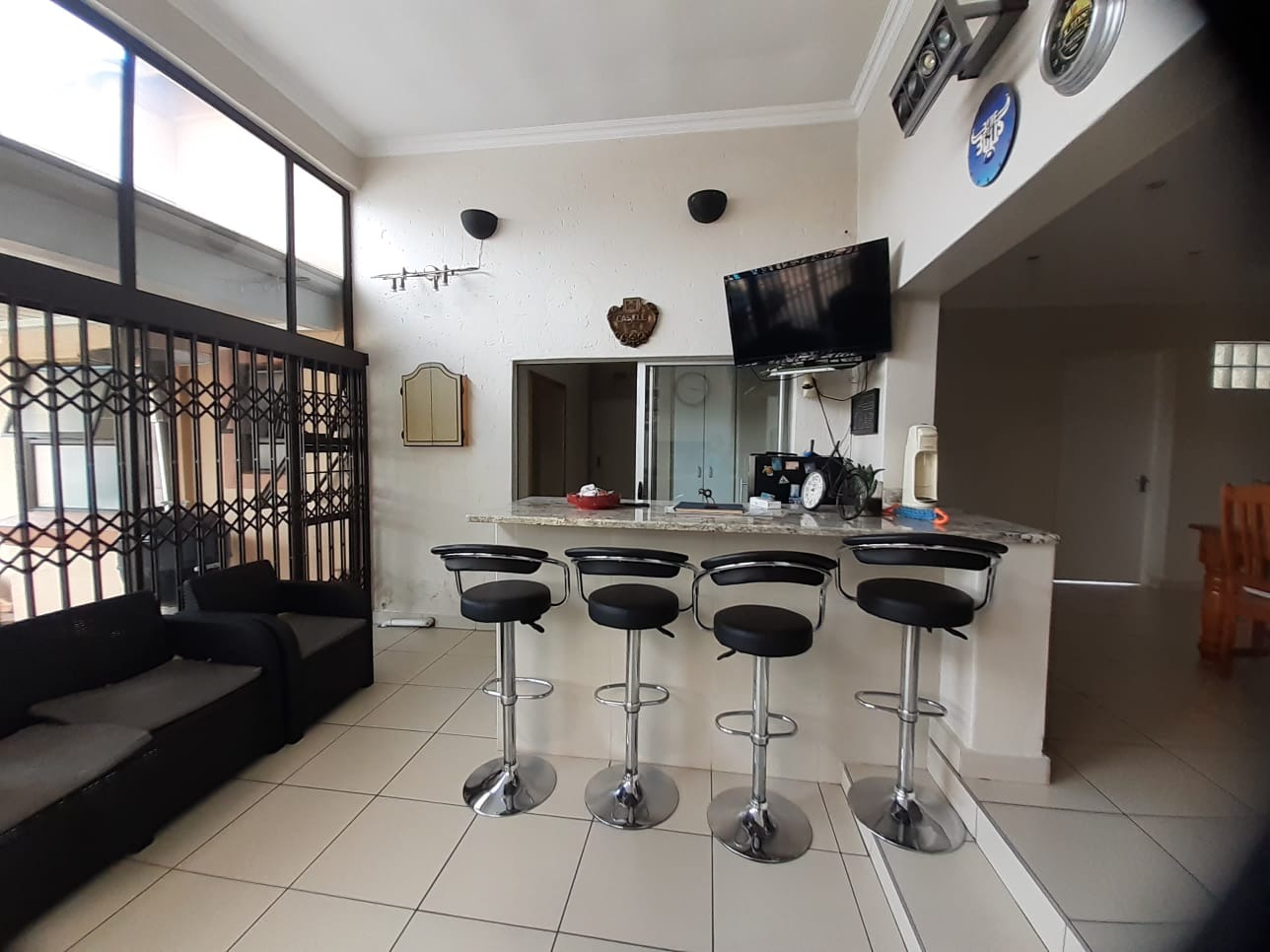 Adjacent to the main living space, a large bar room provides an ideal setting for social gatherings, with sliding doors opening onto an inviting outside patio and pool area, creating a seamless indoor-outdoor experience. The residence boasts four tiled bedrooms, including a large main and guest bedroom. One bedroom offers the versatility of a pyjama lounge or a potential fifth bedroom. There are three well-appointed bathrooms, two en-suite, each offering a full suite with a bath, shower, and washbasin, complete with vanity units in the en-suites.