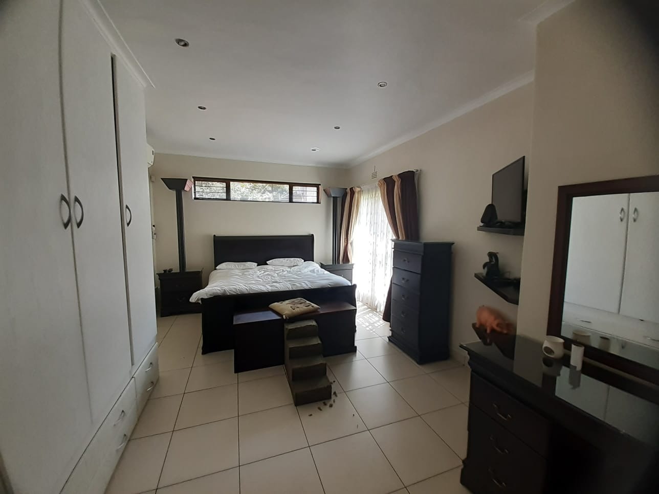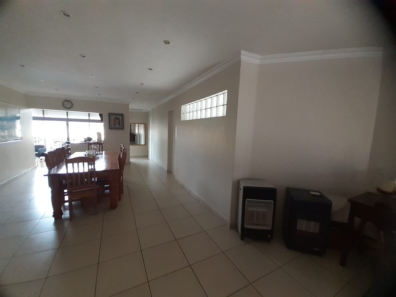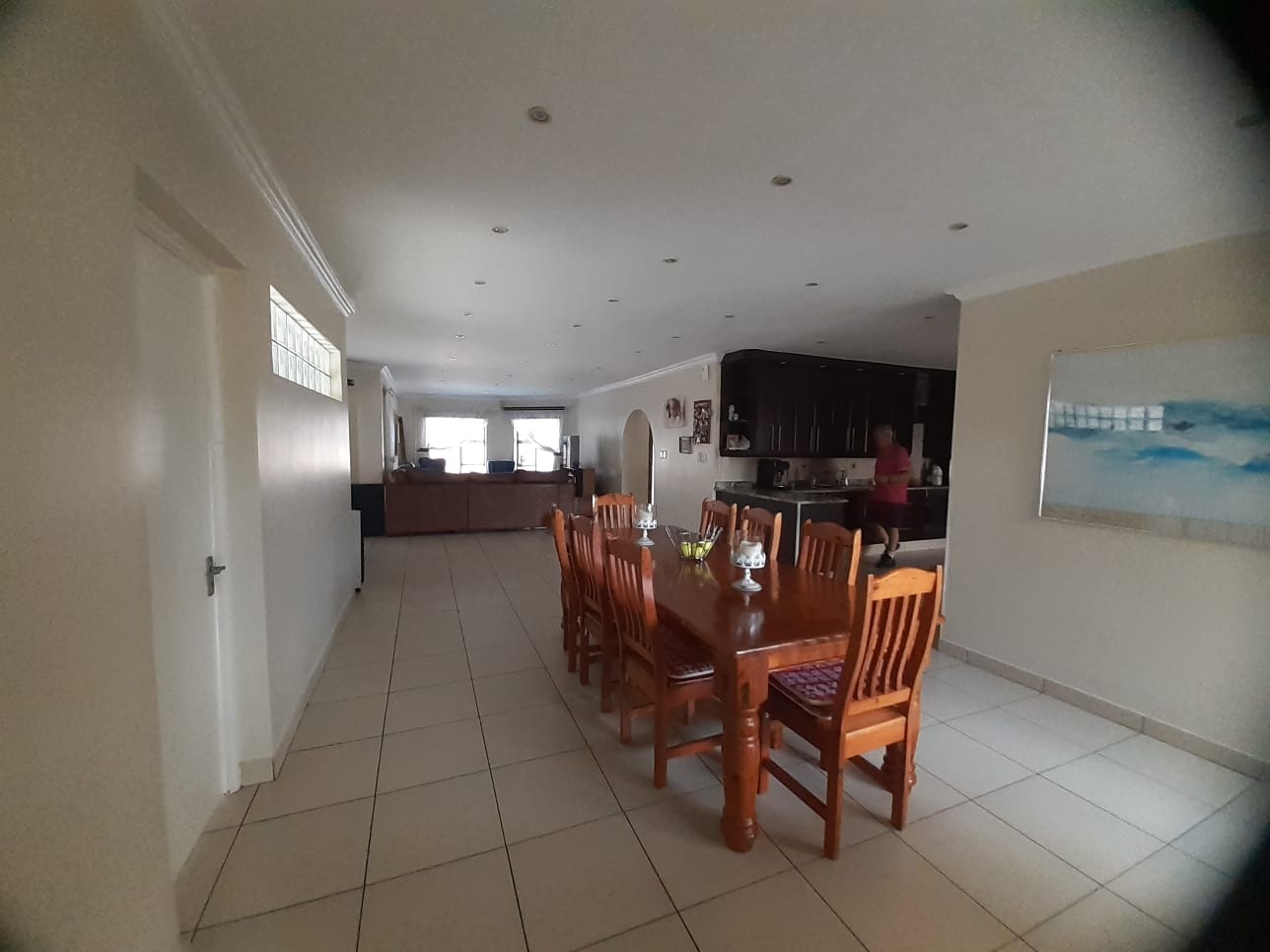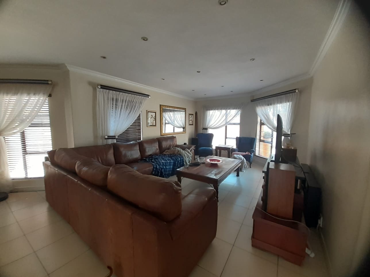 Adjacent to the main living space, a large bar room provides an ideal setting for social gatherings, with sliding doors opening onto an inviting outside patio and pool area, creating a seamless indoor-outdoor experience. The residence boasts four tiled bedrooms, including a large main and guest bedroom. One bedroom offers the versatility of a pyjama lounge or a potential fifth bedroom. There are three well-appointed bathrooms, two en-suite, each offering a full suite with a bath, shower, and washbasin, complete with vanity units in the en-suites.