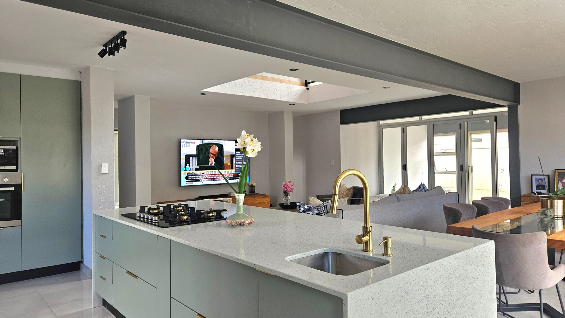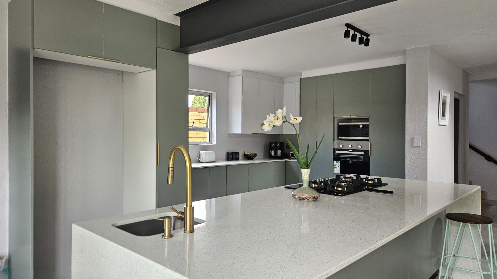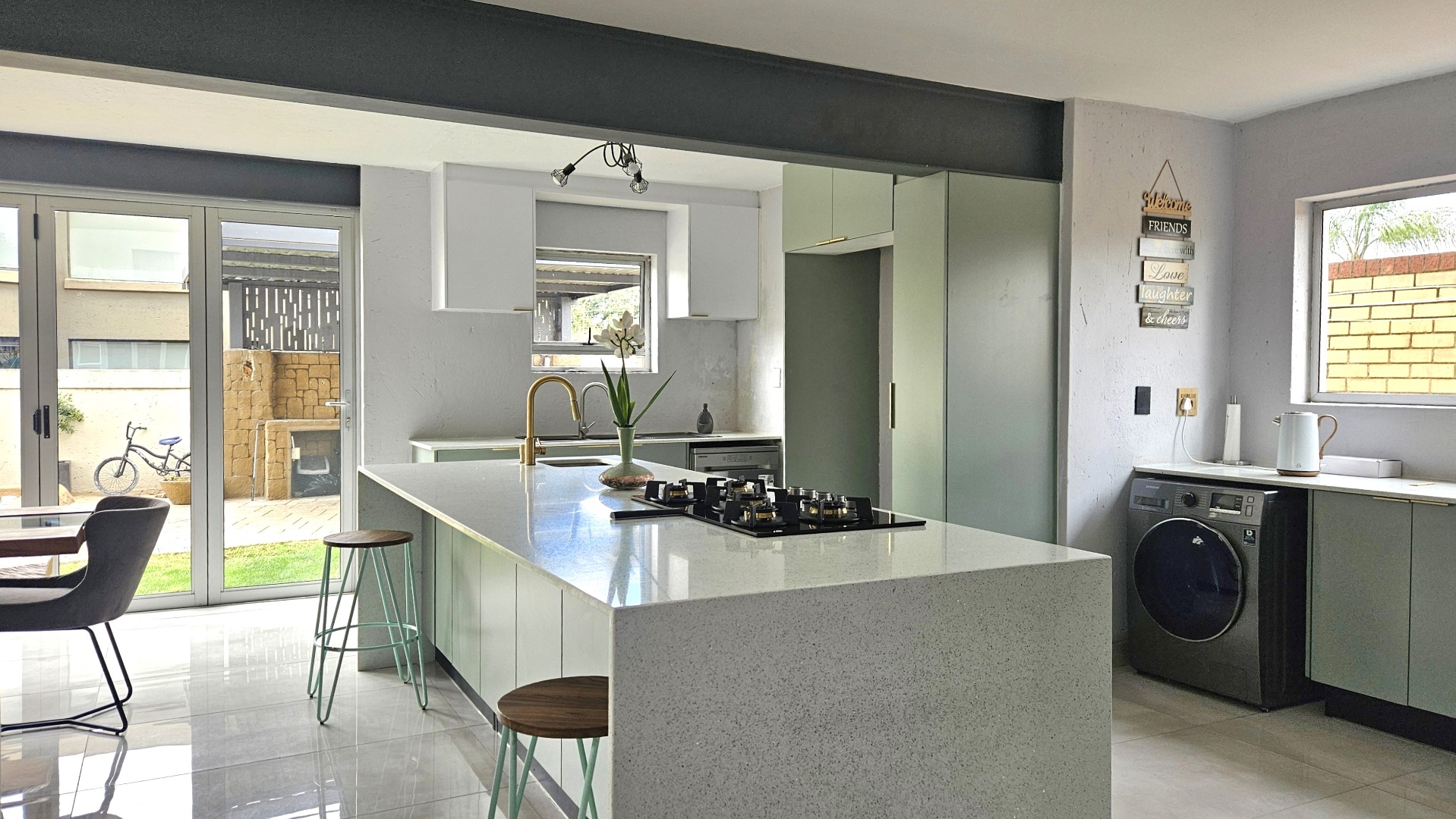The heart of the home is the gourmet designed kitchen, boasting a large centre island with gas hob, eye level oven, built-in microwave, veggie basin, space for double door fridge and plumbing
