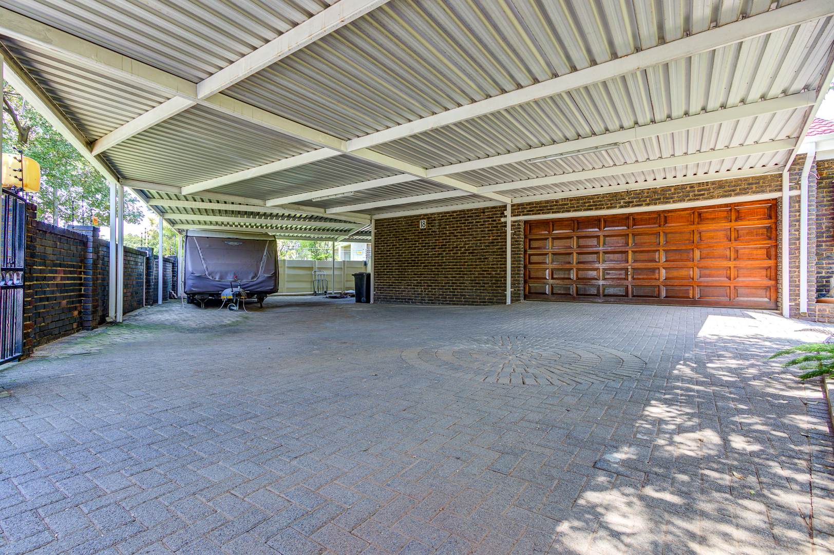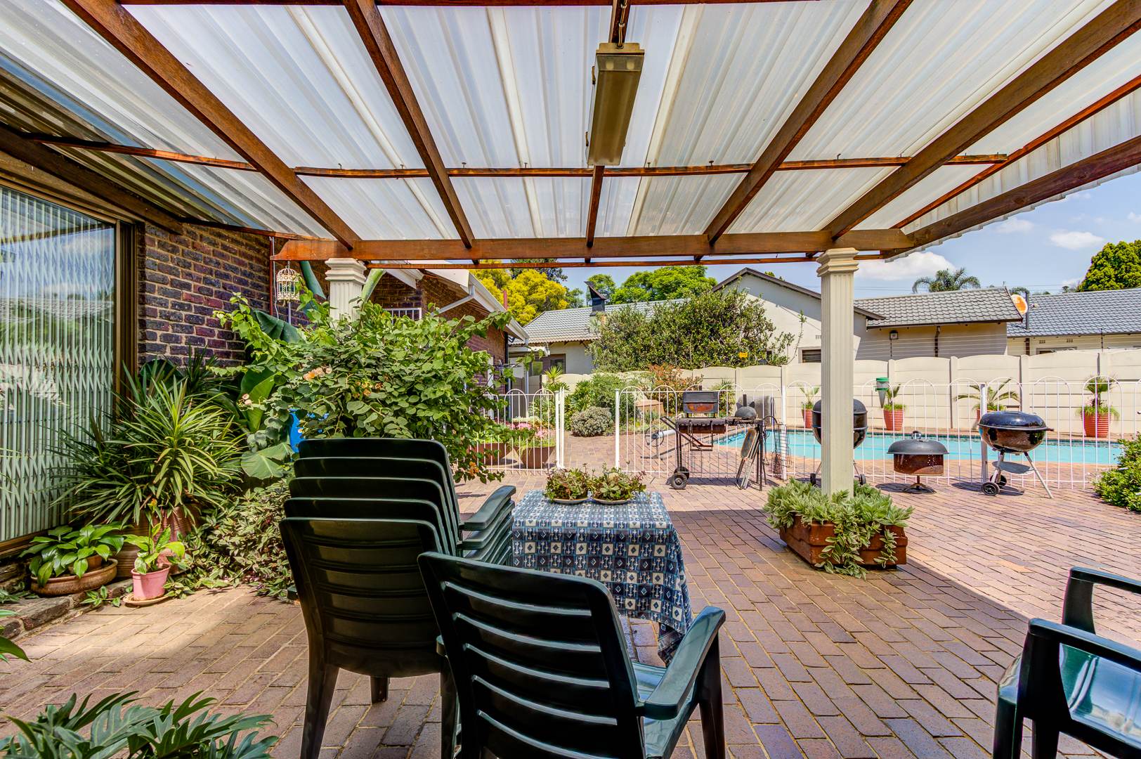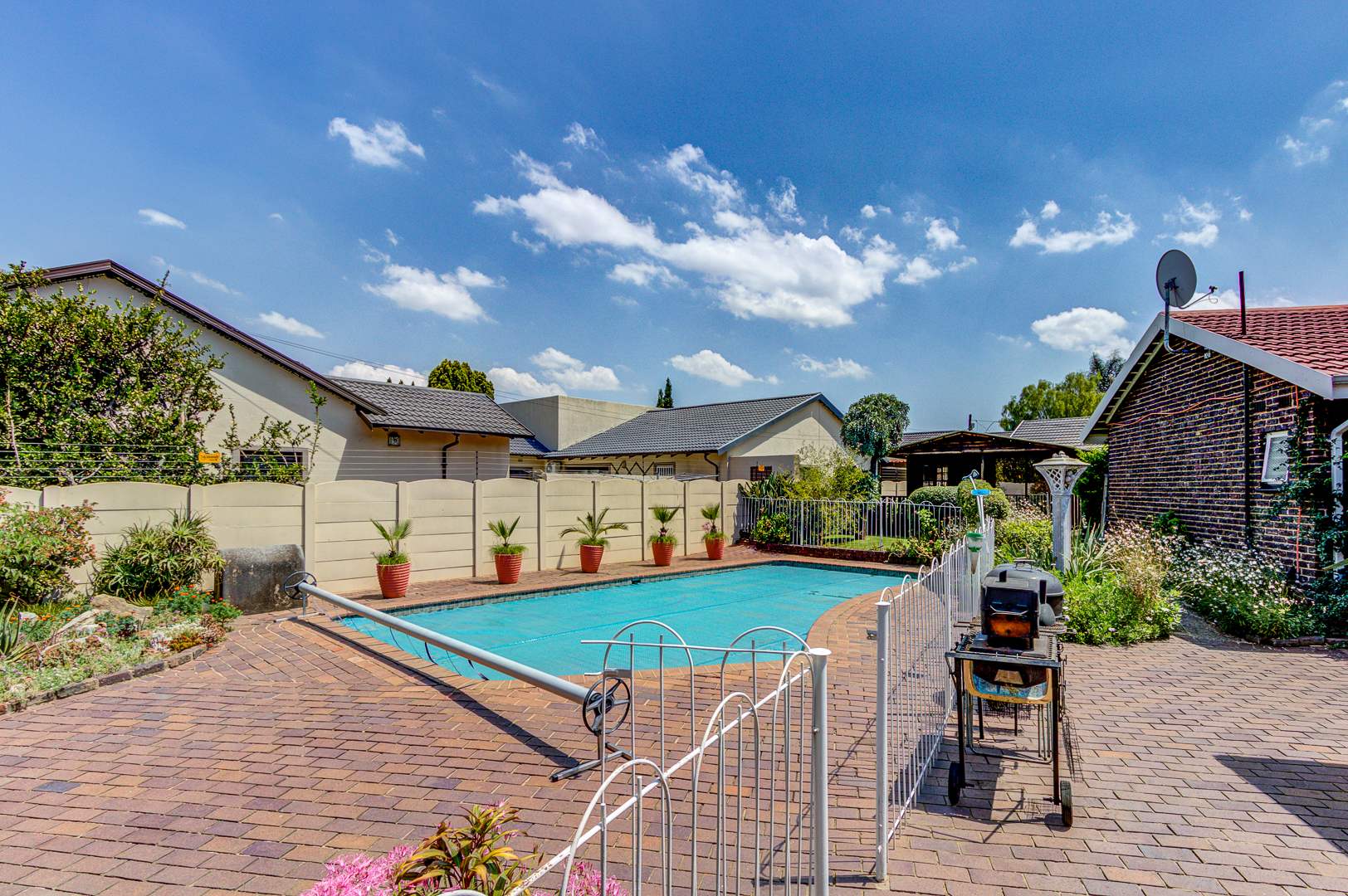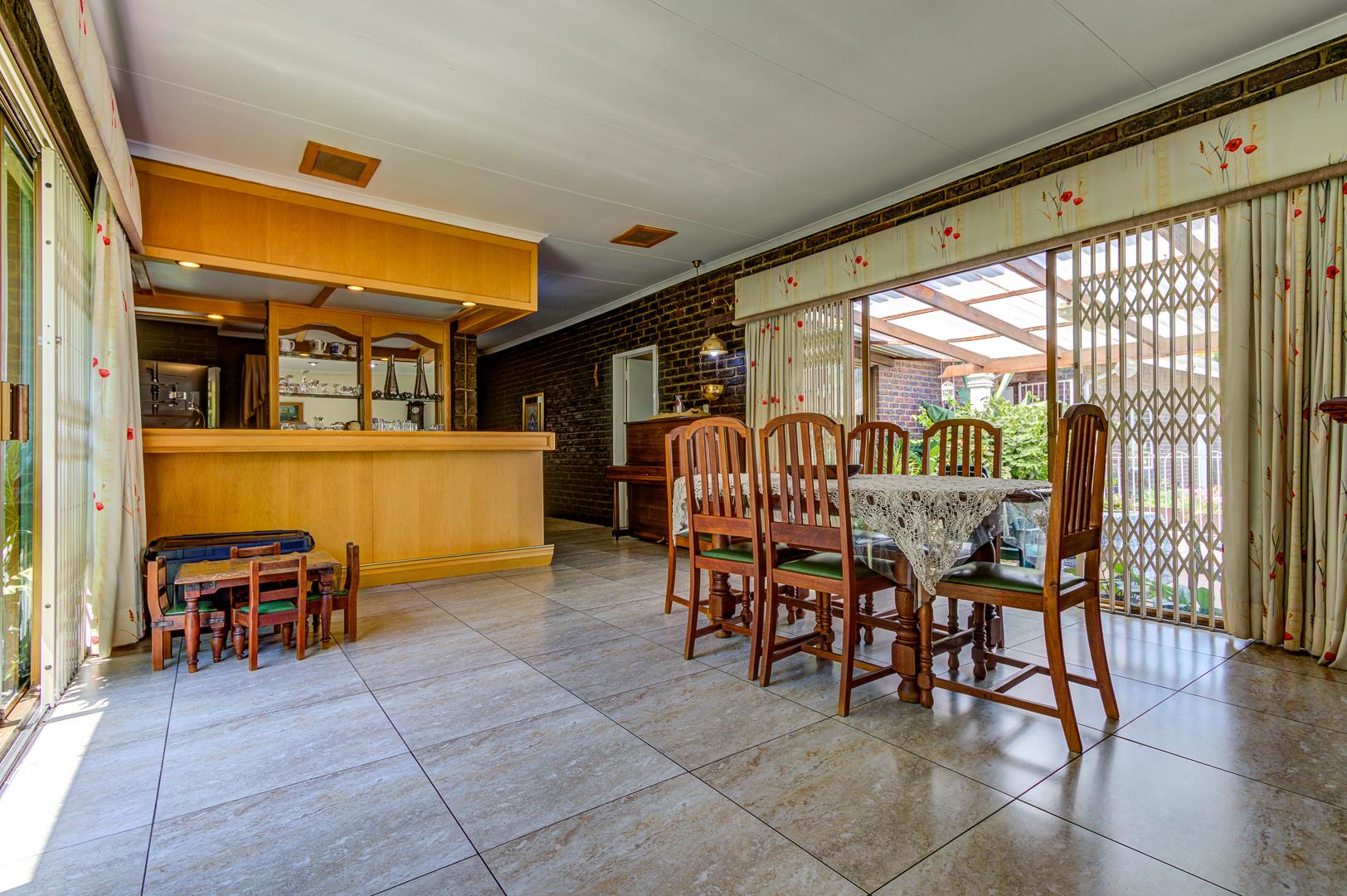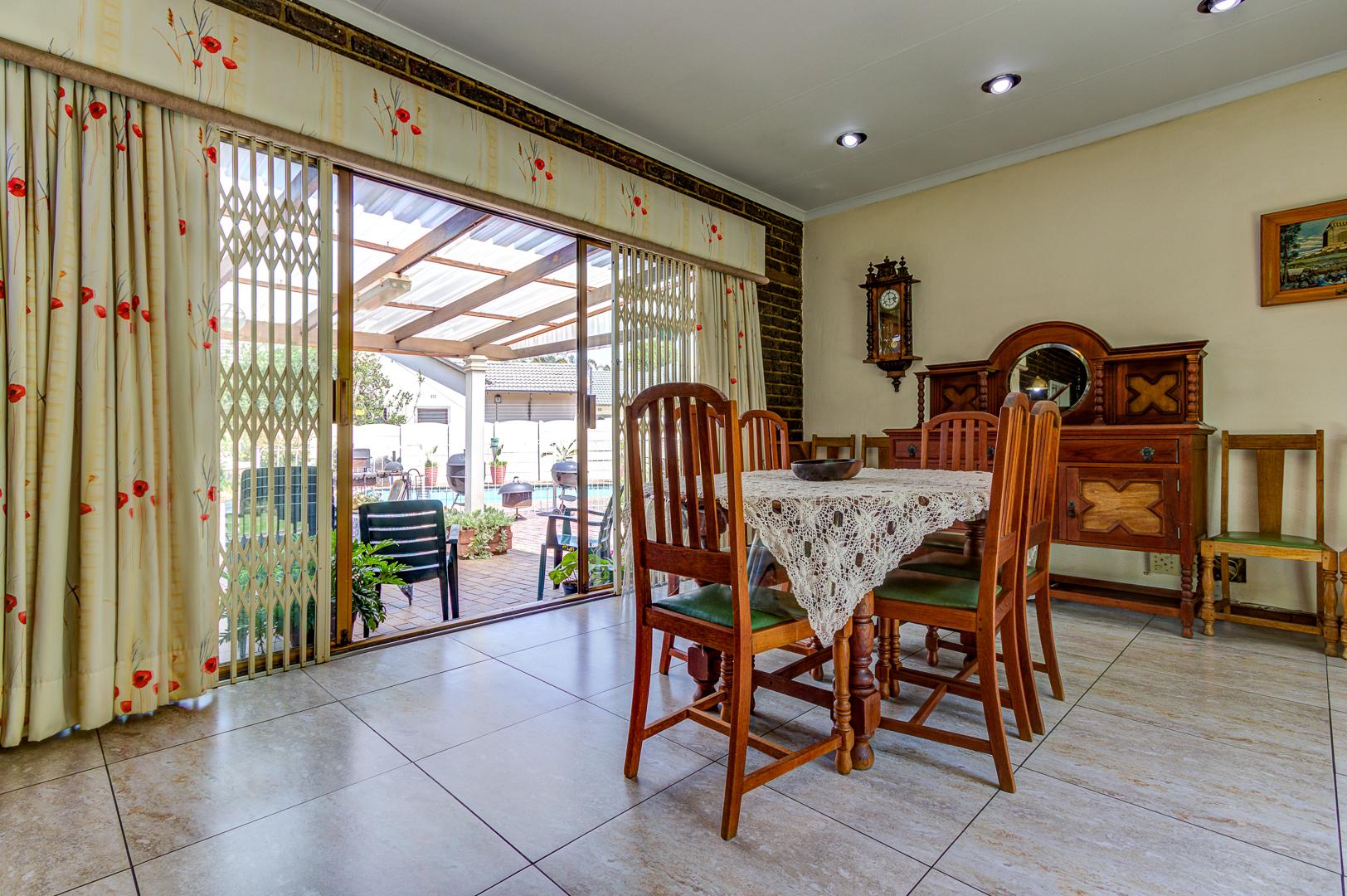 Step outside to a delightful outdoor living experience. The property features a sparkling swimming pool, perfect for enjoying the South African climate, surrounded by a well-maintained garden. Paved areas provide easy access and additional parking. With two garages and eight additional parking spaces, there is abundant room for vehicles. Pets are welcome, making this an ideal home for animal lovers.