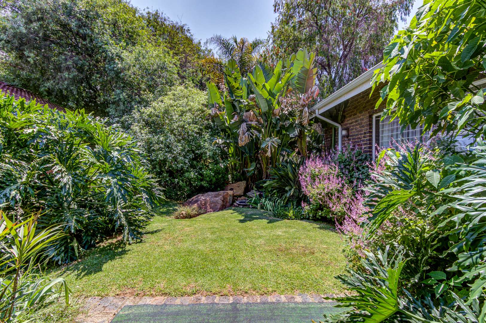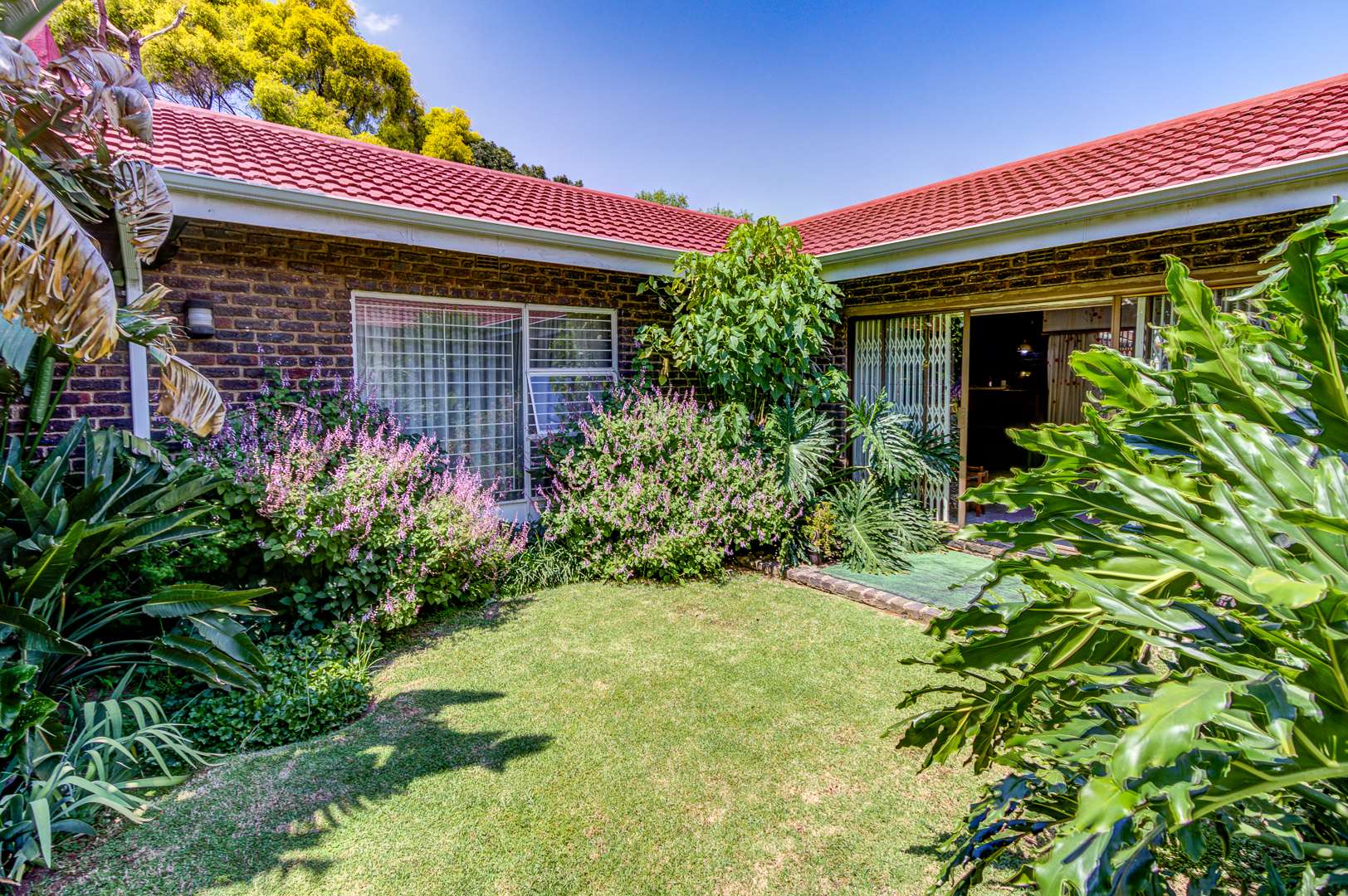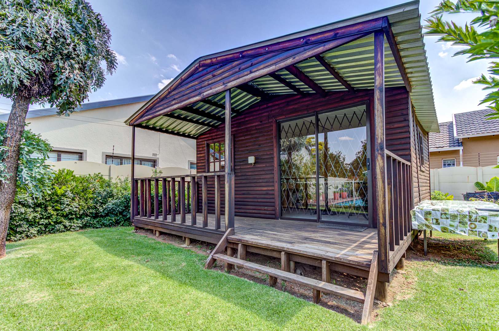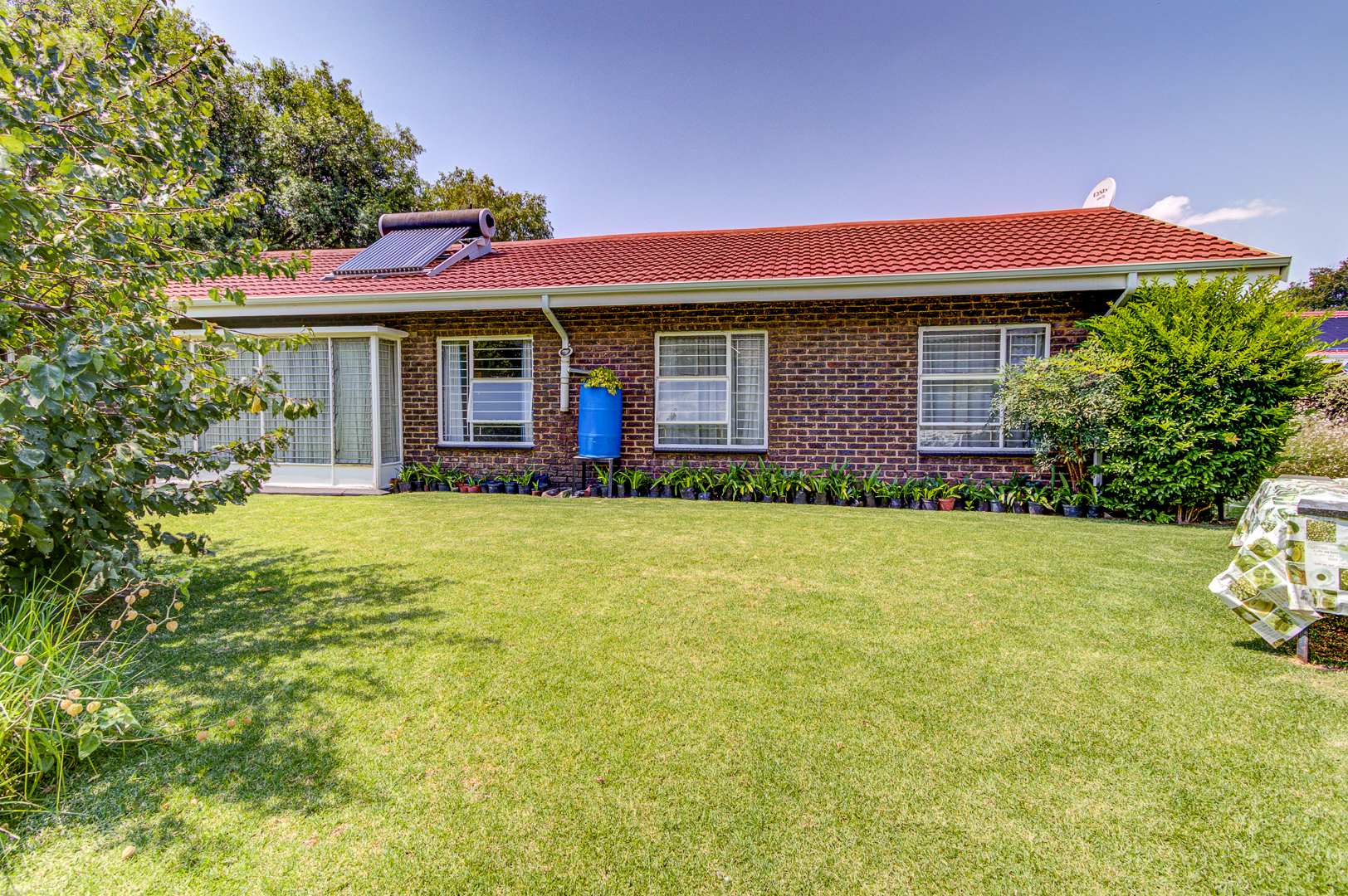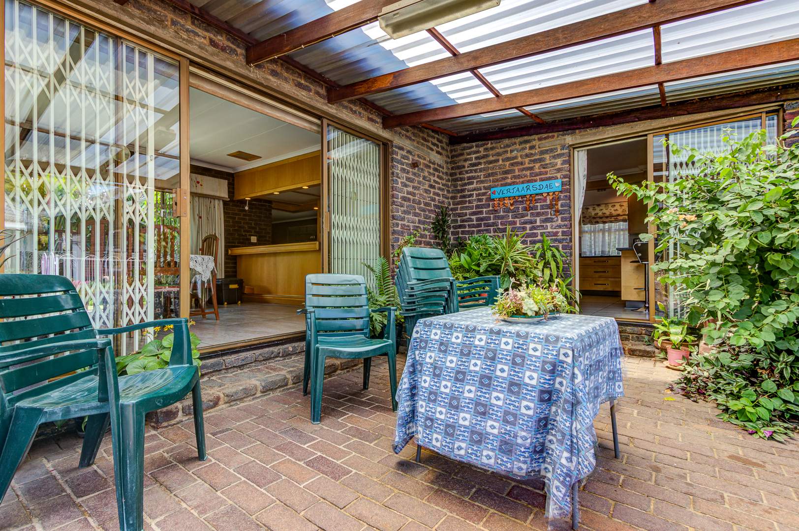 Step outside to a delightful outdoor living experience. The property features a sparkling swimming pool, perfect for enjoying the South African climate, surrounded by a well-maintained garden. Paved areas provide easy access and additional parking. With two garages and eight additional parking spaces, there is abundant room for vehicles. Pets are welcome, making this an ideal home for animal lovers.