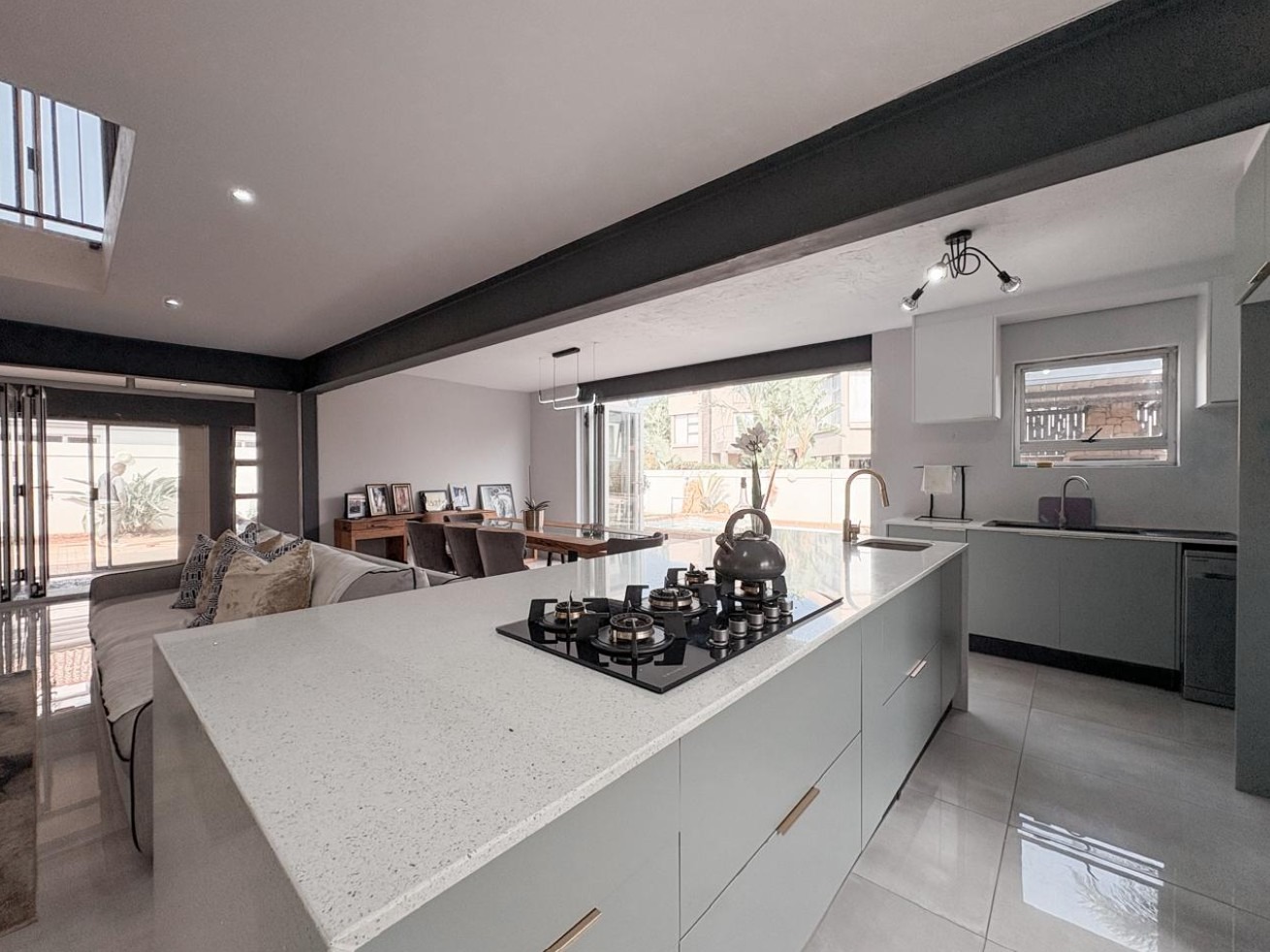 The modern kitchen is stylish and functional, featuring a large island with seating, a gas hob, built-in oven and microwave, space for a double-door fridge, and room for two under-counter appliances.