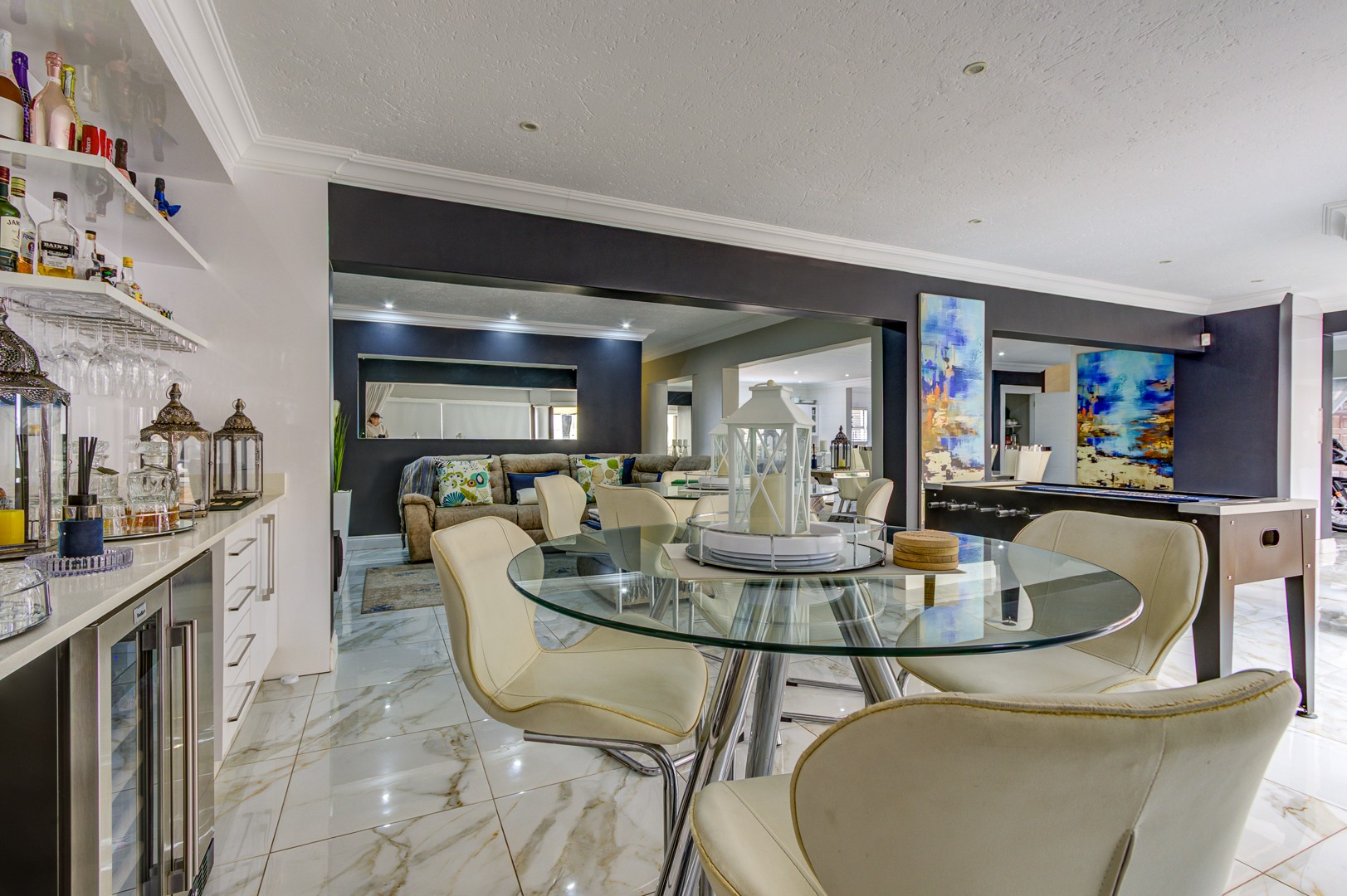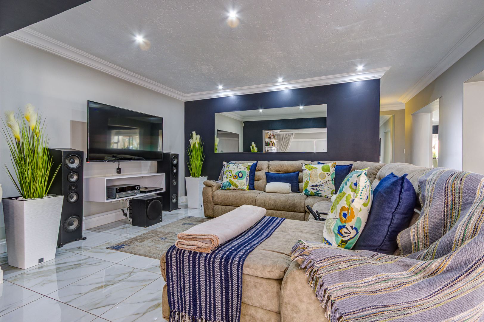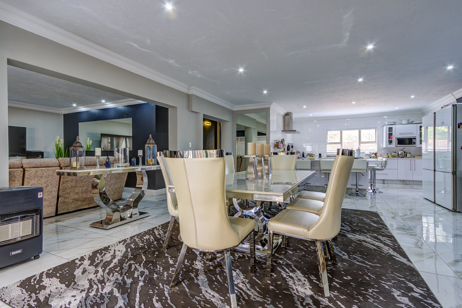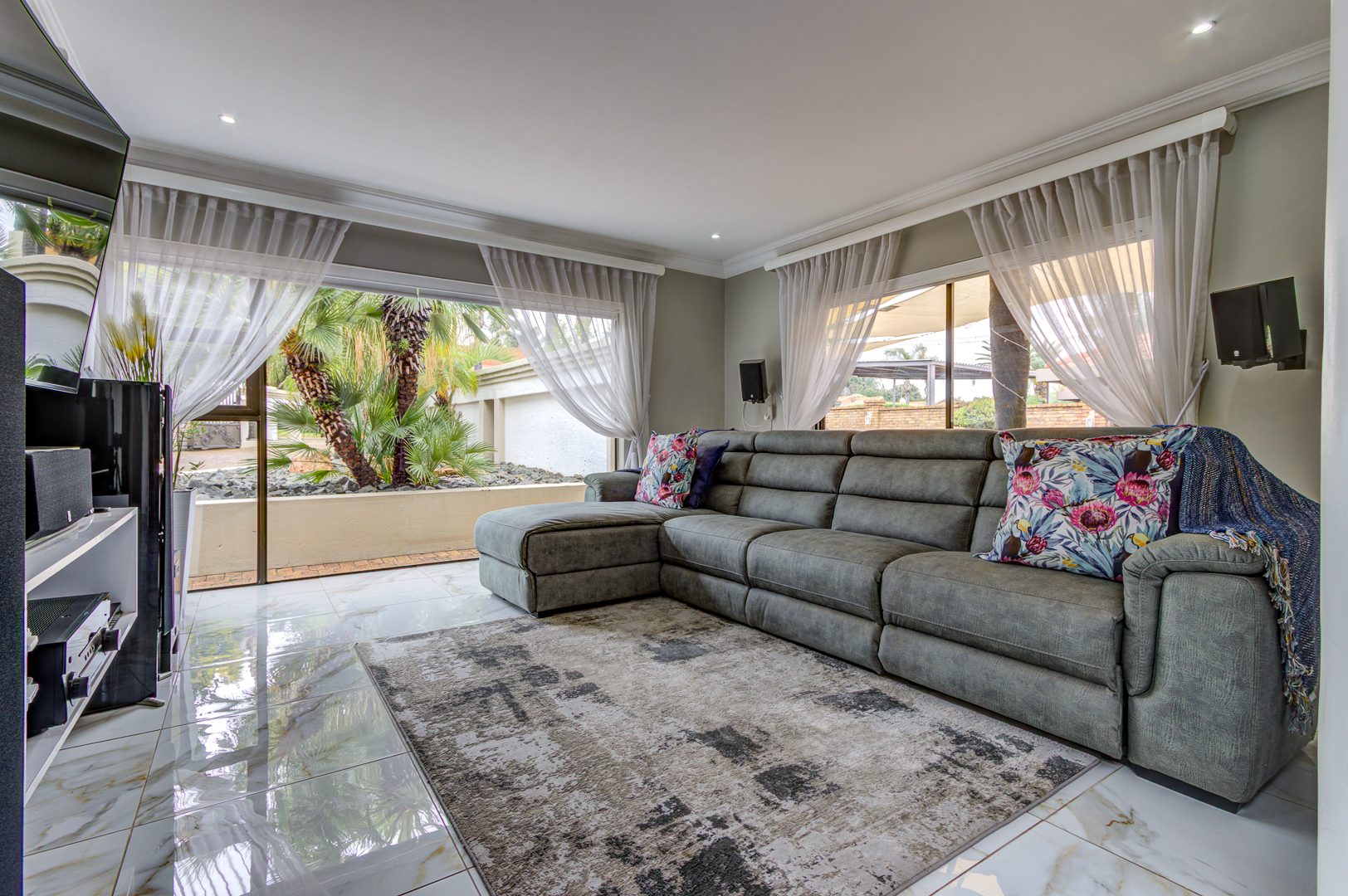 The lounge and TV room, also beautiful open spaces with the same elegant porcelain tile flowing throughout the entire home, a home that truly needs to be viewed for one to see and feel the incredible beauty.