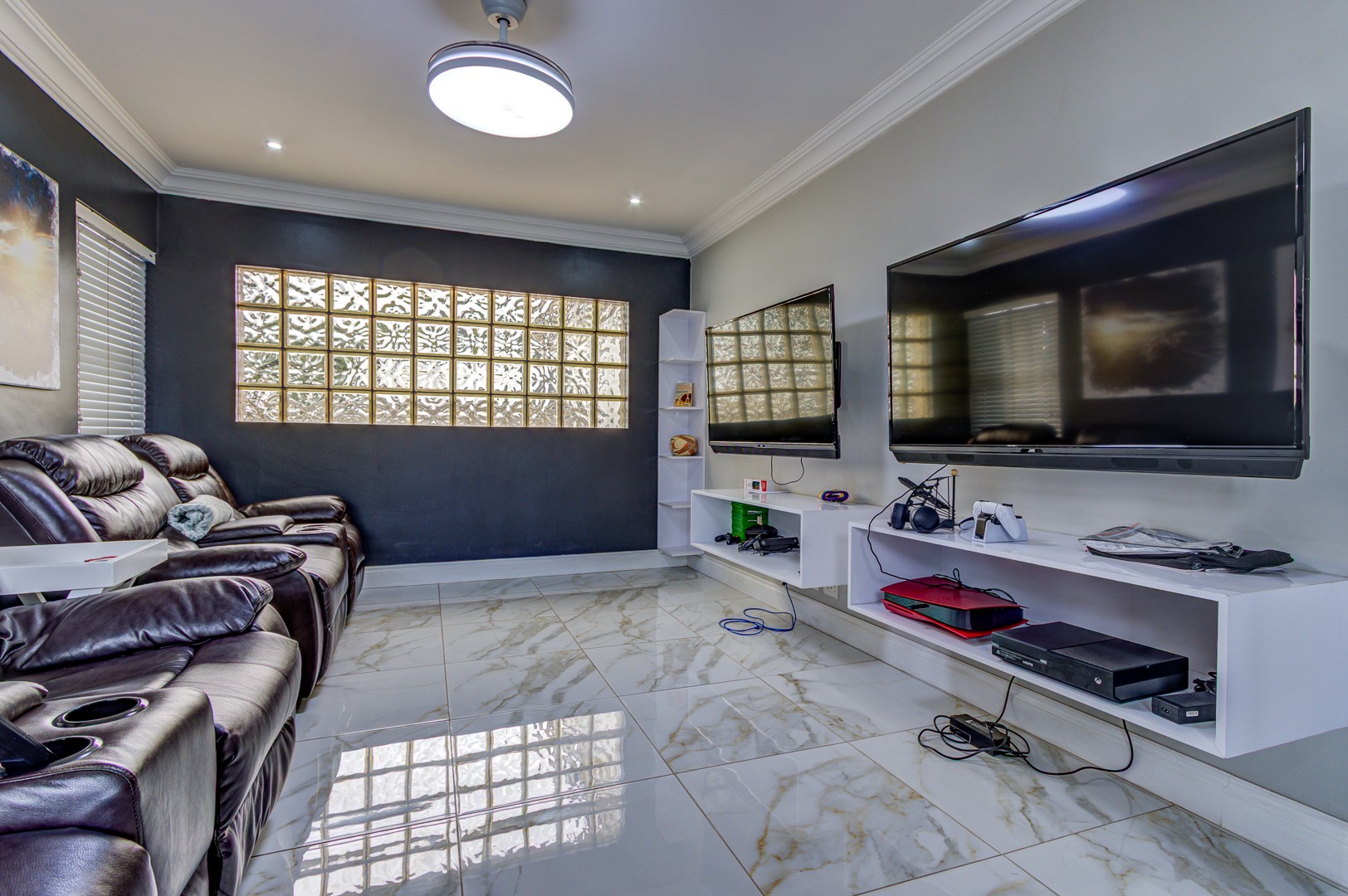 The gaming room... WOW.. with 2 x big screens, the perfect lighting for those gaming tournaments or even a great place to enjoy movie nights with loved ones.