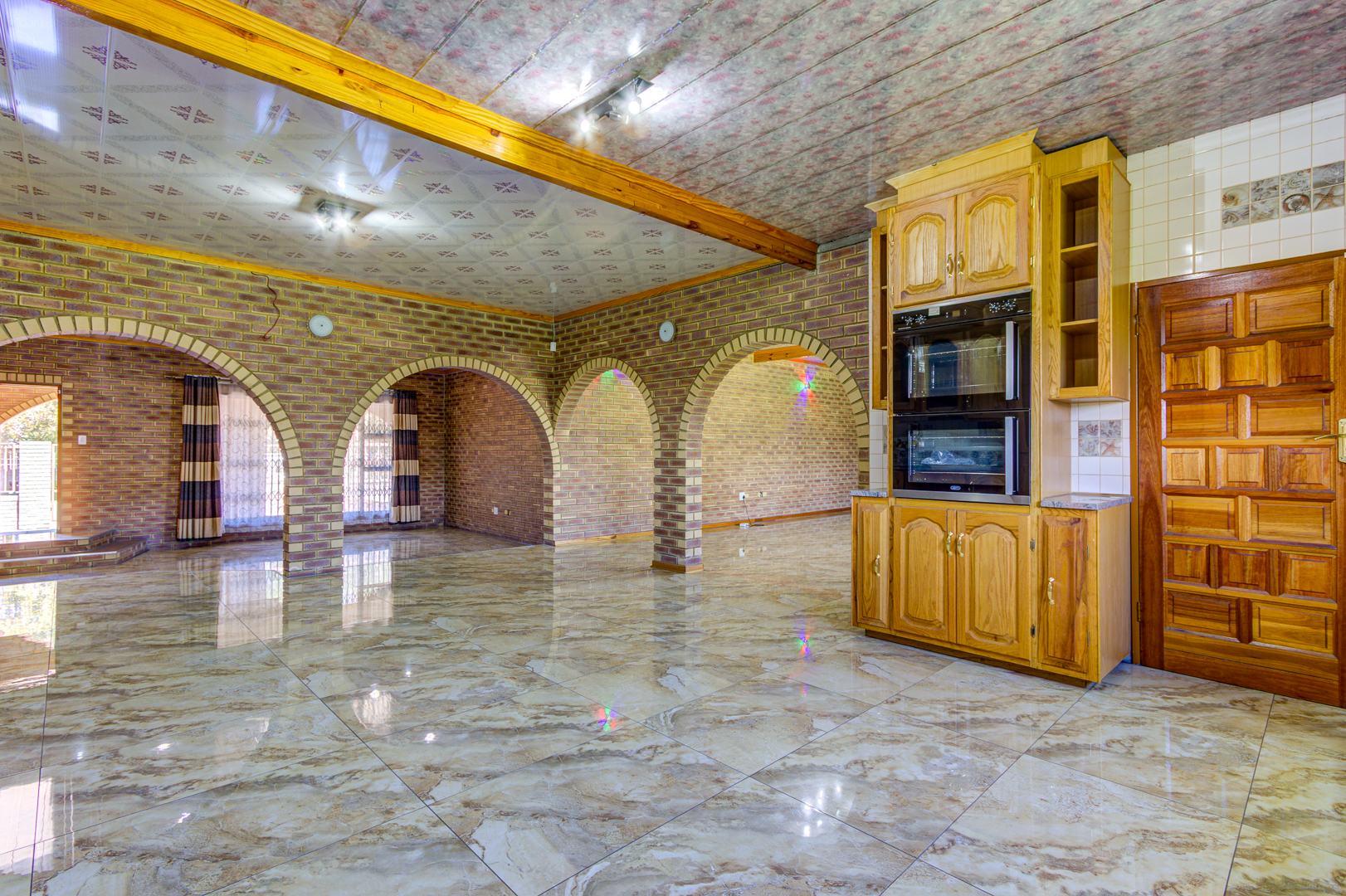 - Large open kitchen with oak wood cupboards, double electric oven and counter stove top
