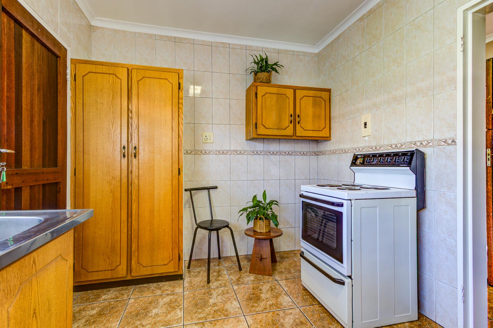 The kitchen is both practical and charming, featuring solid wood cabinetry and a convenient back door leading directly out to the garden, perfect for easy indoor-outdoor flow.