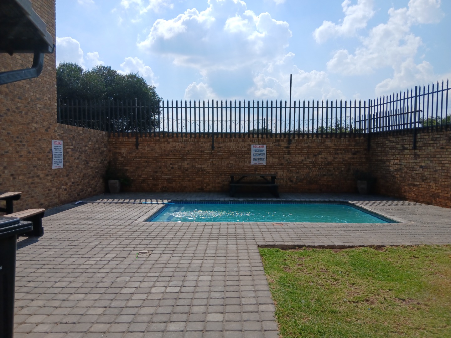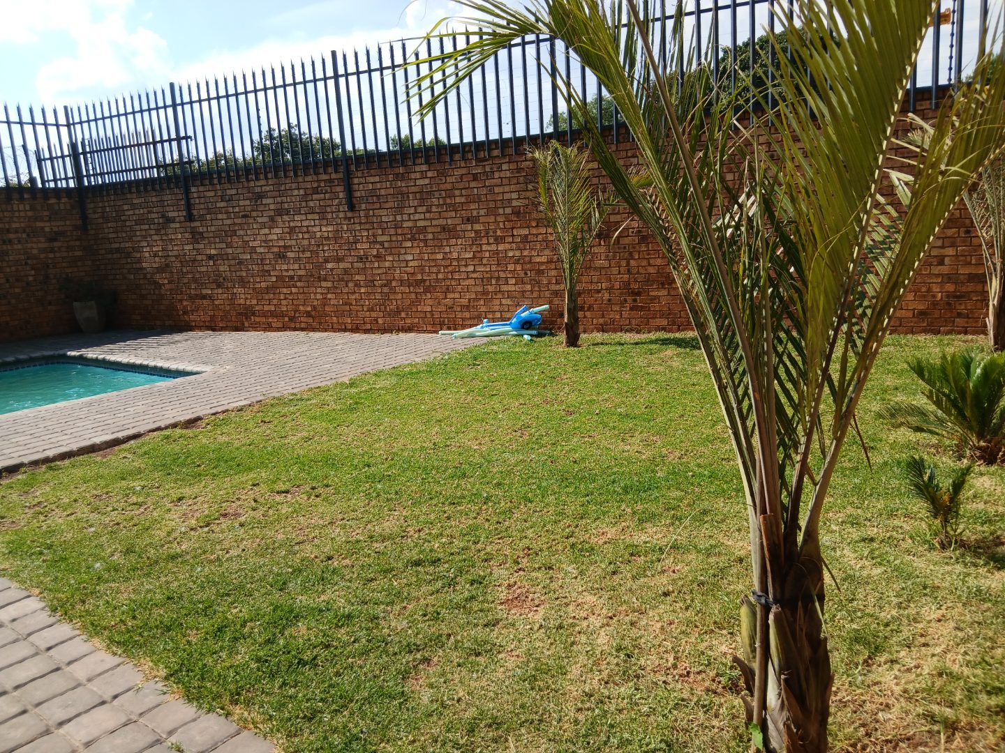 Step outside to discover a refreshing swimming pool, perfect for leisure and entertaining during warmer months. The property includes a single garage and two additional parking spaces, ensuring ample secure parking for residents and guests. The generous 3199 sqm erf size, largely paved, offers space and low maintenance within this residential setting.