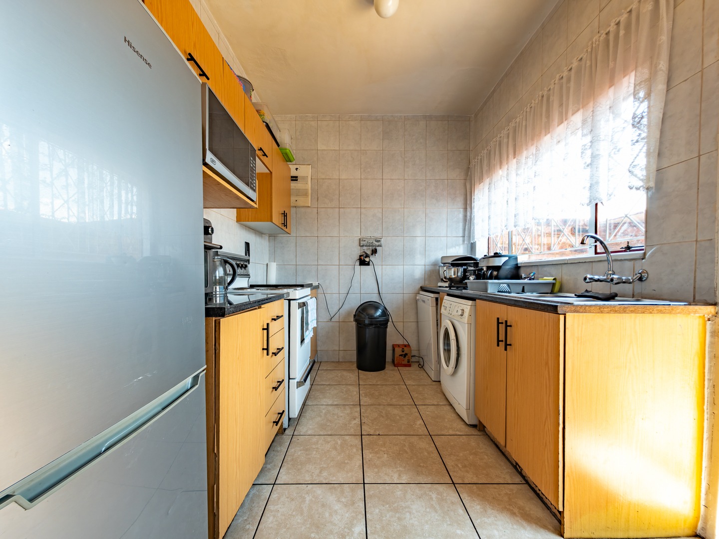 The sunny kitchen is thoughtfully designed with a double sink and plumbing for both a washing machine and dishwasher. It opens up to a spacious lounge and dining area, creating a warm and welcoming flow throughout.