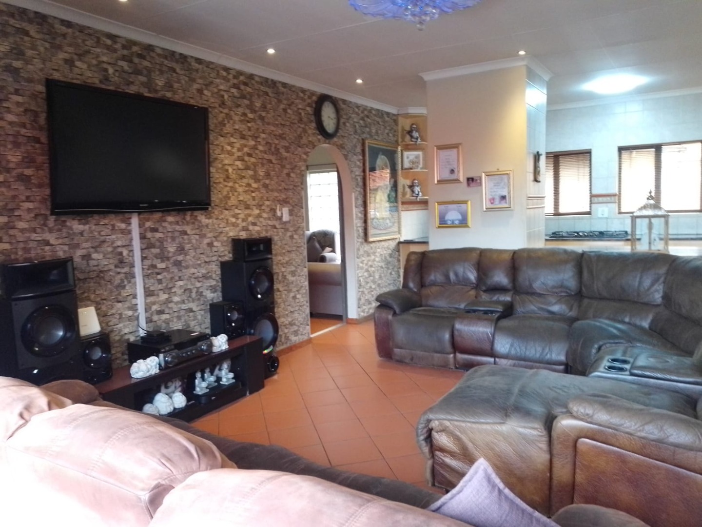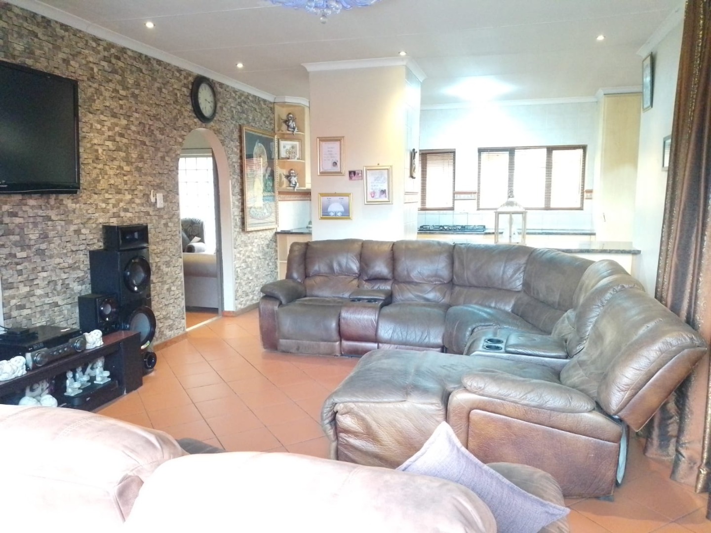 Enjoy both a small formal living room — ideal for quiet relaxation — and a large open-plan family lounge that flows seamlessly into the kitchen area. The kitchen includes a separate scullery and offers plenty of space for the heart of the home to thrive. The lounge opens onto a welcoming patio overlooking the sparkling swimming pool — perfect for entertaining or relaxing weekends with loved ones.