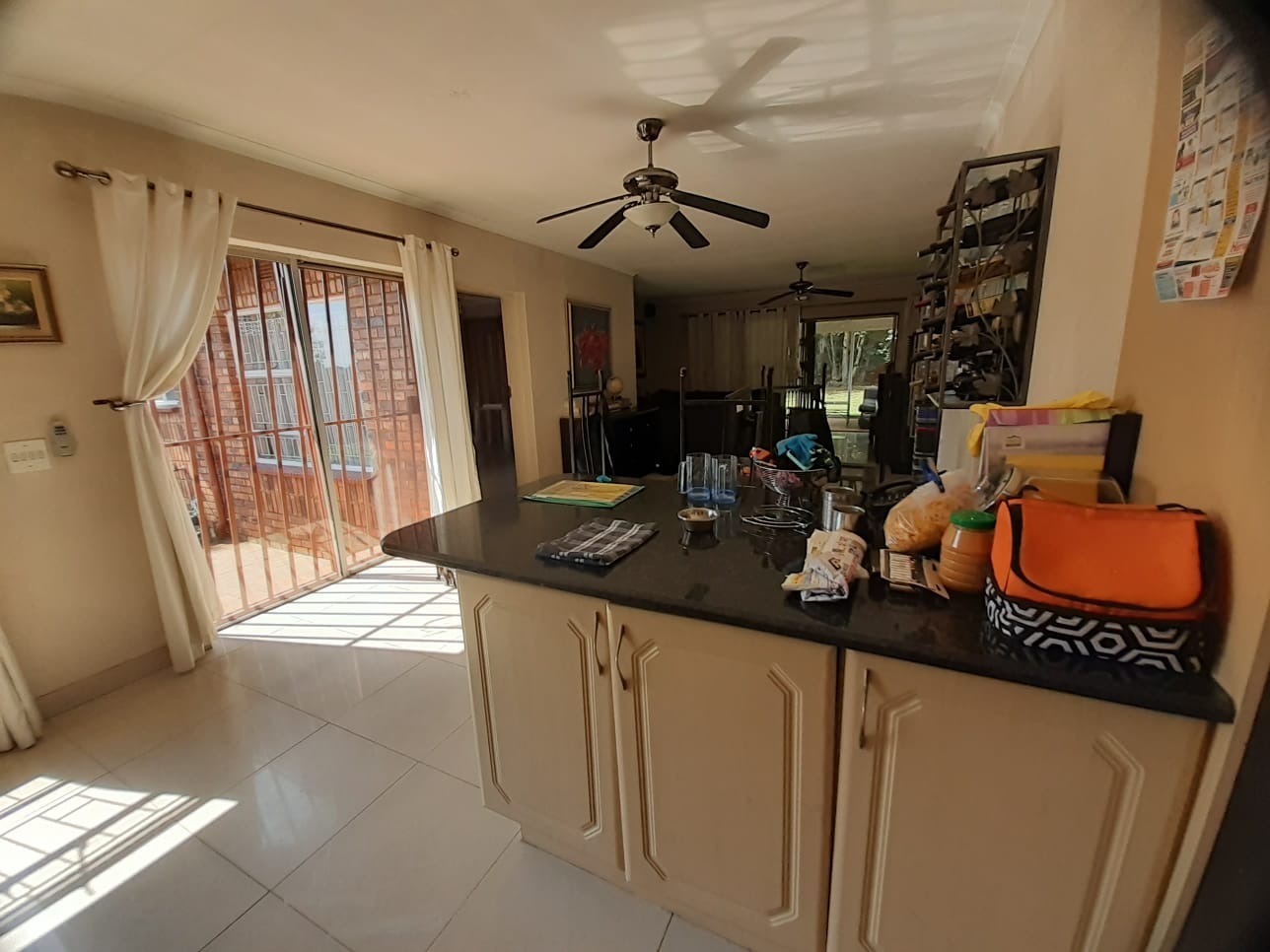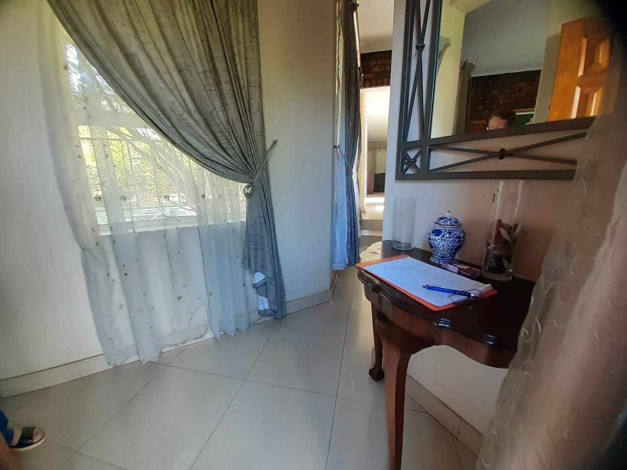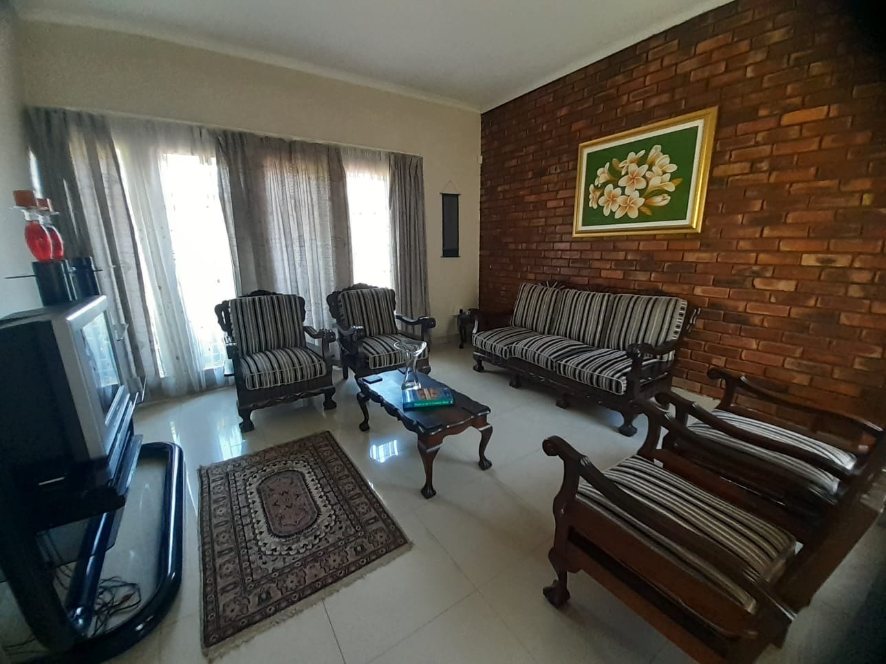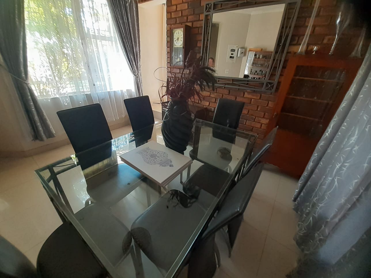 Step inside to find a well-appointed interior featuring tiled flooring throughout, ensuring easy maintenance. The home includes two spacious lounges and a dedicated dining room, providing versatile living areas for relaxation and entertaining. Natural light floods the rooms through large windows, highlighting characterful exposed brick accent walls in the living and dining spaces. The functional kitchen offers extensive light-colored cabinetry,granite tops, and built-in appliances including an oven, and gas hob.