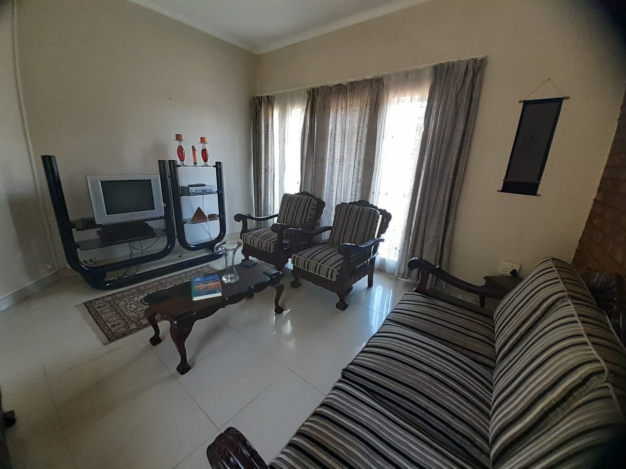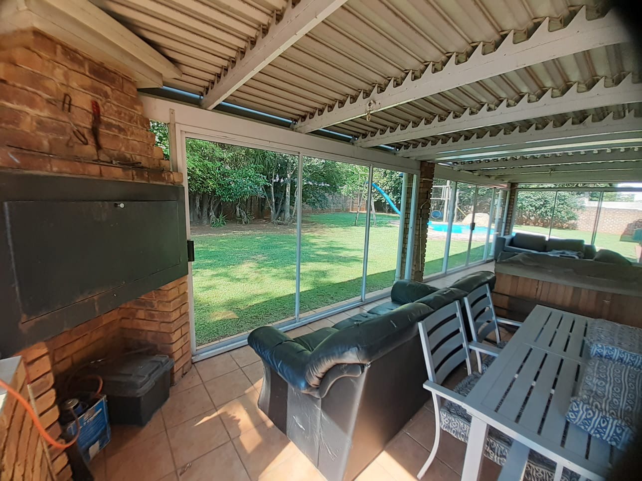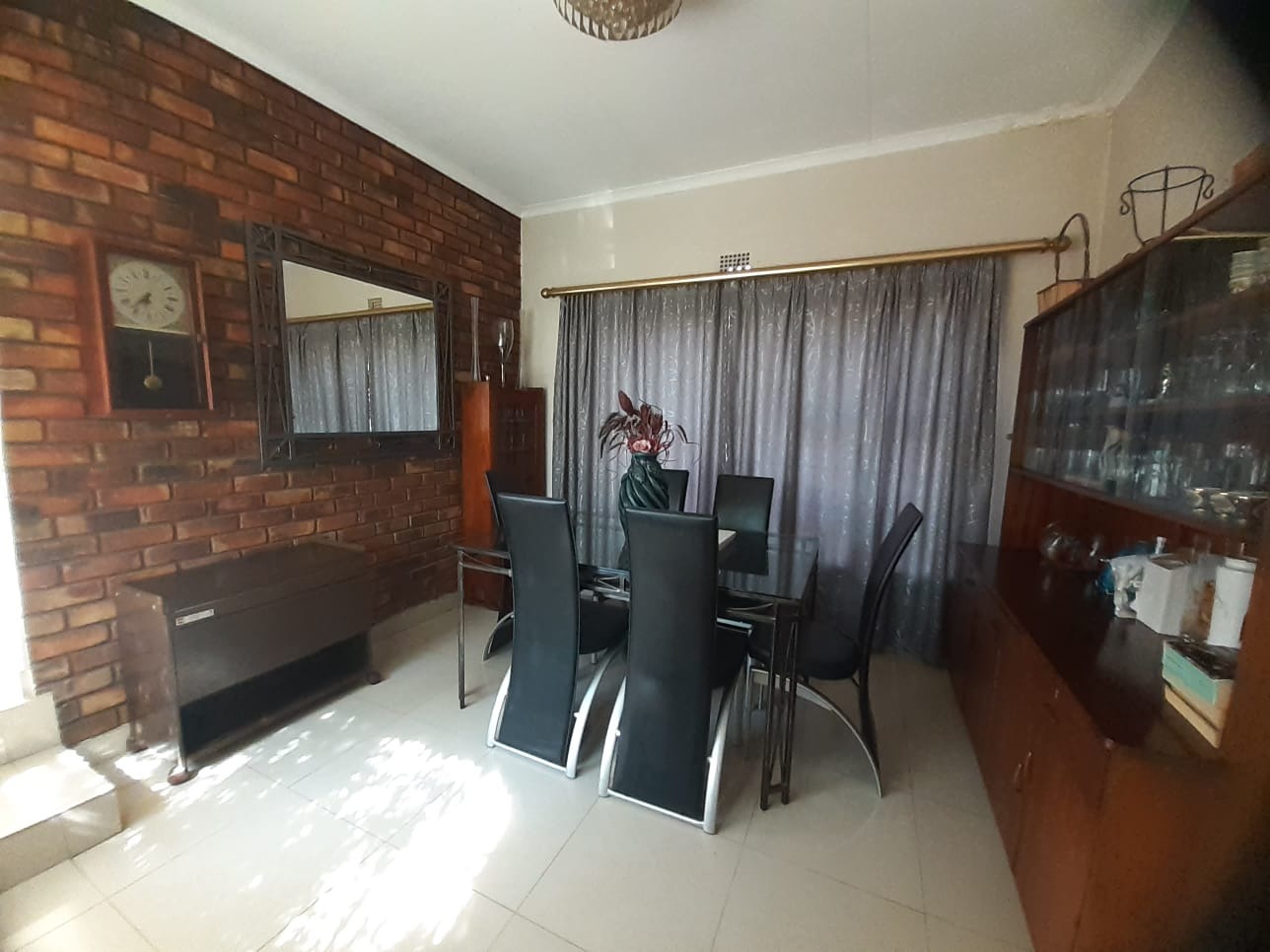 Step inside to find a well-appointed interior featuring tiled flooring throughout, ensuring easy maintenance. The home includes two spacious lounges and a dedicated dining room, providing versatile living areas for relaxation and entertaining. Natural light floods the rooms through large windows, highlighting characterful exposed brick accent walls in the living and dining spaces. The functional kitchen offers extensive light-colored cabinetry,granite tops, and built-in appliances including an oven, and gas hob.