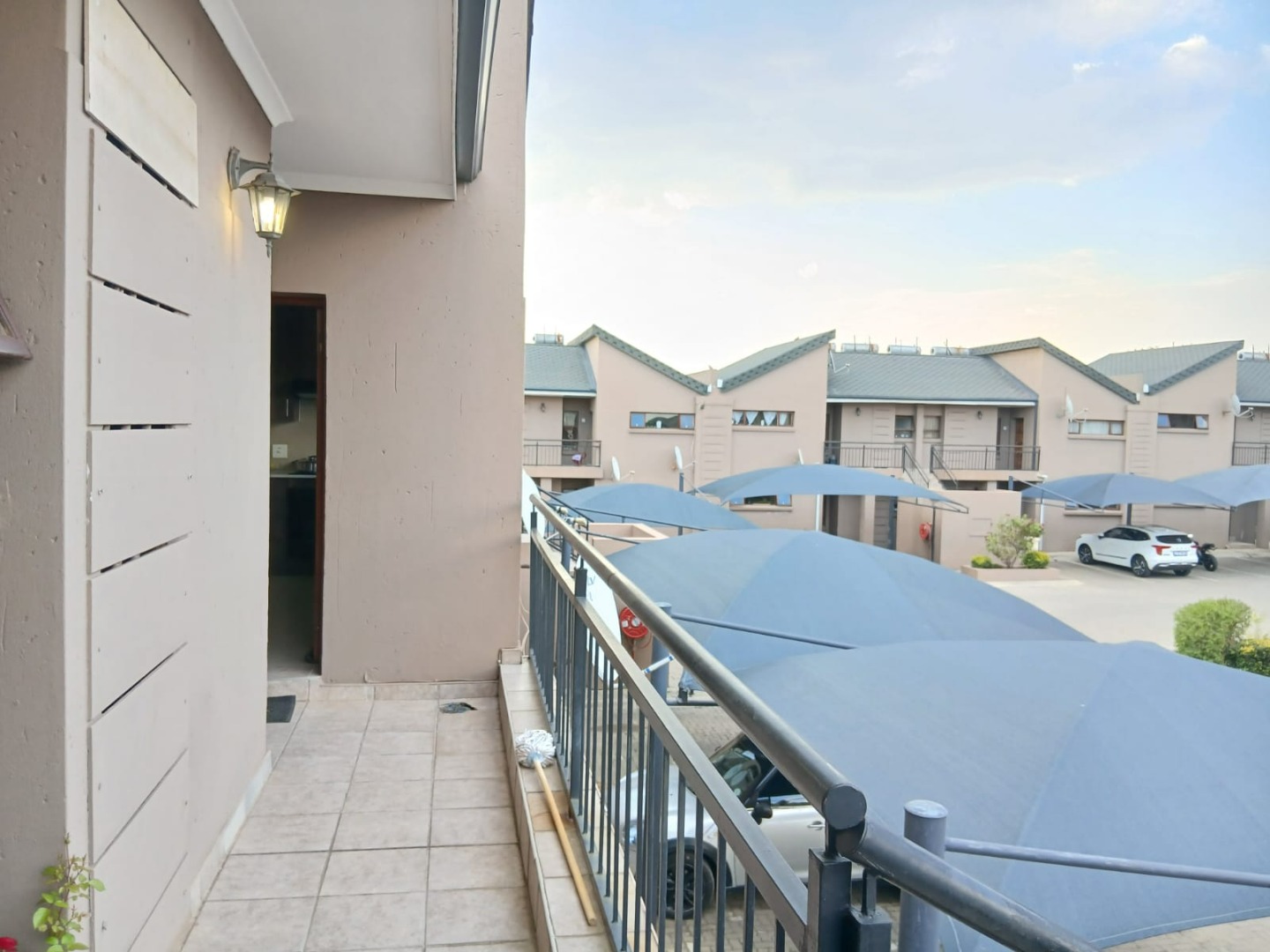Two well-proportioned bedrooms offer private retreats, serviced by a neat, modern bathroom. Step out onto your private balcony, featuring sturdy metal railings and a pleasant green view, ideal for relaxation. The property includes one dedicated parking space within the complex's ample covered parking facilities and paved common areas.