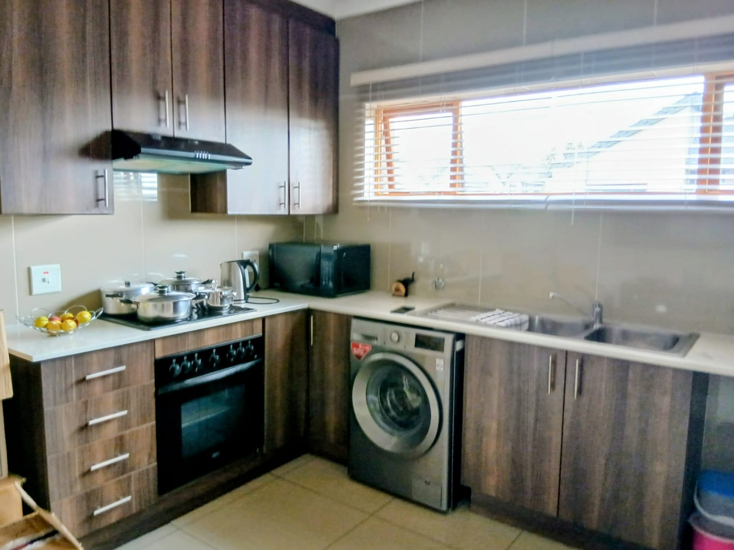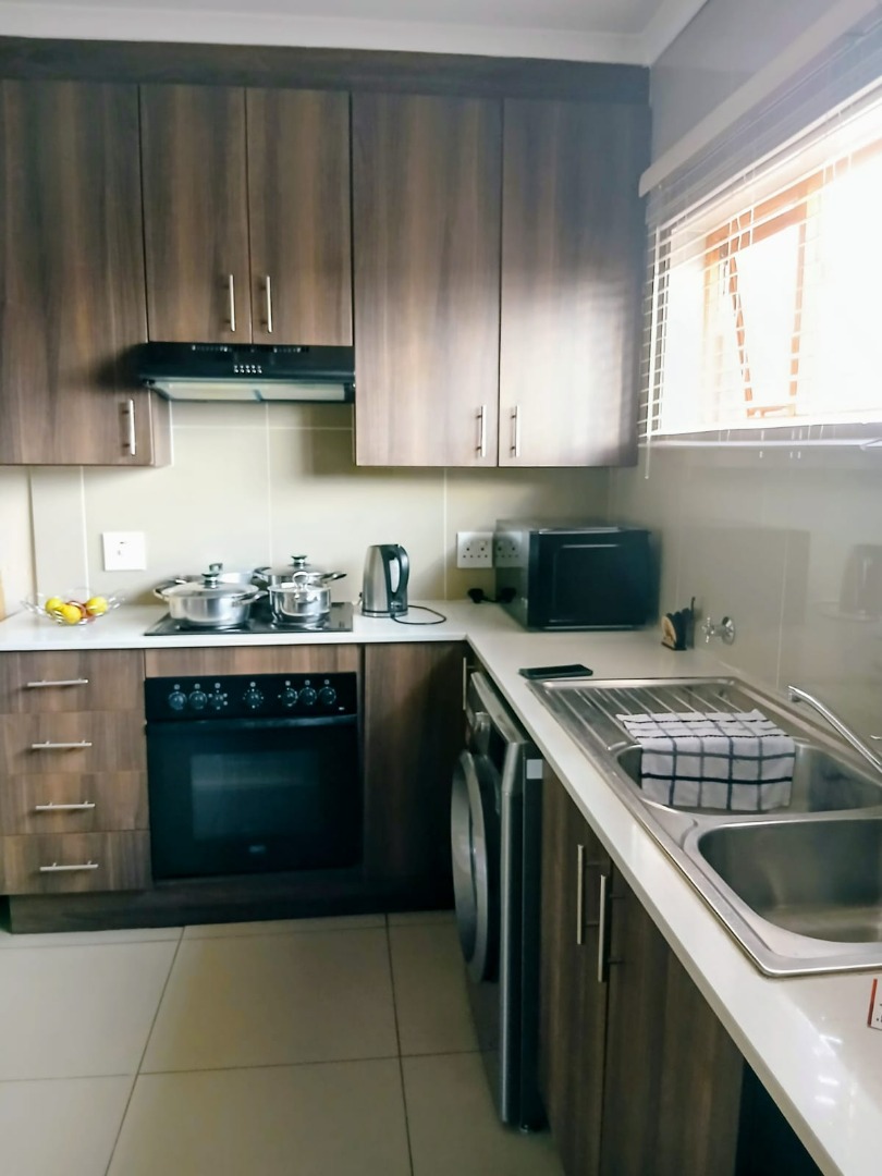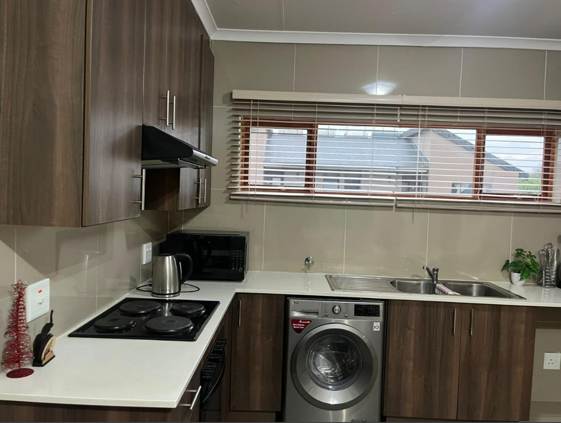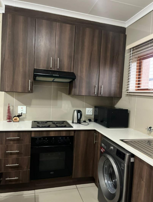 Discover modern living in this inviting 2-bedroom, 1-bathroom unit, spanning 58 sqm, located within a secure estate in Helderwyk, Brakpan. The residence features a comfortable open-plan layout, seamlessly connecting the lounge and dining areas, all adorned with durable tiled flooring. The contemporary kitchen boasts stylish dark wood-grain cabinetry, light countertops, and a tiled backsplash, well-equipped with an integrated oven, hob, extractor fan, and space for a washing machine.