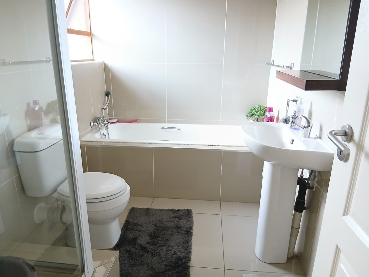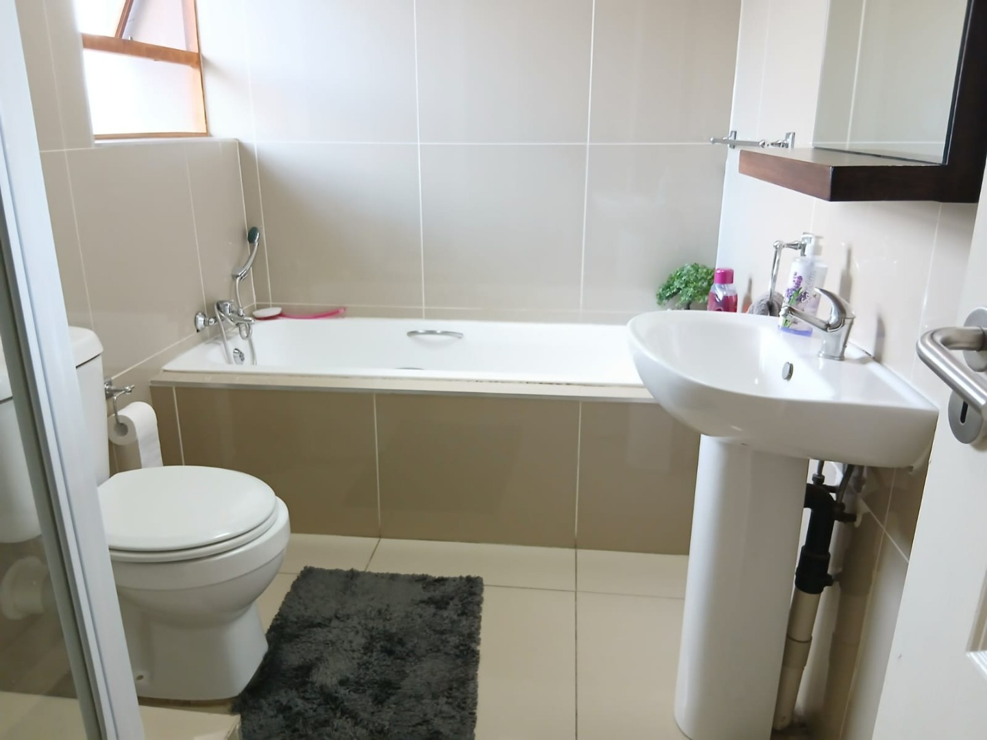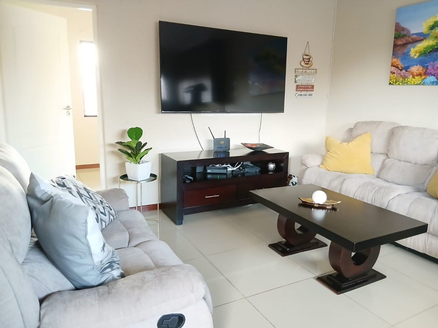 Discover modern living in this inviting 2-bedroom, 1-bathroom unit, spanning 58 sqm, located within a secure estate in Helderwyk, Brakpan. The residence features a comfortable open-plan layout, seamlessly connecting the lounge and dining areas, all adorned with durable tiled flooring. The contemporary kitchen boasts stylish dark wood-grain cabinetry, light countertops, and a tiled backsplash, well-equipped with an integrated oven, hob, extractor fan, and space for a washing machine.