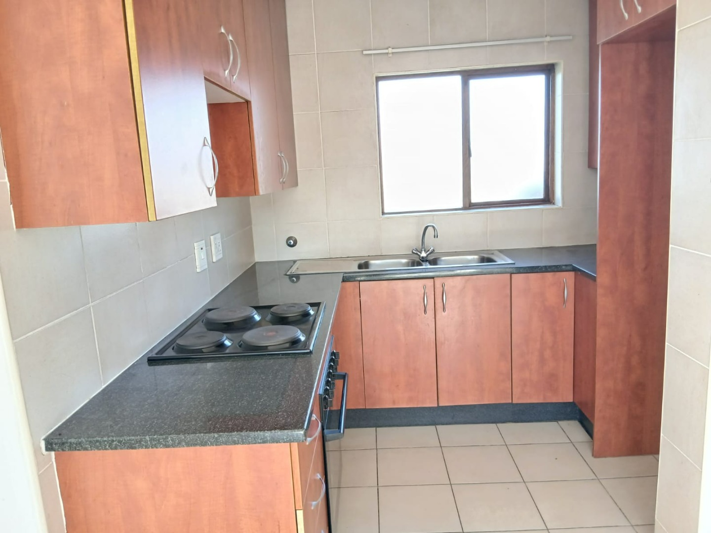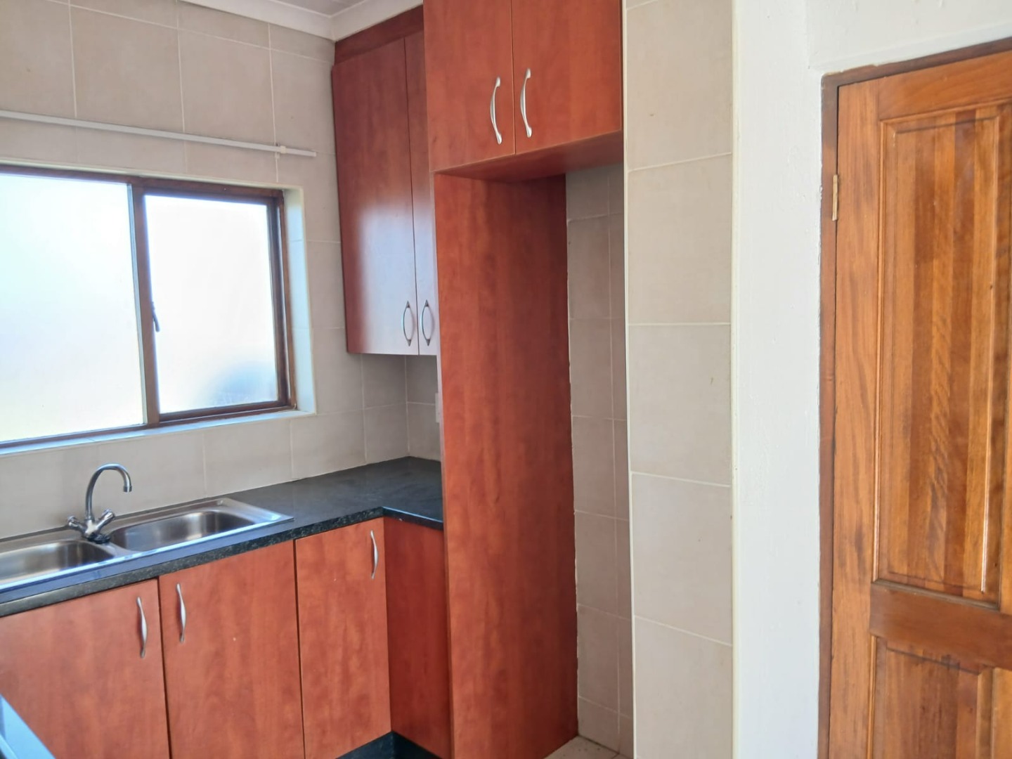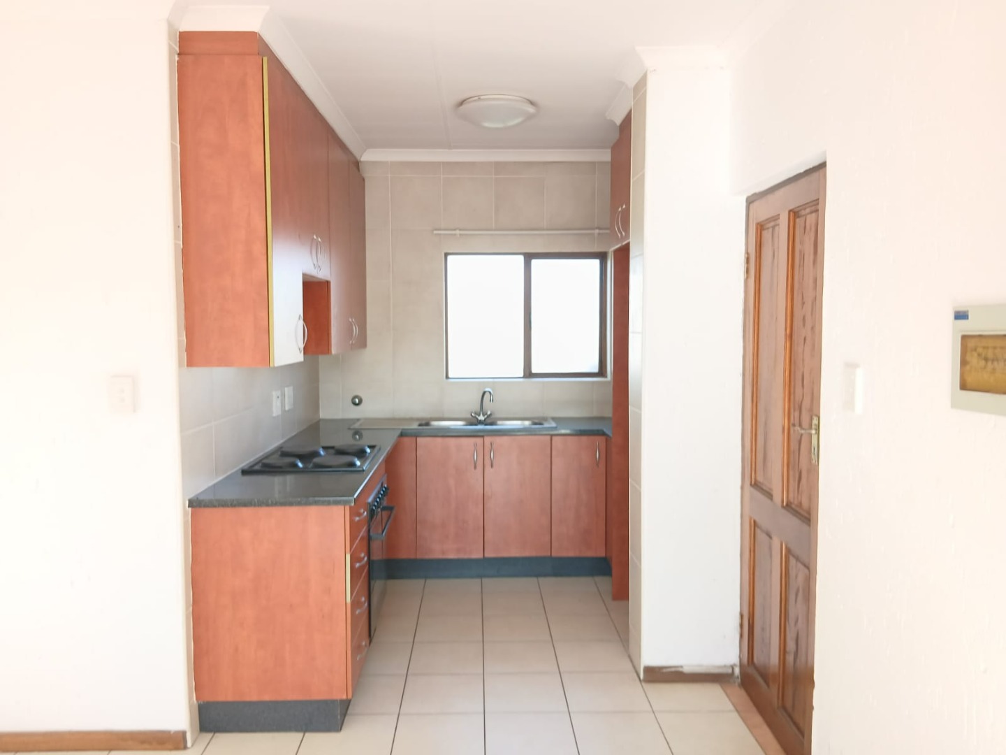 The open-plan lounge, featuring practical tiled flooring and abundant natural light, flows seamlessly into the functional kitchen. Here, you'll find wooden cabinetry with build in cupboards, providing a practical culinary environment.