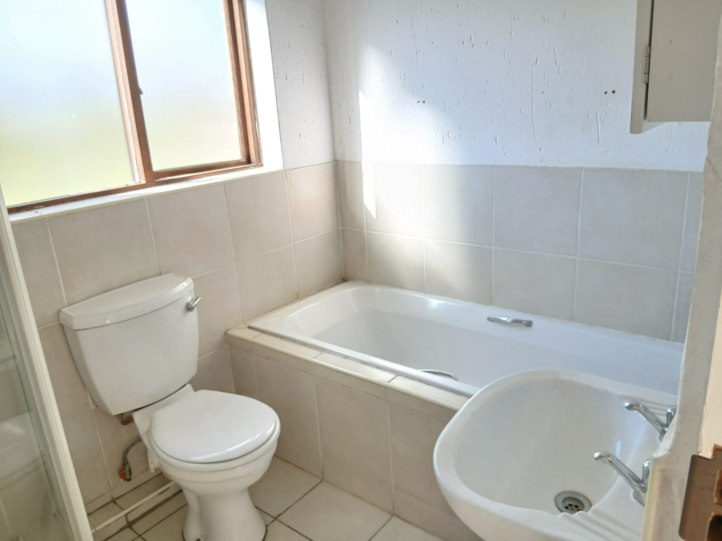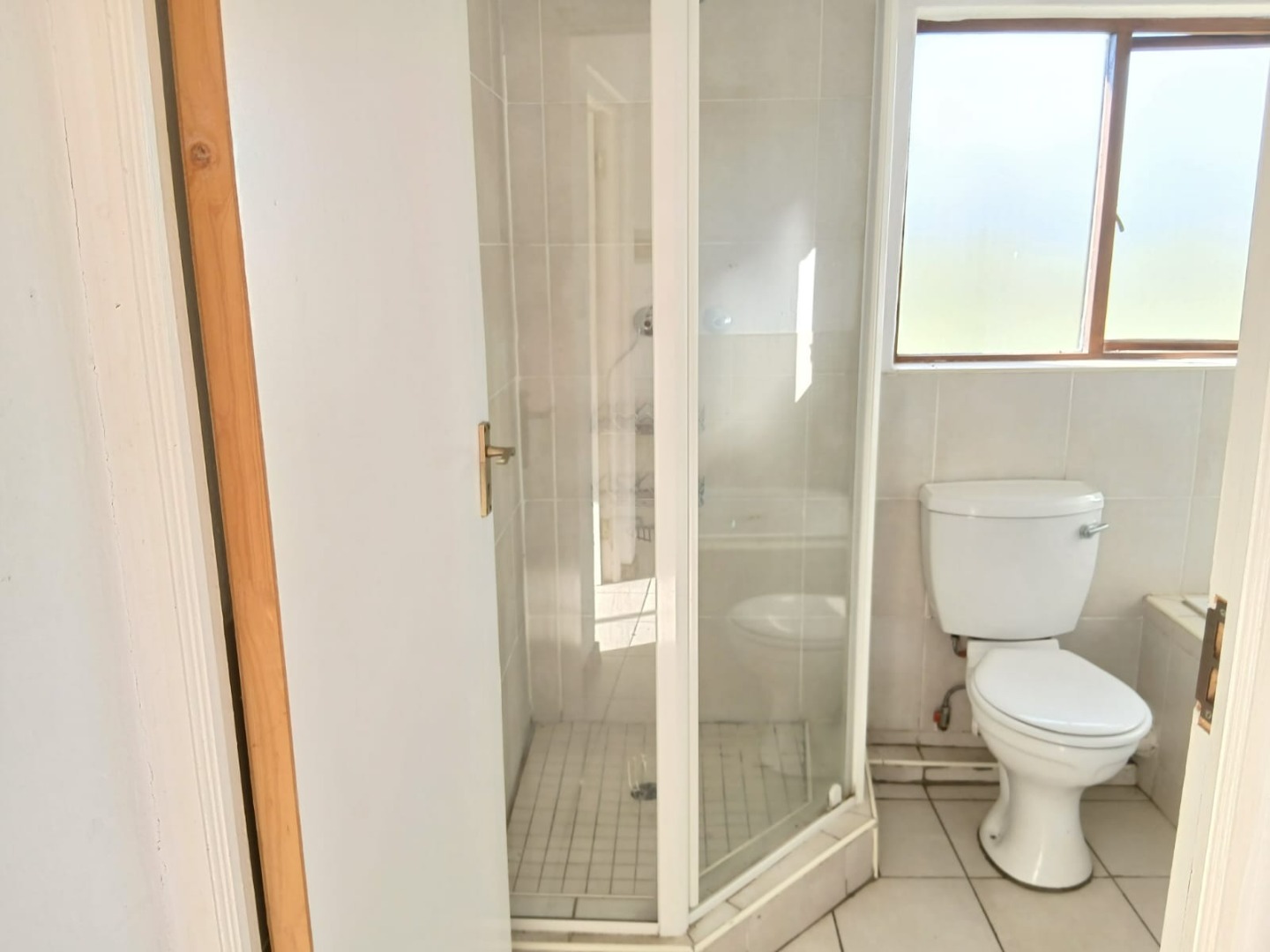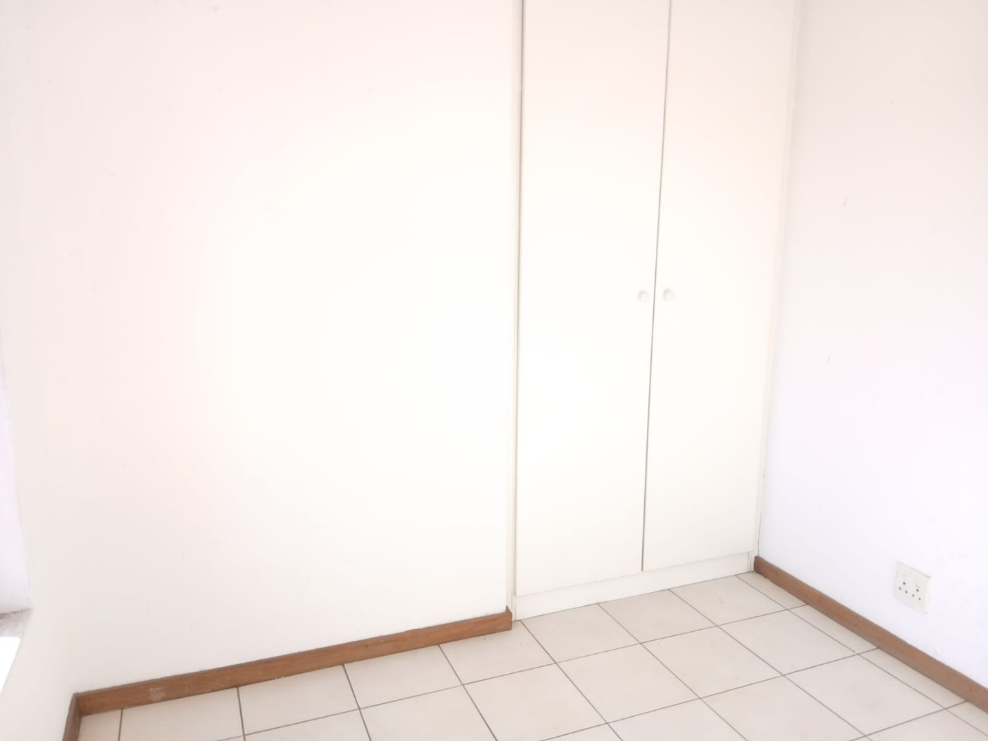 The open-plan lounge, featuring practical tiled flooring and abundant natural light, flows seamlessly into the functional kitchen. Here, you'll find wooden cabinetry with build in cupboards, providing a practical culinary environment.