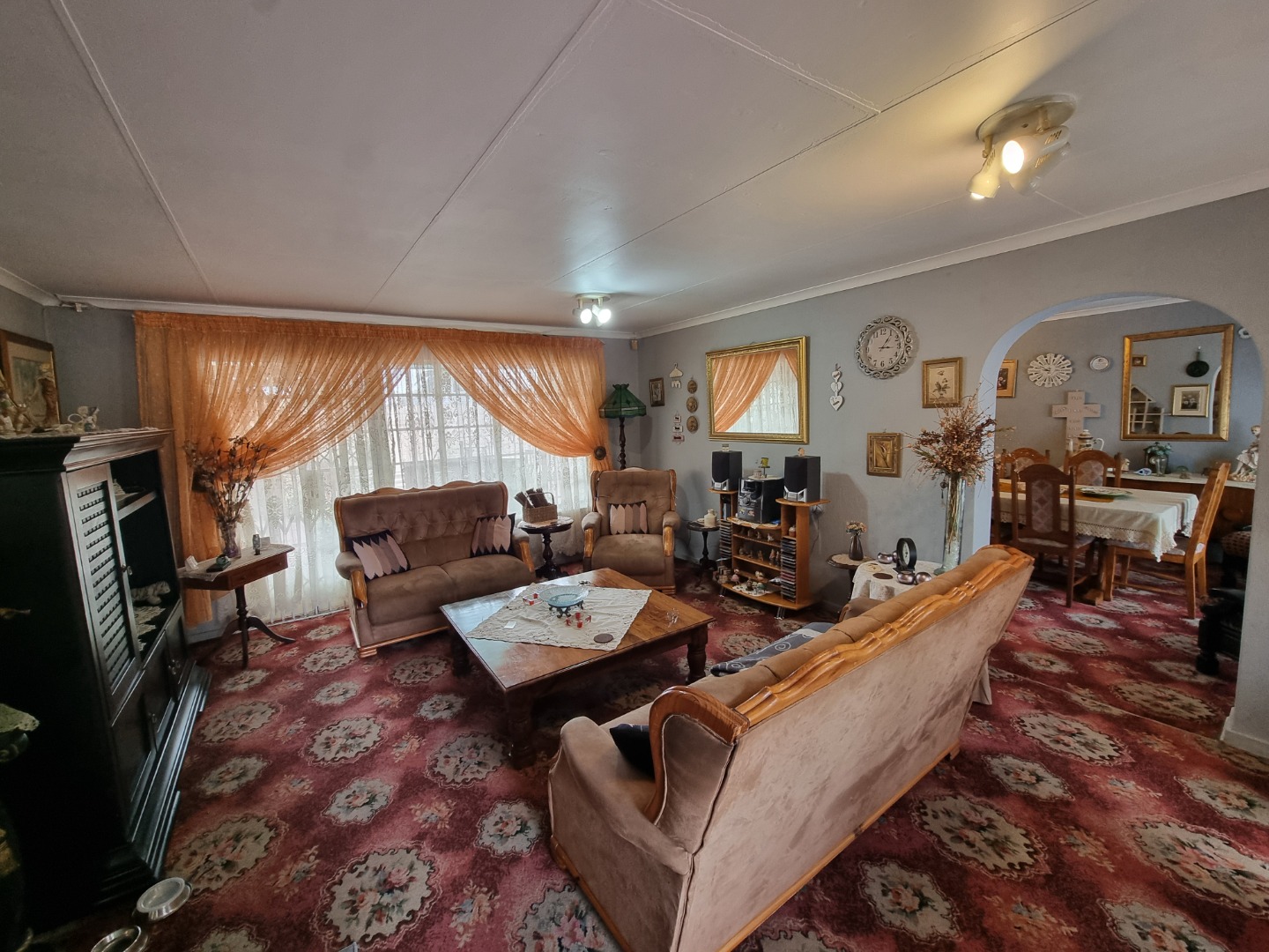 Step inside to find generous living spaces designed for comfort. The spacious living room offers multiple seating options and is bathed in natural light, flowing seamlessly into a defined dining area through an elegant archway. This home provides ample room for both relaxation and entertaining. The functional kitchen features an L-shaped layout with ample vintage-style cabinetry and generous counter space, providing plenty of storage and preparation areas, complete with a built-in stovetop.
