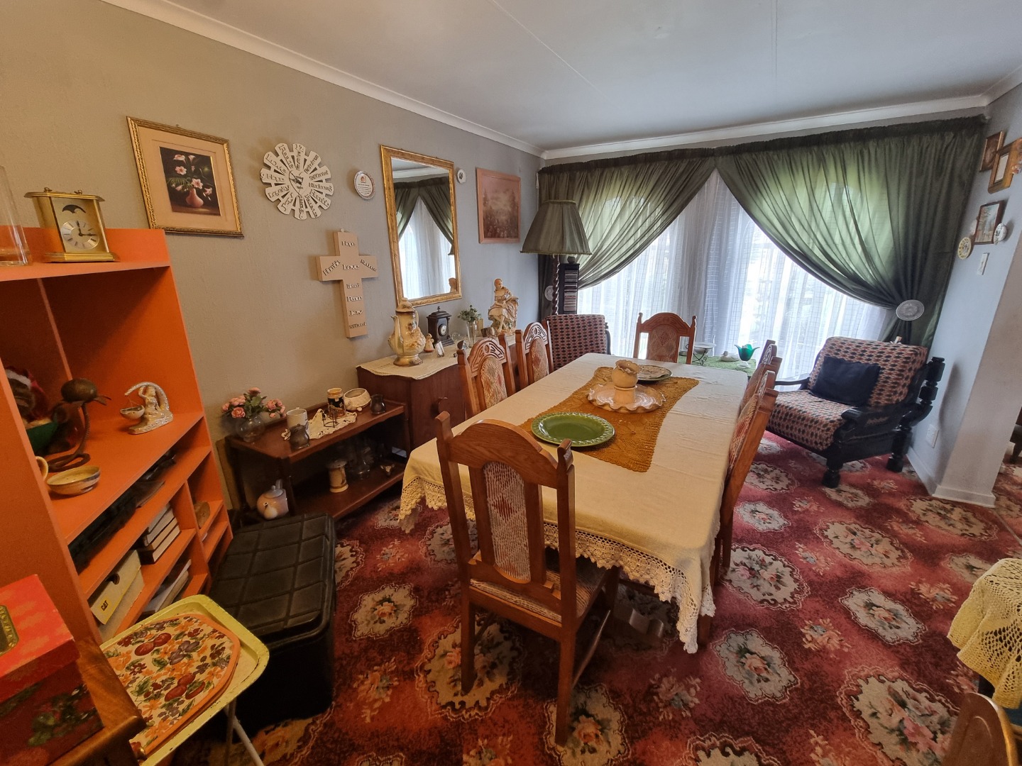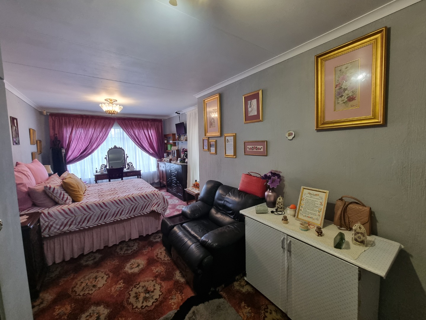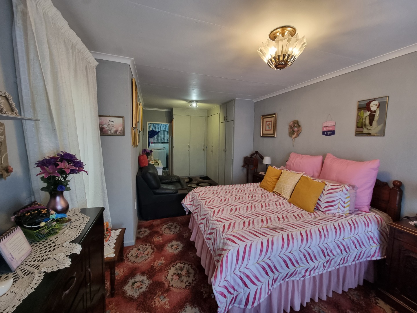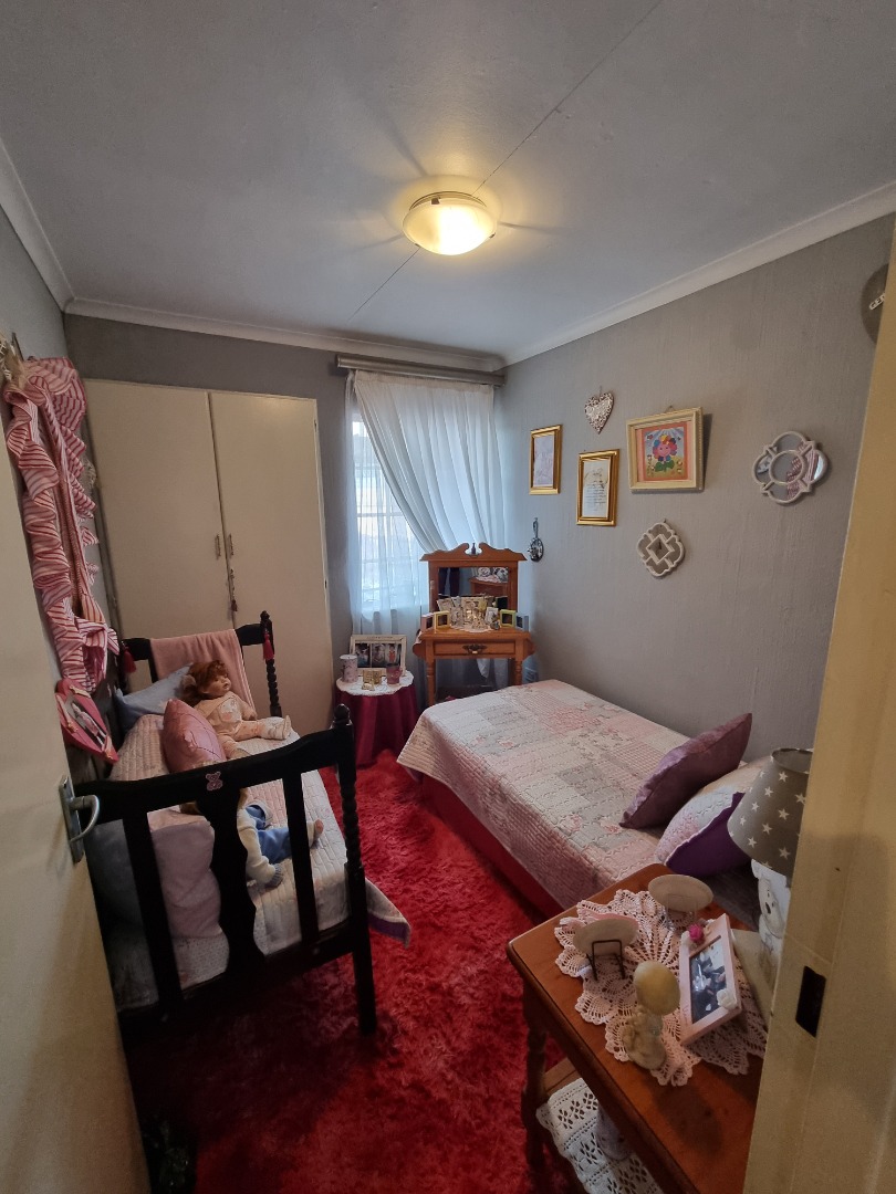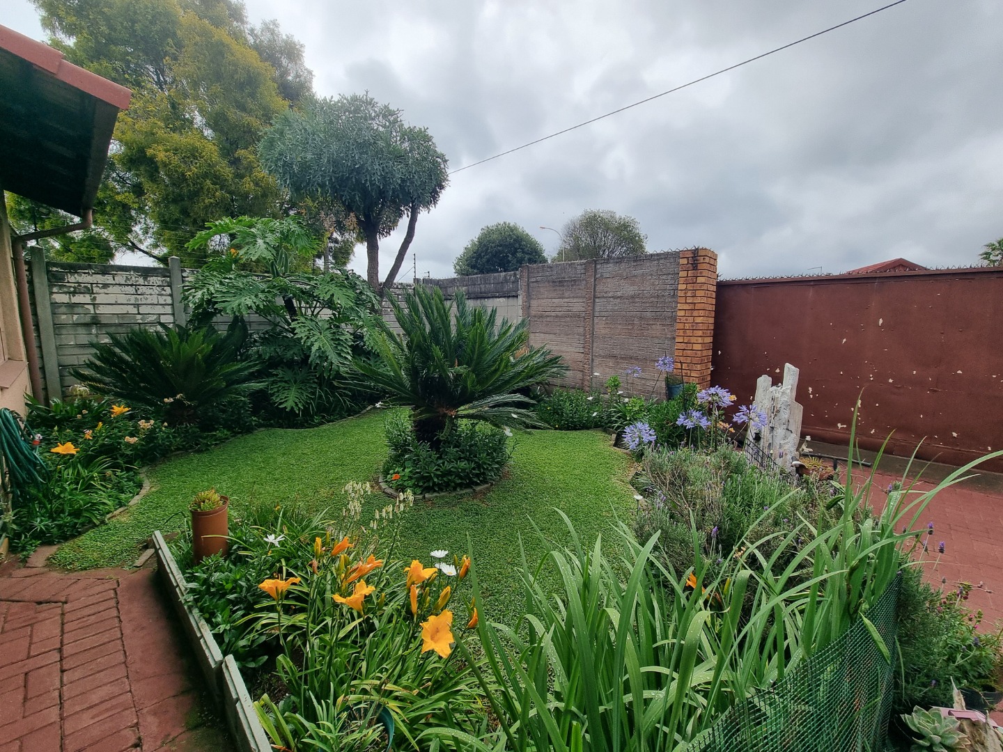 Discover this charming 3-bedroom, 2-bathroom family home nestled in a peaceful cul-de-sac within the suburban area of Huntingdon, Brakpan, South Africa. The property immediately impresses with its well-maintained front yard, featuring lush landscaping, a decorative fountain, and a red brick paved driveway leading to a secure front entrance. The exterior boasts a classic tiled roof and character-filled arched windows, creating a welcoming first impression on its 376 sqm erf.