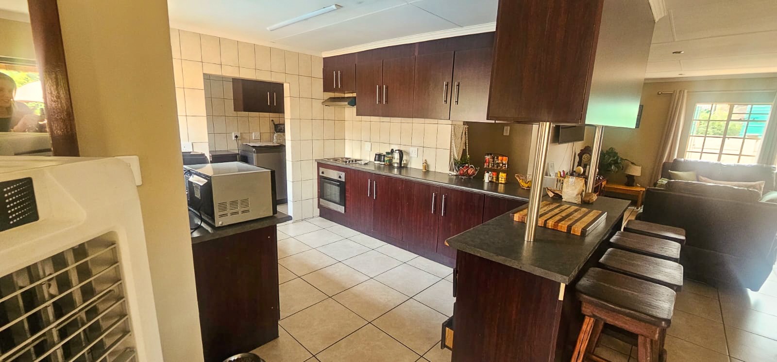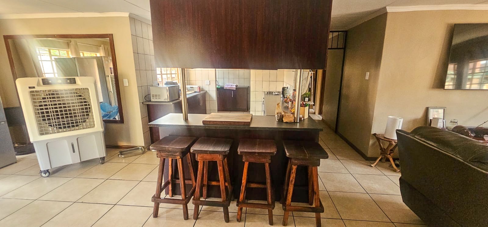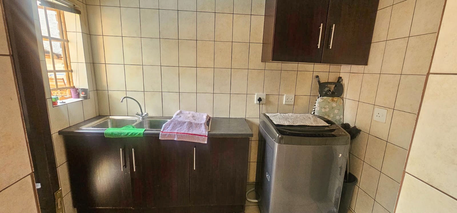 Discover this inviting 3-bedroom, 2-bathroom residence in Bronkhorstspruit. The home features an open-plan layout, seamlessly connecting the kitchen and living areas. The kitchen boasts dark wooden cabinetry, a practical island with seating, and integrated oven and hob, all set on durable tiled flooring. Sliding doors enhance the flow, leading to a spacious, naturally lit living area. A dedicated utility area, complete with a sink and washing machine, adds to the home's functionality.
