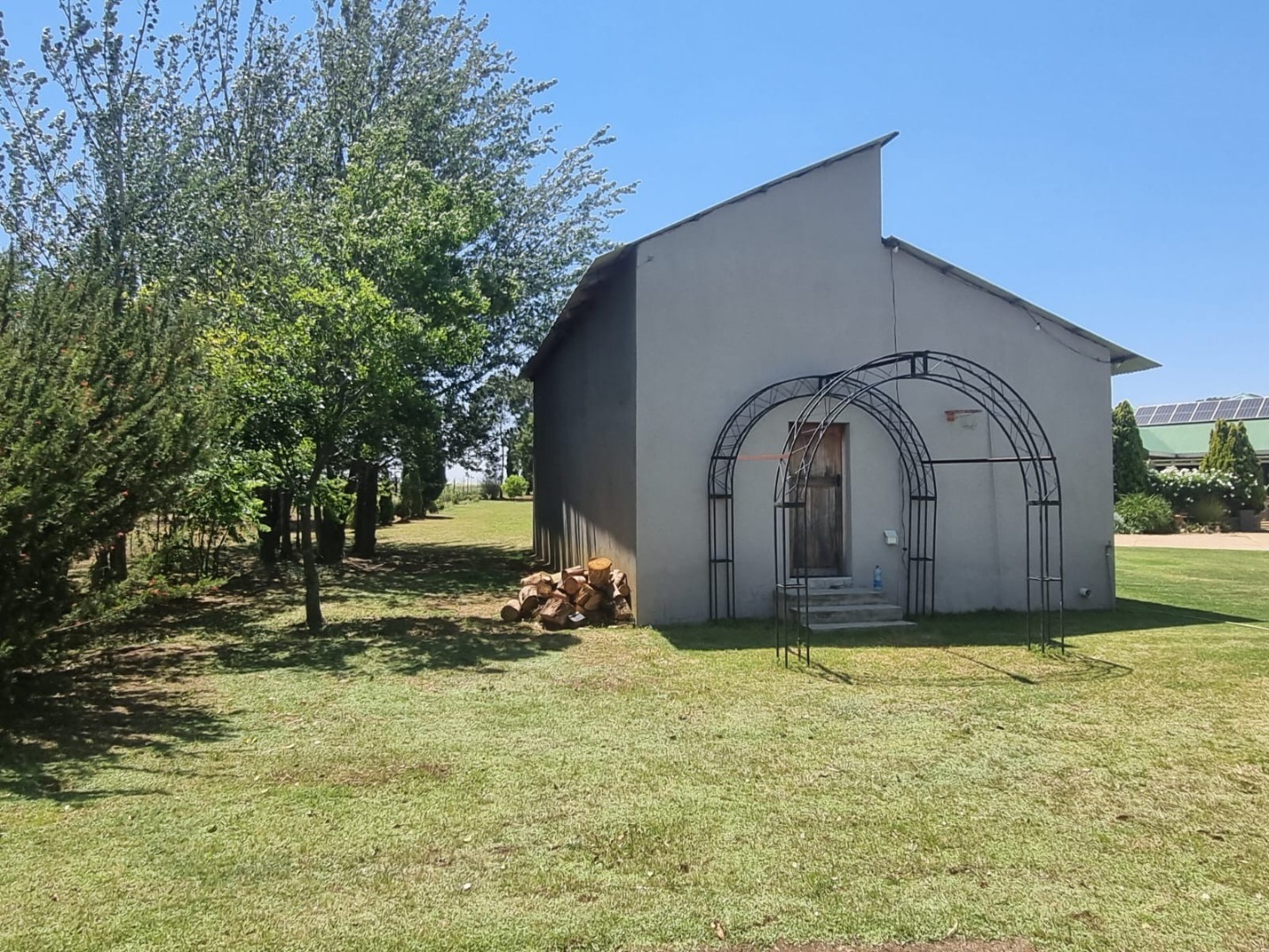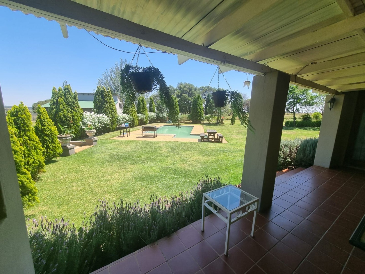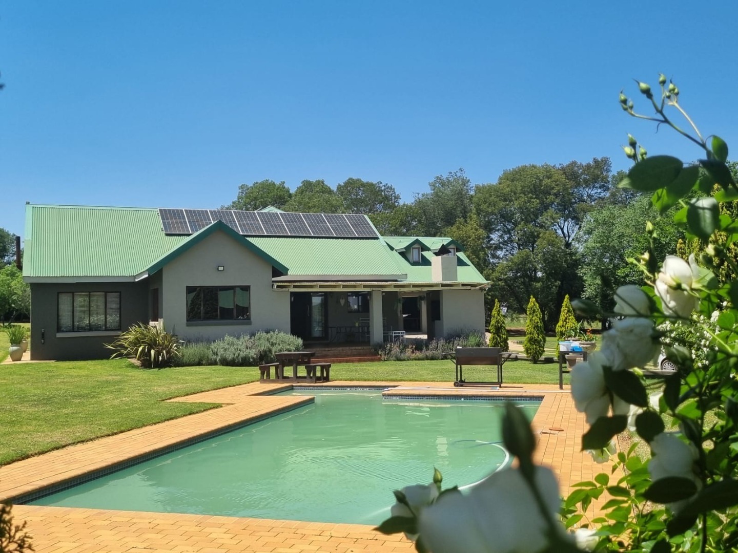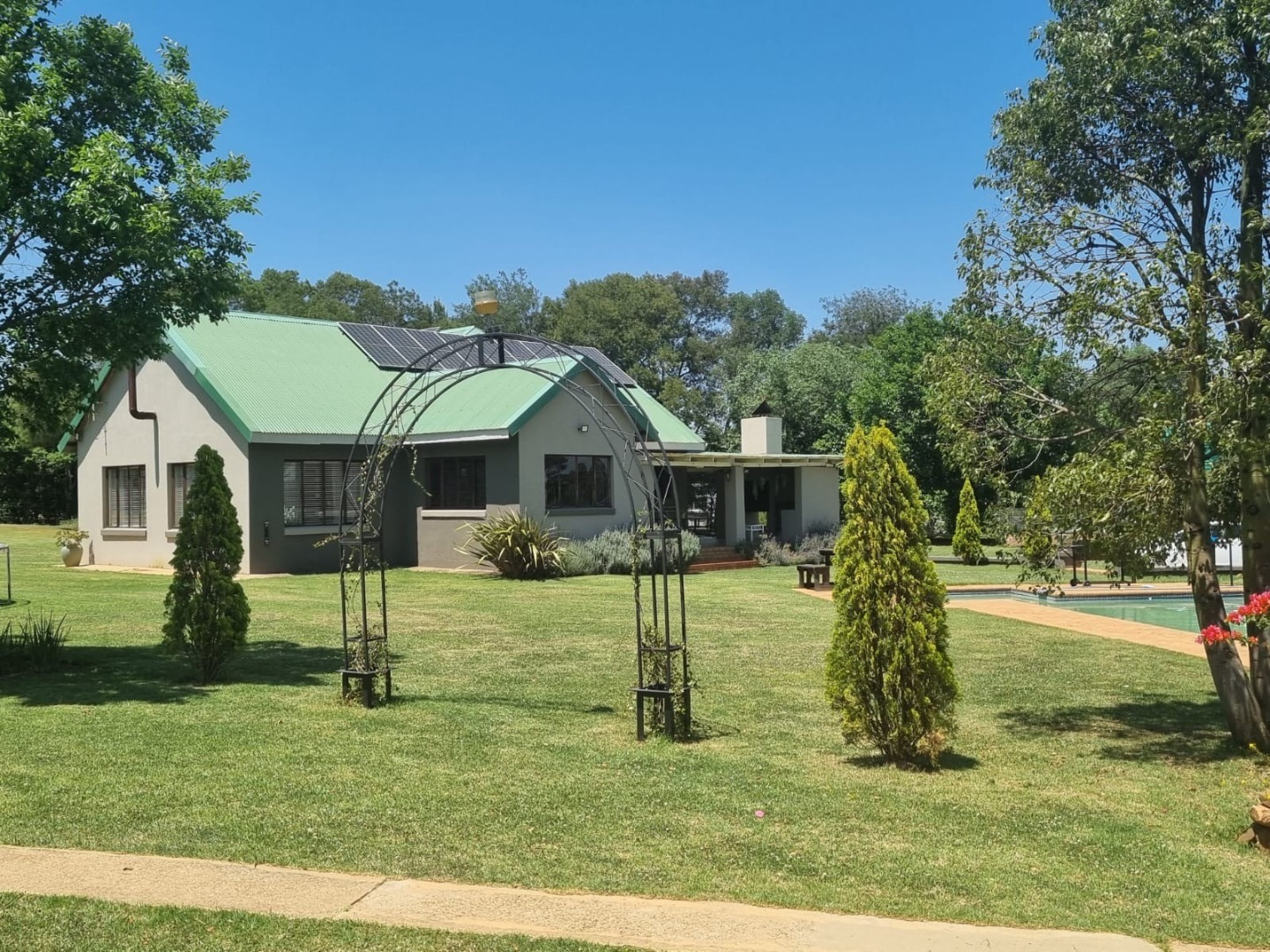 Discover this expansive lifestyle farm property located in Nestpark AH, Bronkhorstspruit, offering a blend of spacious living and outdoor amenities. This substantial residence spans 579.00 sqm on a generous 22000.00 sqm erf, providing ample room for comfortable family life and entertaining. The interior features a well-appointed layout with four bedrooms and three bathrooms, complemented by a convenient guest toilet. The home includes a dedicated study, a welcoming entrance hall, a spacious lounge, and a dining room, all designed with an open-plan flow. Practical elements such as a pantry, laundry room, wood ceilings, and special lighting enhance the living experience. Step outside to embrace the impressive outdoor offerings. The property boasts a private swimming pool, perfect for relaxation and recreation. An inviting covered patio with a built-in braai provides an ideal setting for outdoor dining and social gatherings. With two garages and six additional parking spaces, including a driveway, there is abundant secure parking for residents and guests. The large, well-maintained grounds feature mature trees, creating a serene and private environment. Security is well-addressed with an alarm system, access gate, and a totally walled perimeter, ensuring peace of mind. The property also benefits from a borehole and water tanks, contributing to water resilience. This lifestyle farm offers a unique opportunity for those seeking a spacious home with extensive outdoor features in a tranquil setting. Key Features: * 4 Bedrooms, 3 Bathrooms * Guest Toilet & Study * Lounge, Dining Room, Kitchen, Pantry * Private Swimming Pool * Covered Patio with Built-in Braai * 2 Garages, 6 Parking Spaces * Borehole & Water Tanks * Alarm System & Access Gate * Totally Walled Property * Wood Ceilings & Special Lights