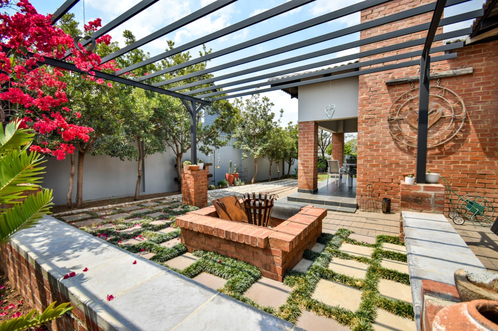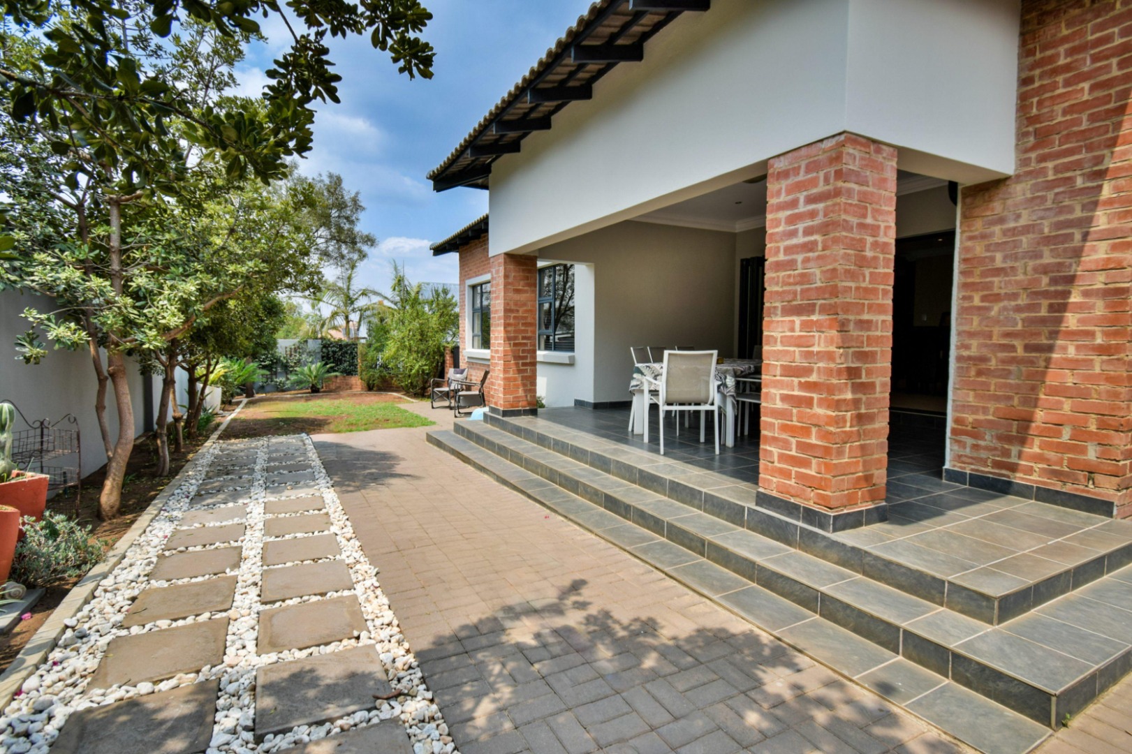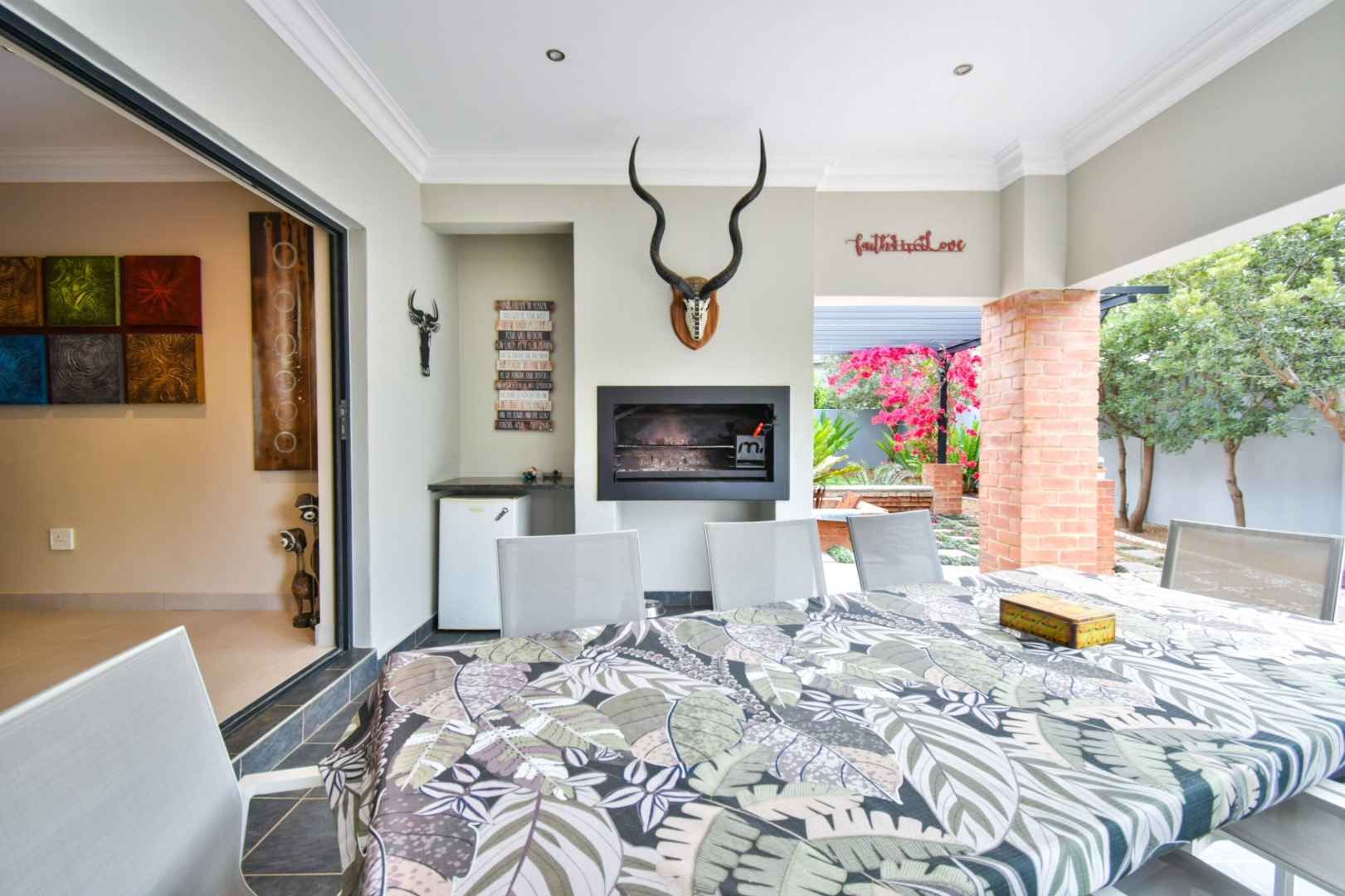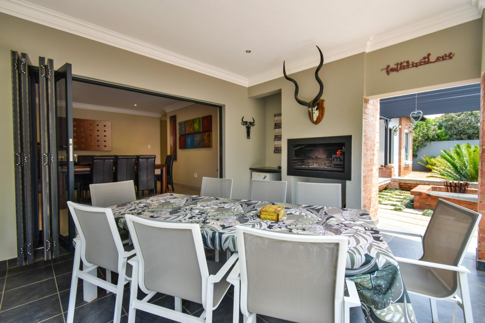 The stackable doors open up to a covered patio with a built-in braai, creating the perfect entertainment space overlooking the beautifully landscaped wrap-around garden.