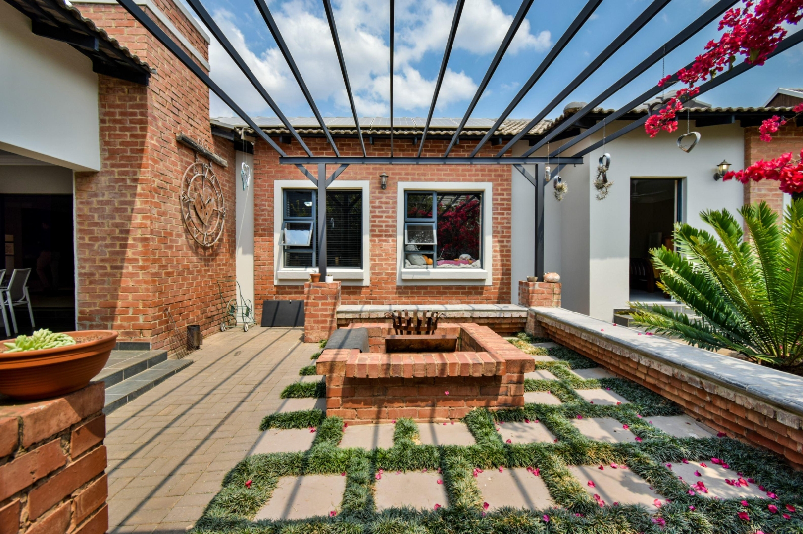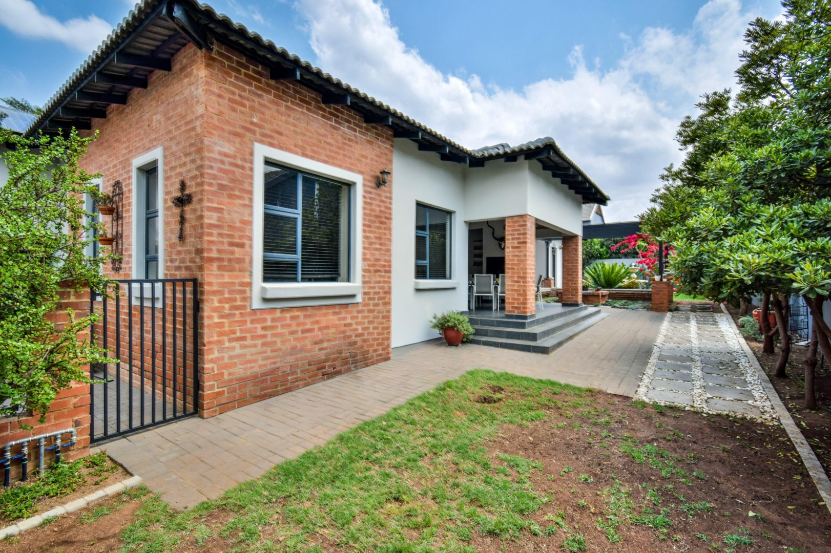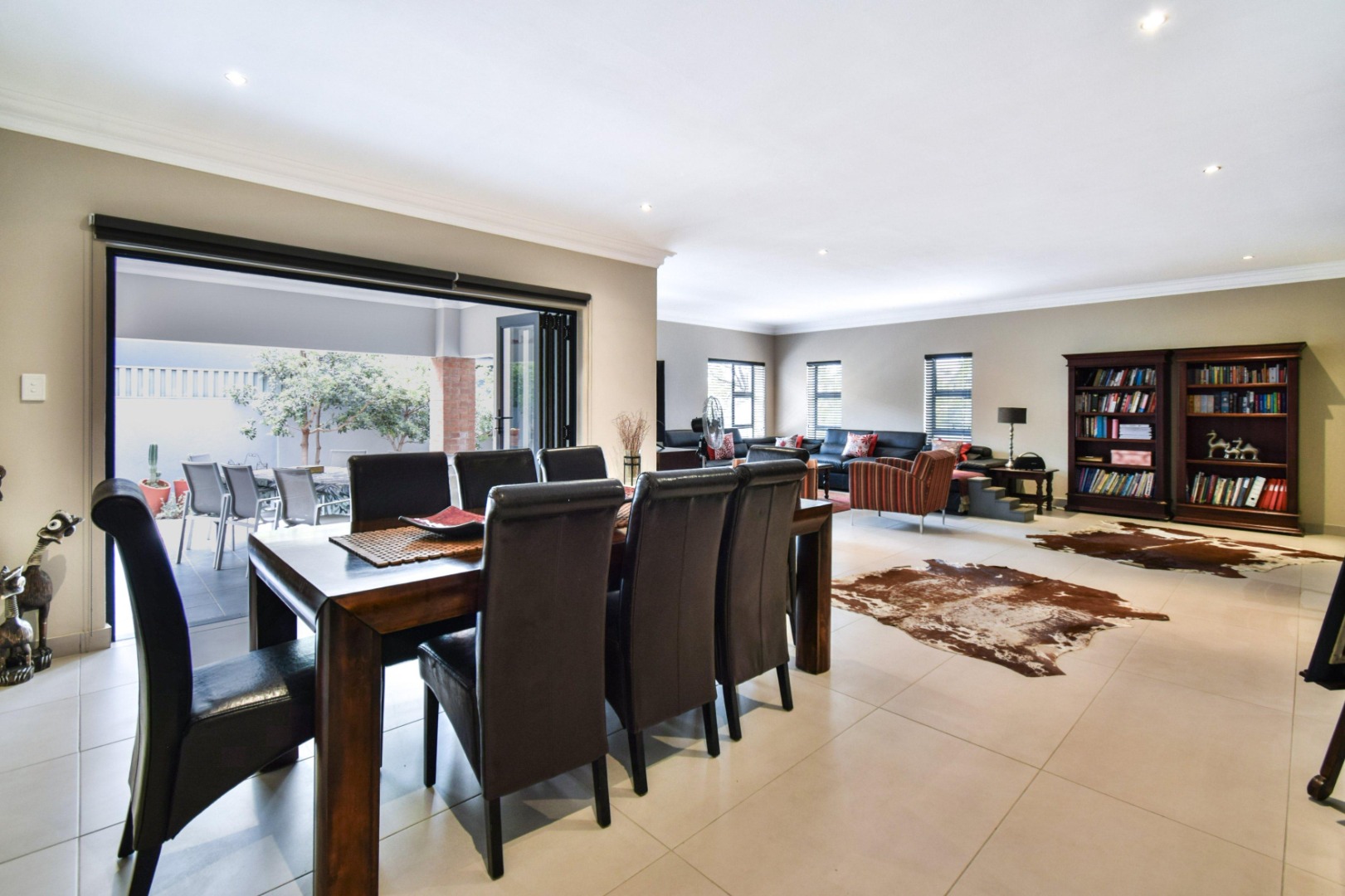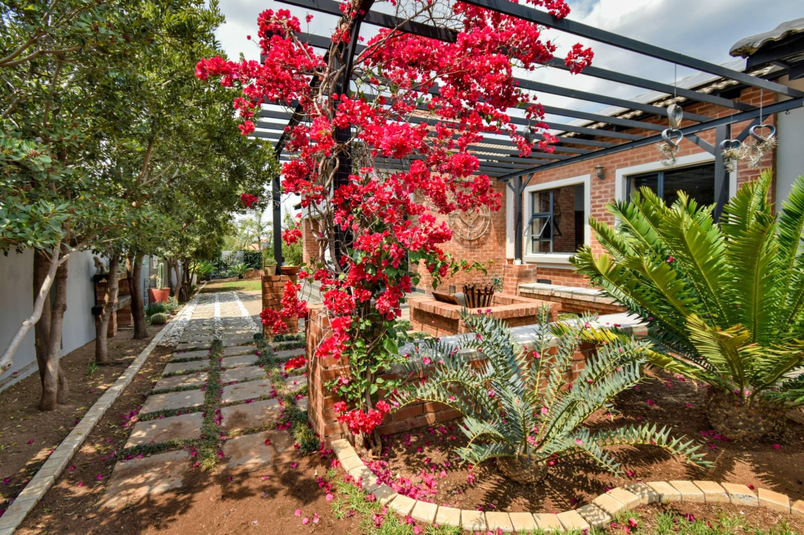 The stackable doors open up to a covered patio with a built-in braai, creating the perfect entertainment space overlooking the beautifully landscaped wrap-around garden.