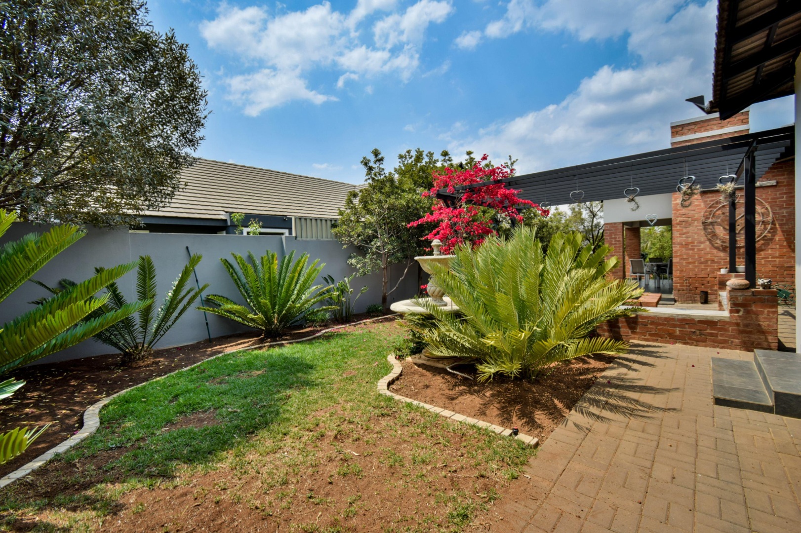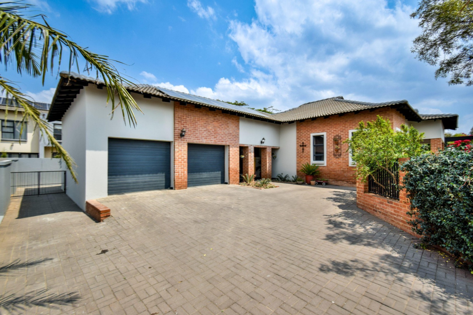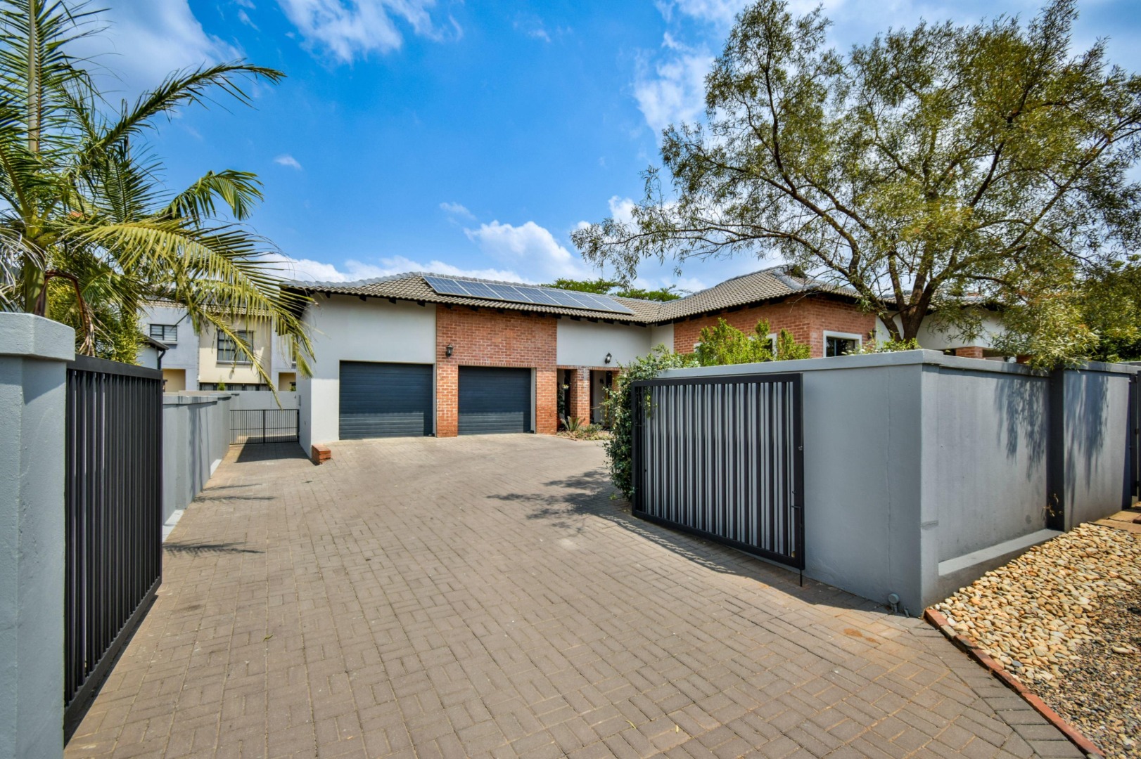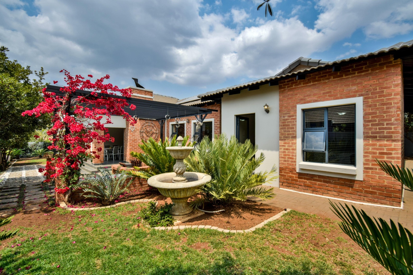 The stackable doors open up to a covered patio with a built-in braai, creating the perfect entertainment space overlooking the beautifully landscaped wrap-around garden.