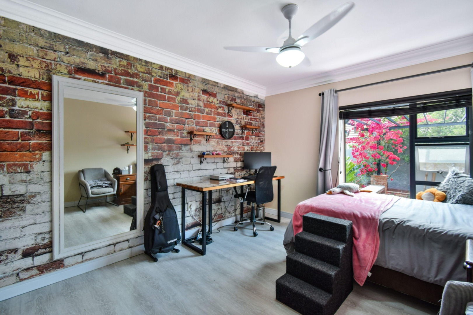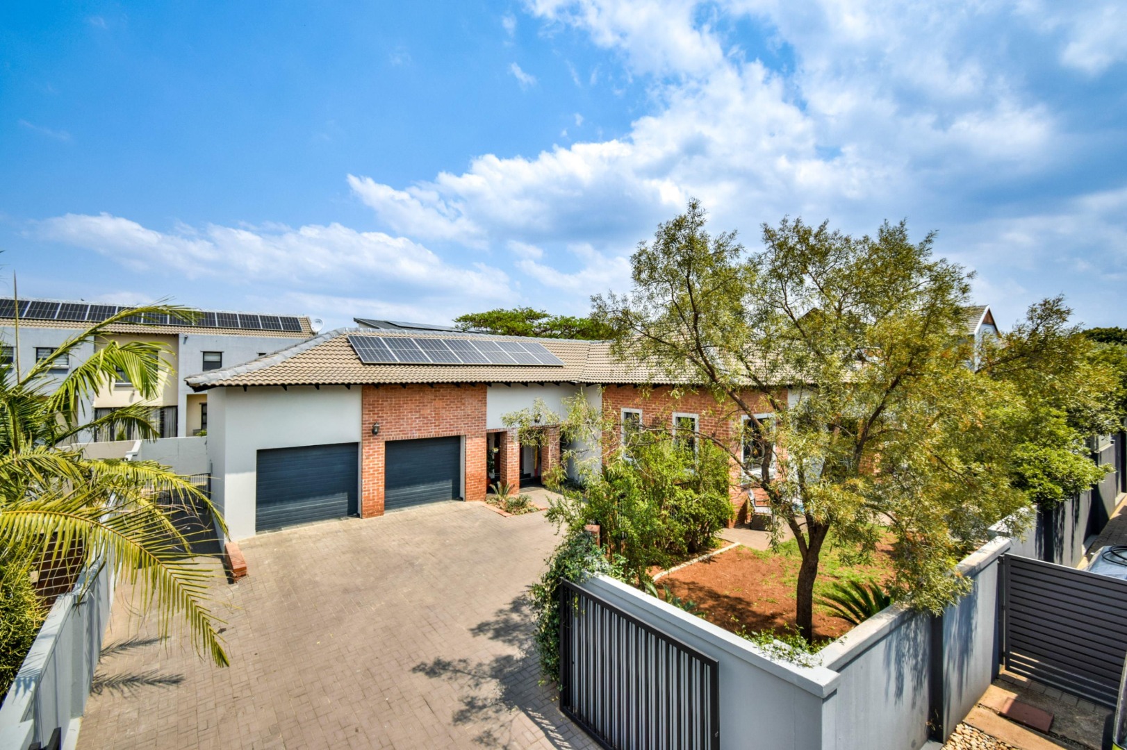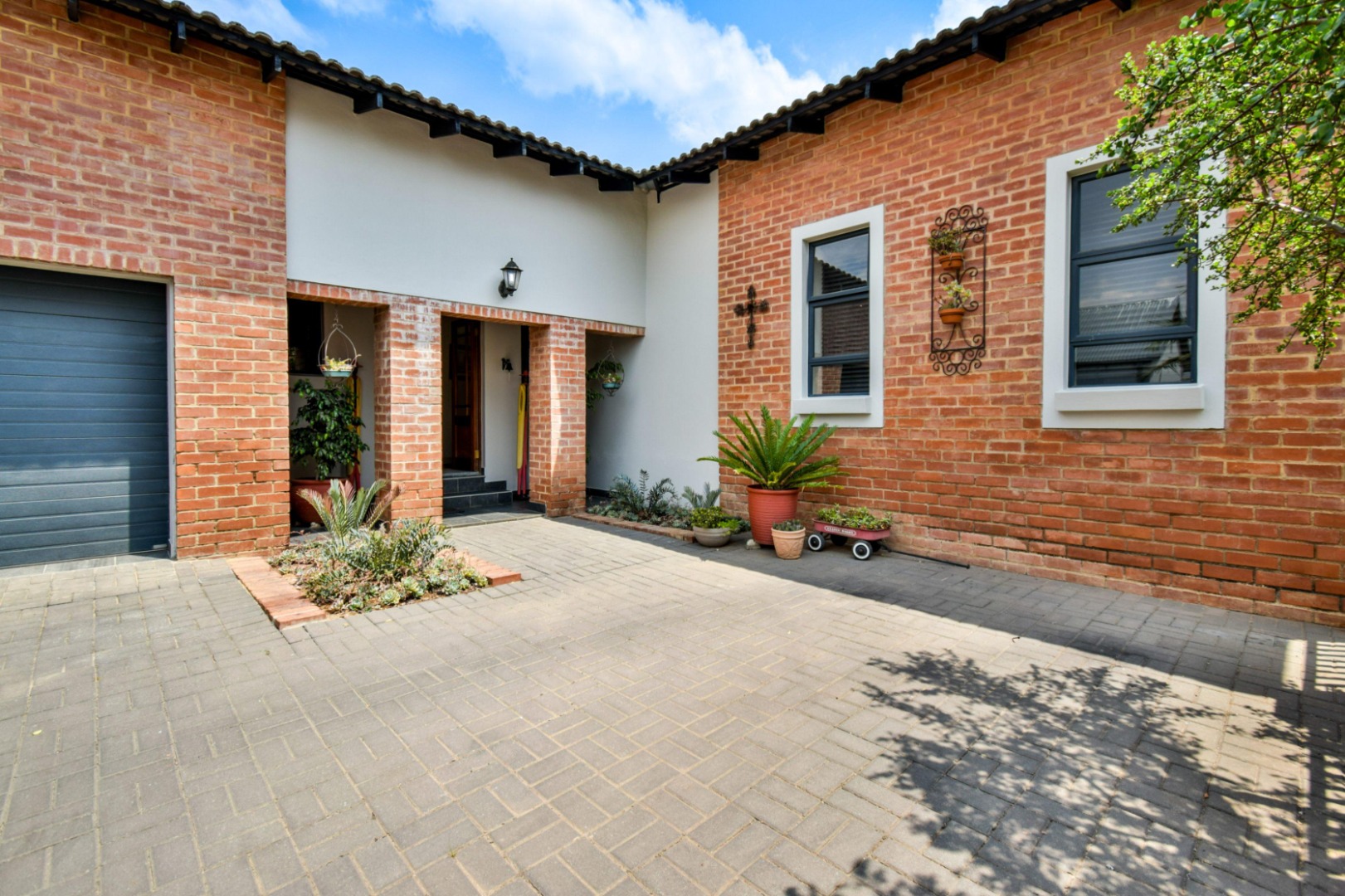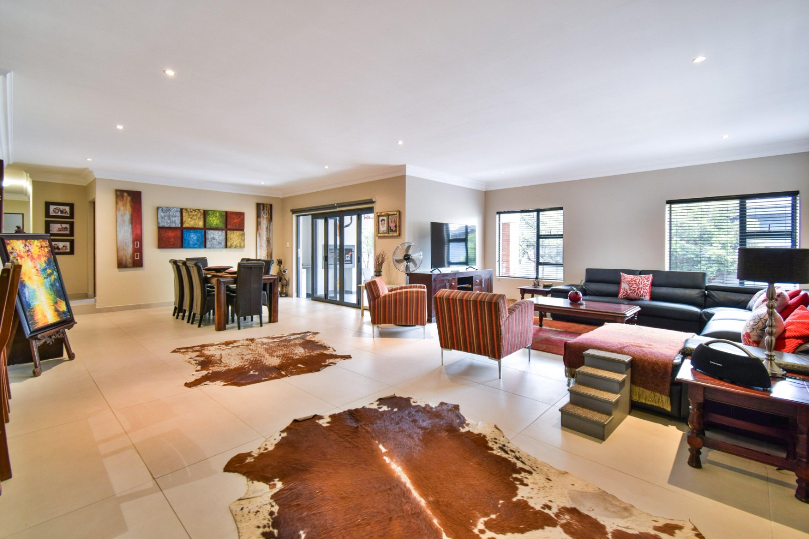 The stackable doors open up to a covered patio with a built-in braai, creating the perfect entertainment space overlooking the beautifully landscaped wrap-around garden.