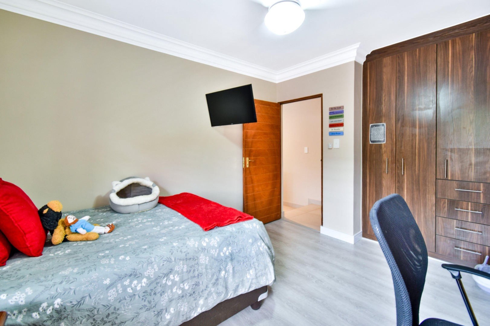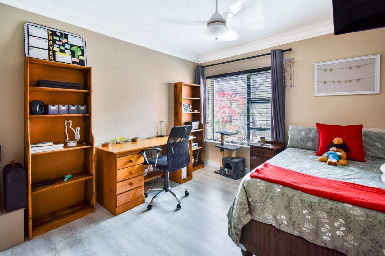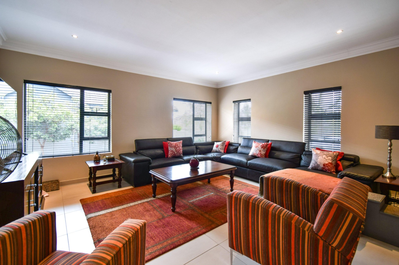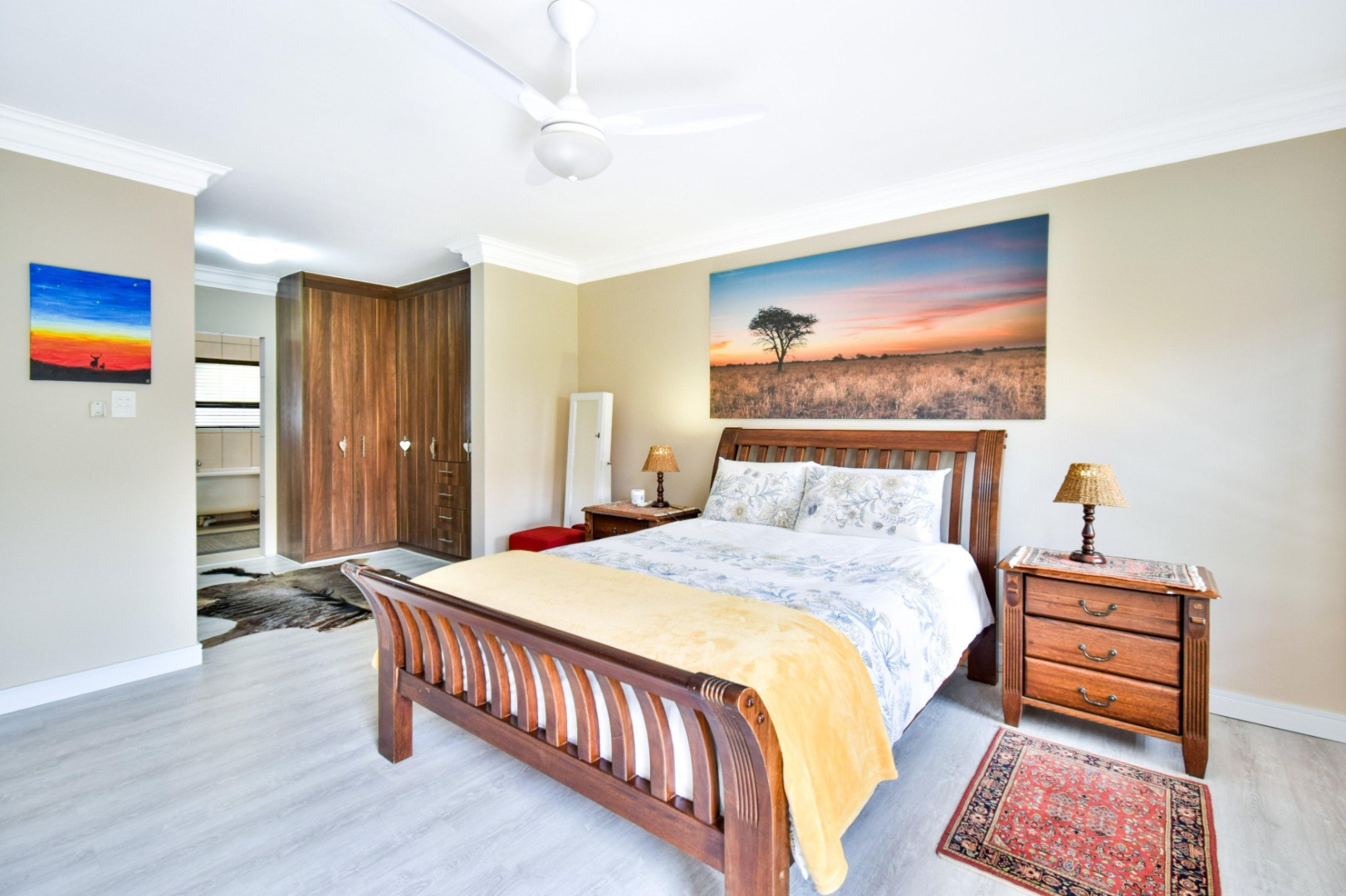 The home offers three spacious bedrooms, each fitted with built-in cupboards, ceiling fans, and blinds. The main bedroom boasts a full en-suite bathroom with a double vanity, while the other two bedrooms share a full family bathroom. A guest toilet and linen storeroom add to the home’s convenience.
