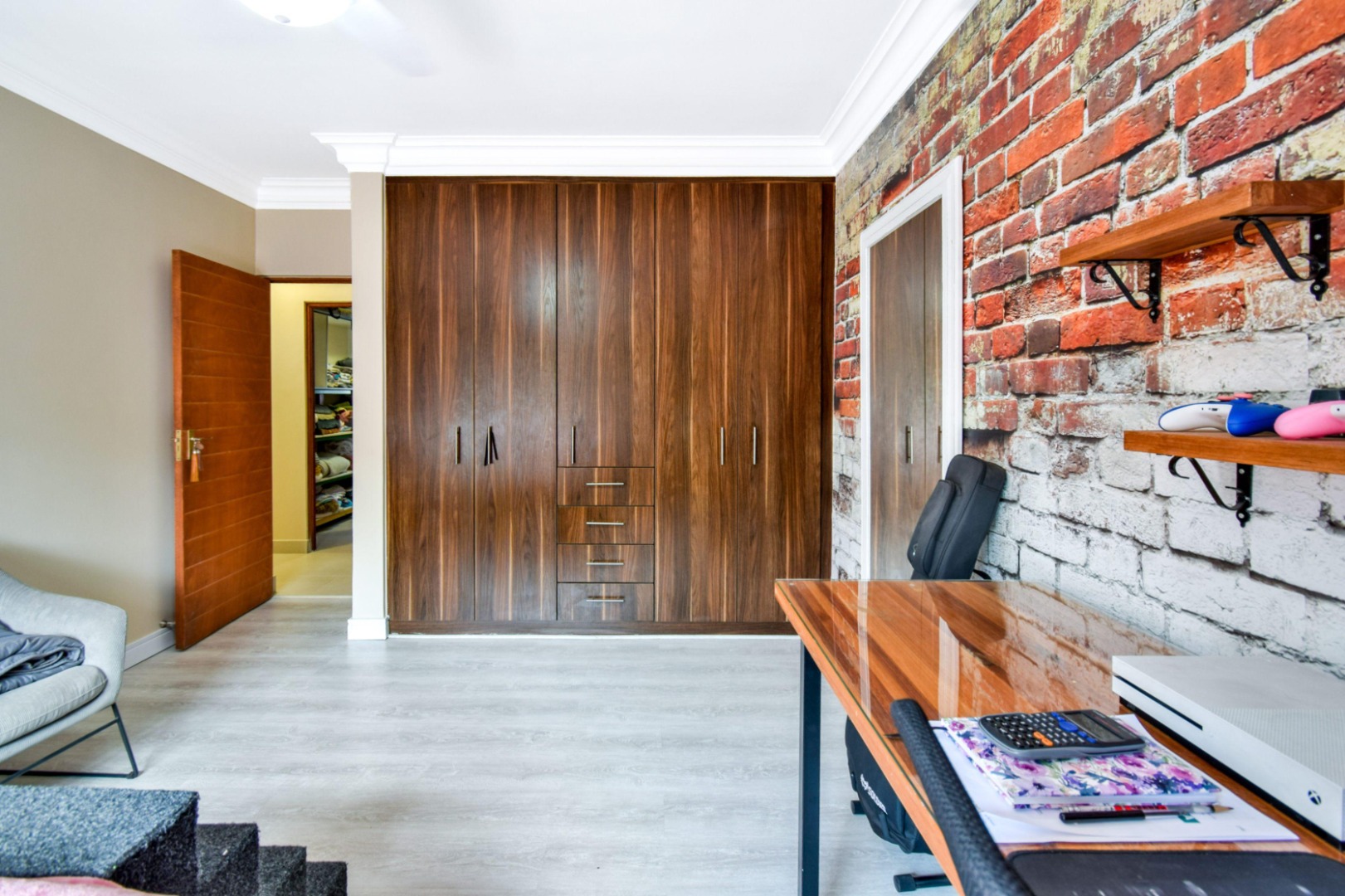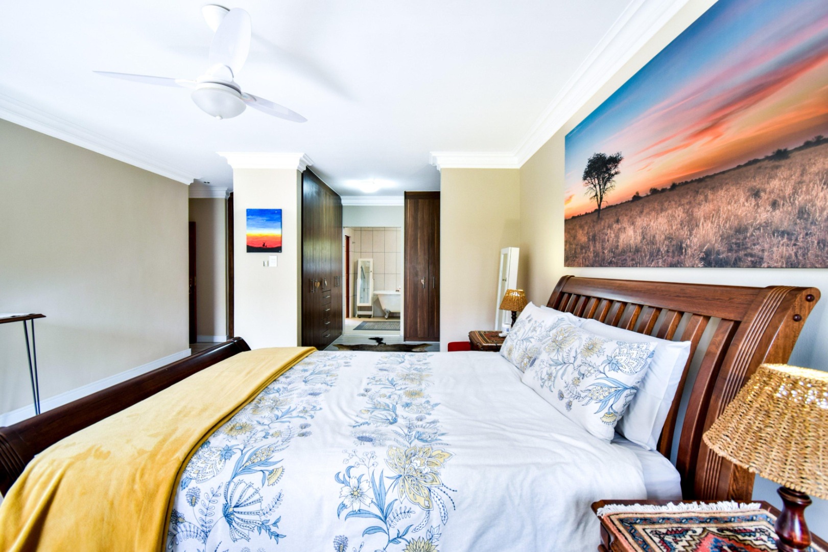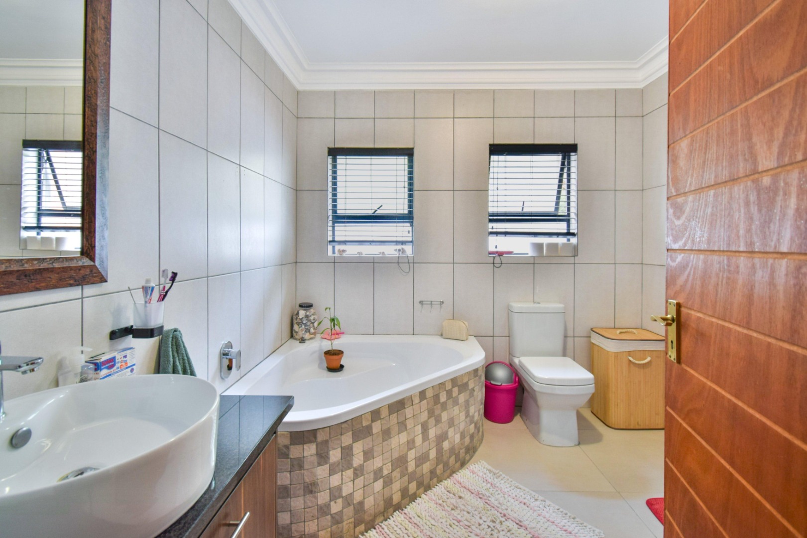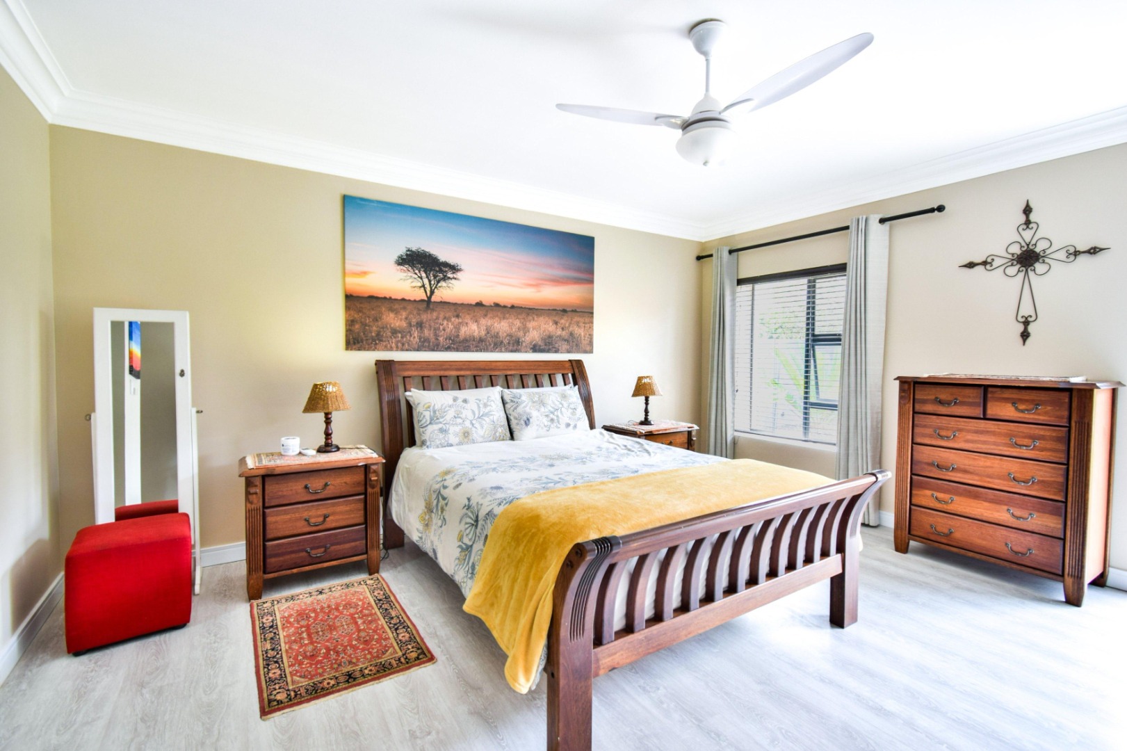 The home offers three spacious bedrooms, each fitted with built-in cupboards, ceiling fans, and blinds. The main bedroom boasts a full en-suite bathroom with a double vanity, while the other two bedrooms share a full family bathroom. A guest toilet and linen storeroom add to the home’s convenience.