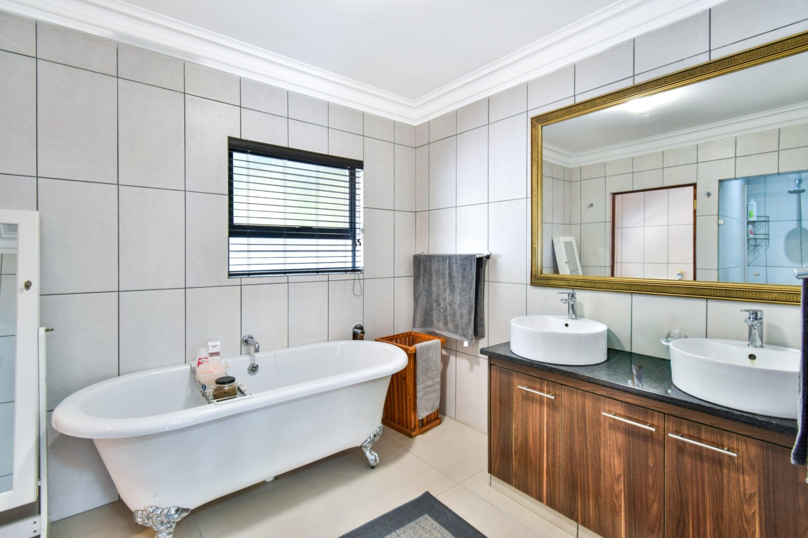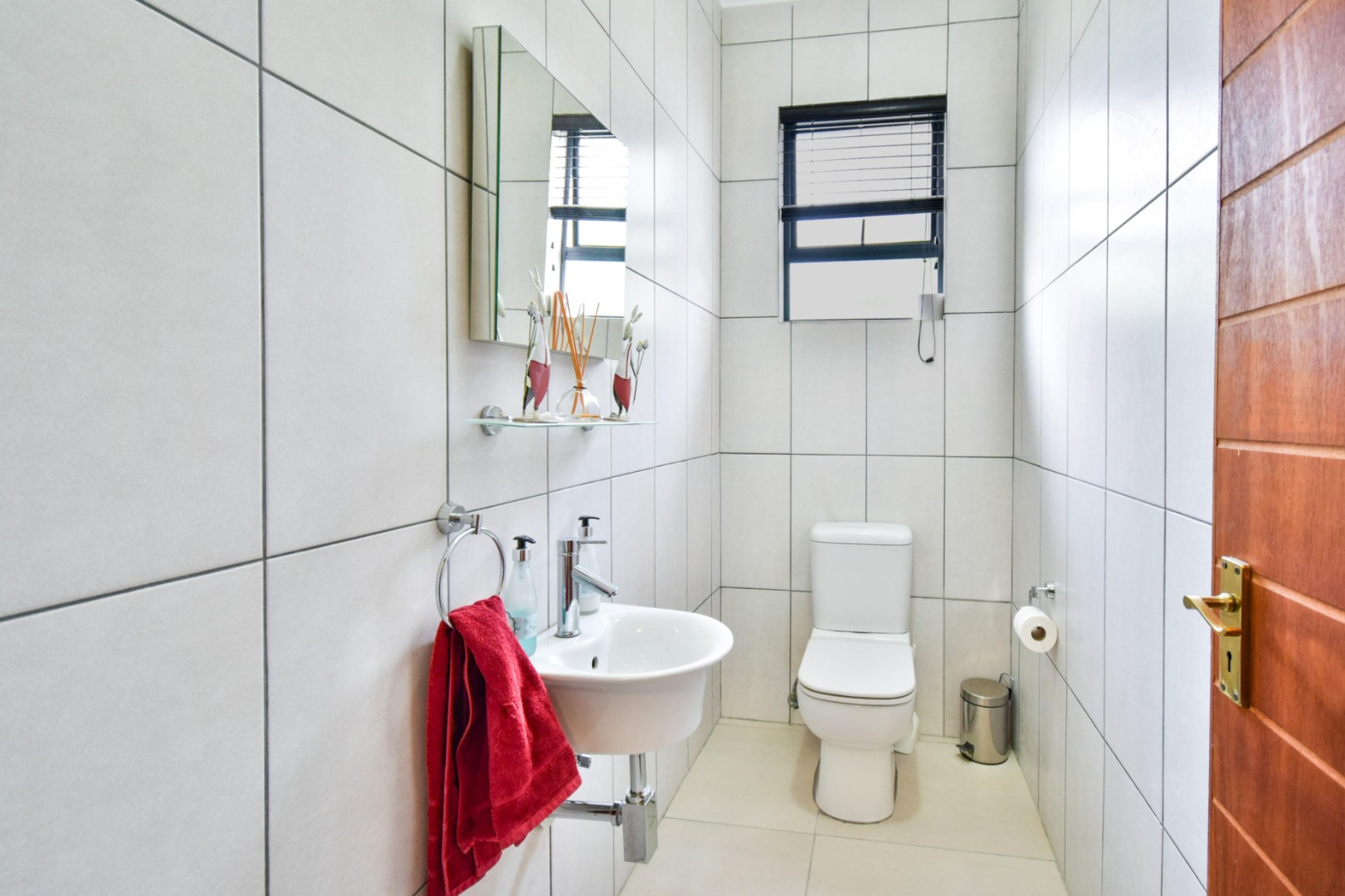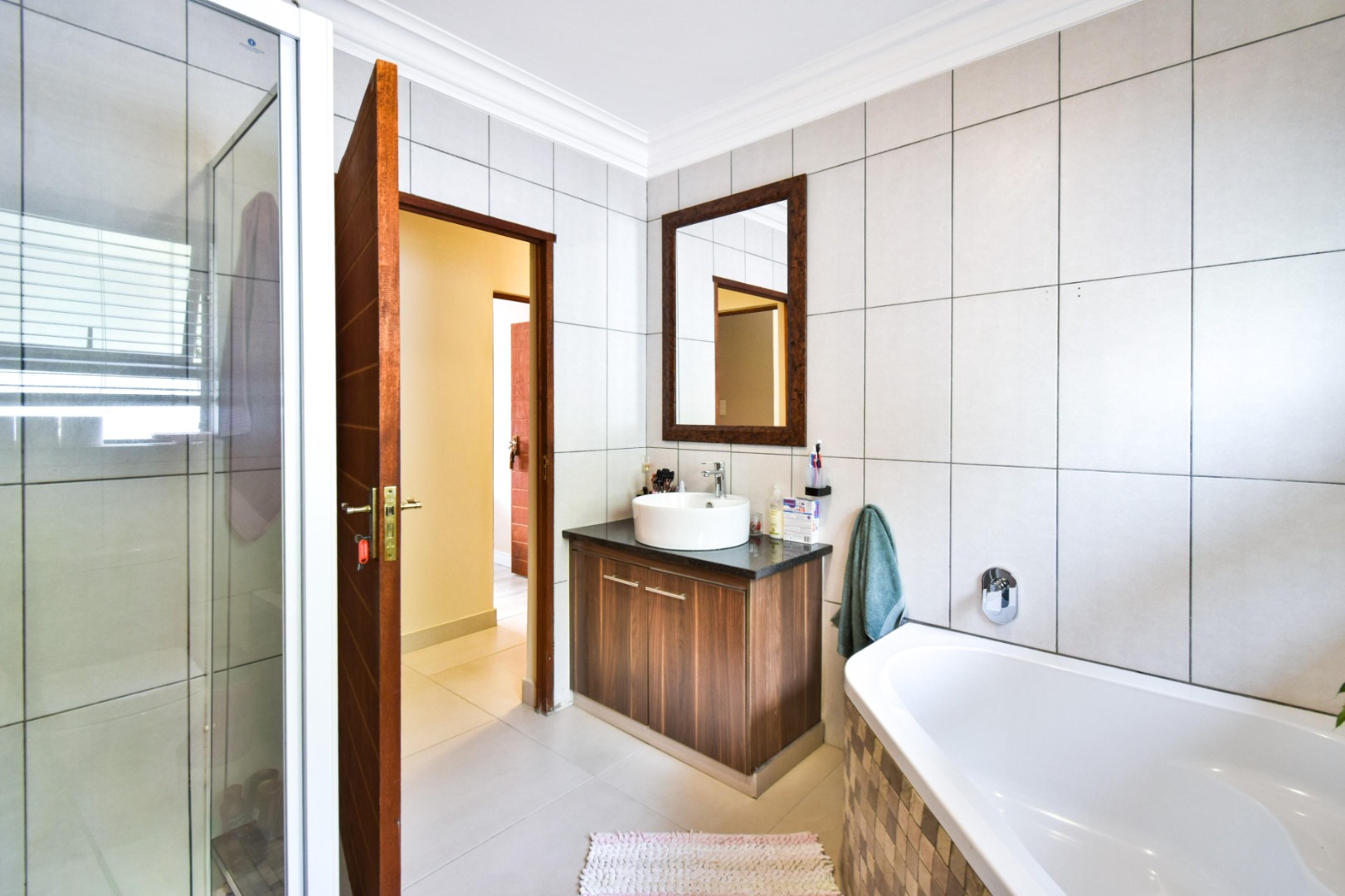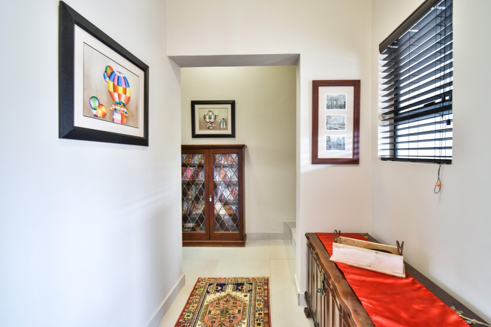 The home offers three spacious bedrooms, each fitted with built-in cupboards, ceiling fans, and blinds. The main bedroom boasts a full en-suite bathroom with a double vanity, while the other two bedrooms share a full family bathroom. A guest toilet and linen storeroom add to the home’s convenience.