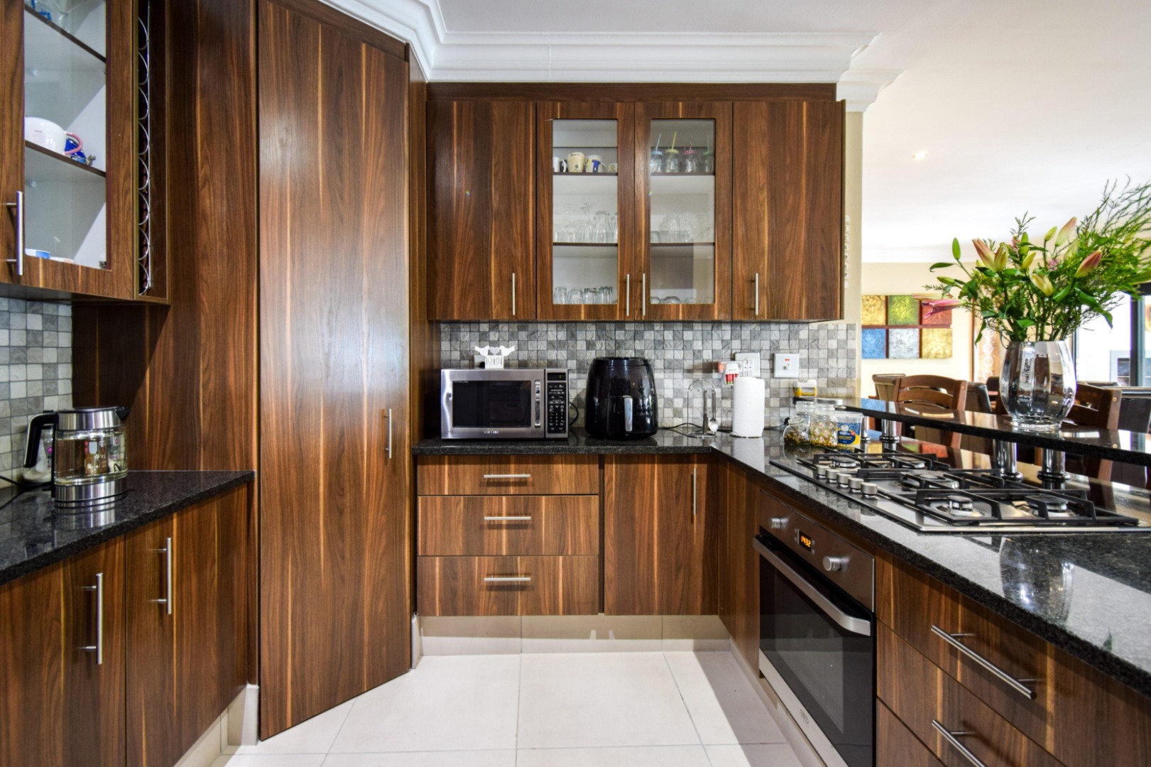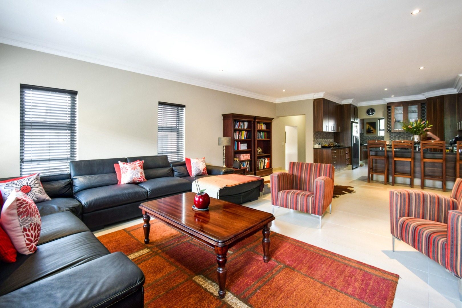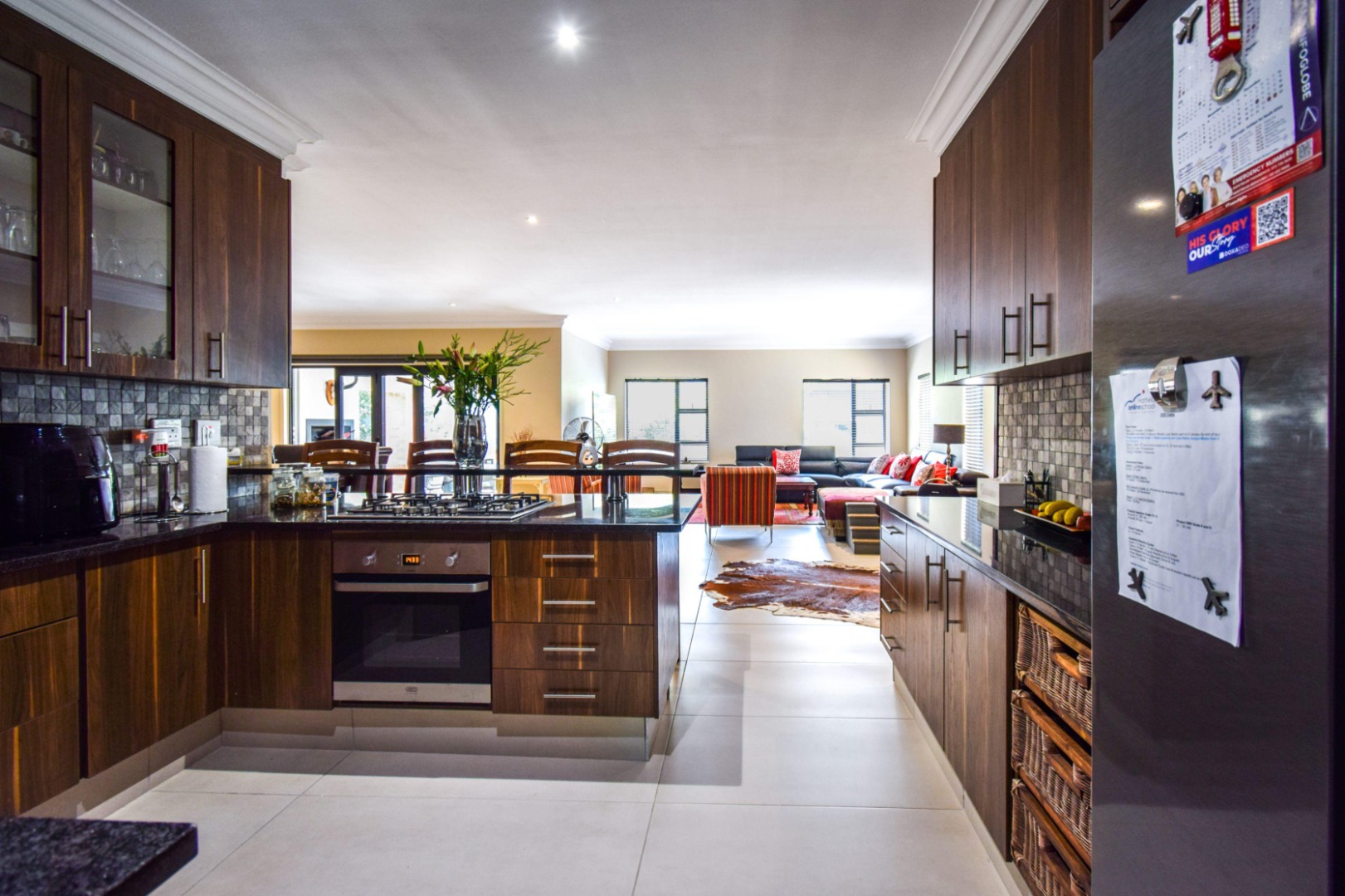 Step inside to a spacious open-plan lounge and dining area, enhanced with modern downlighting, tiled flooring, and blinds throughout. The kitchen is both functional and elegant, featuring granite countertops, a gas stove, breakfast counter, pantry cupboard, and a scullery with space for three appliances.