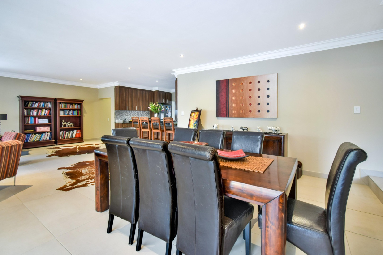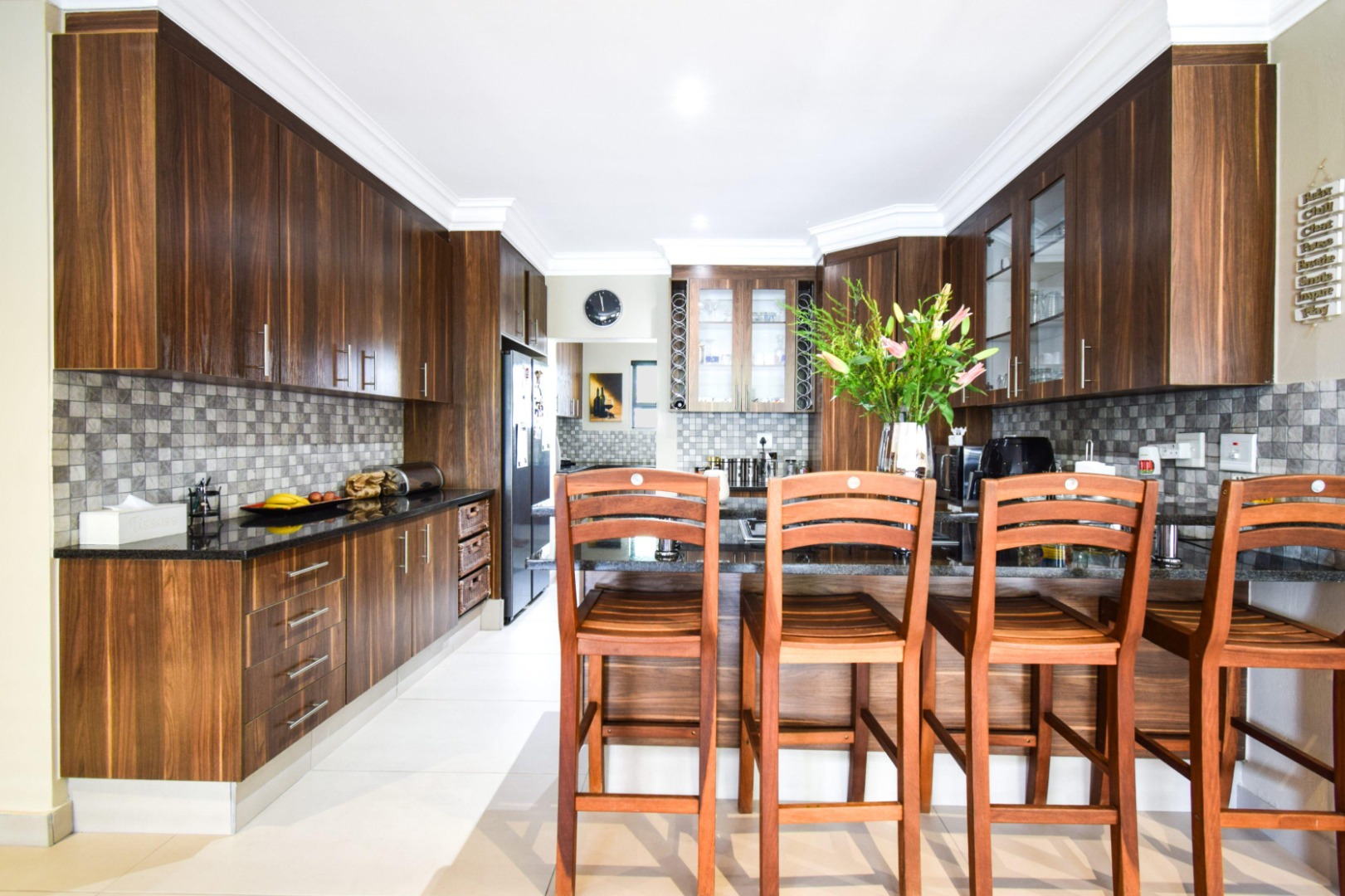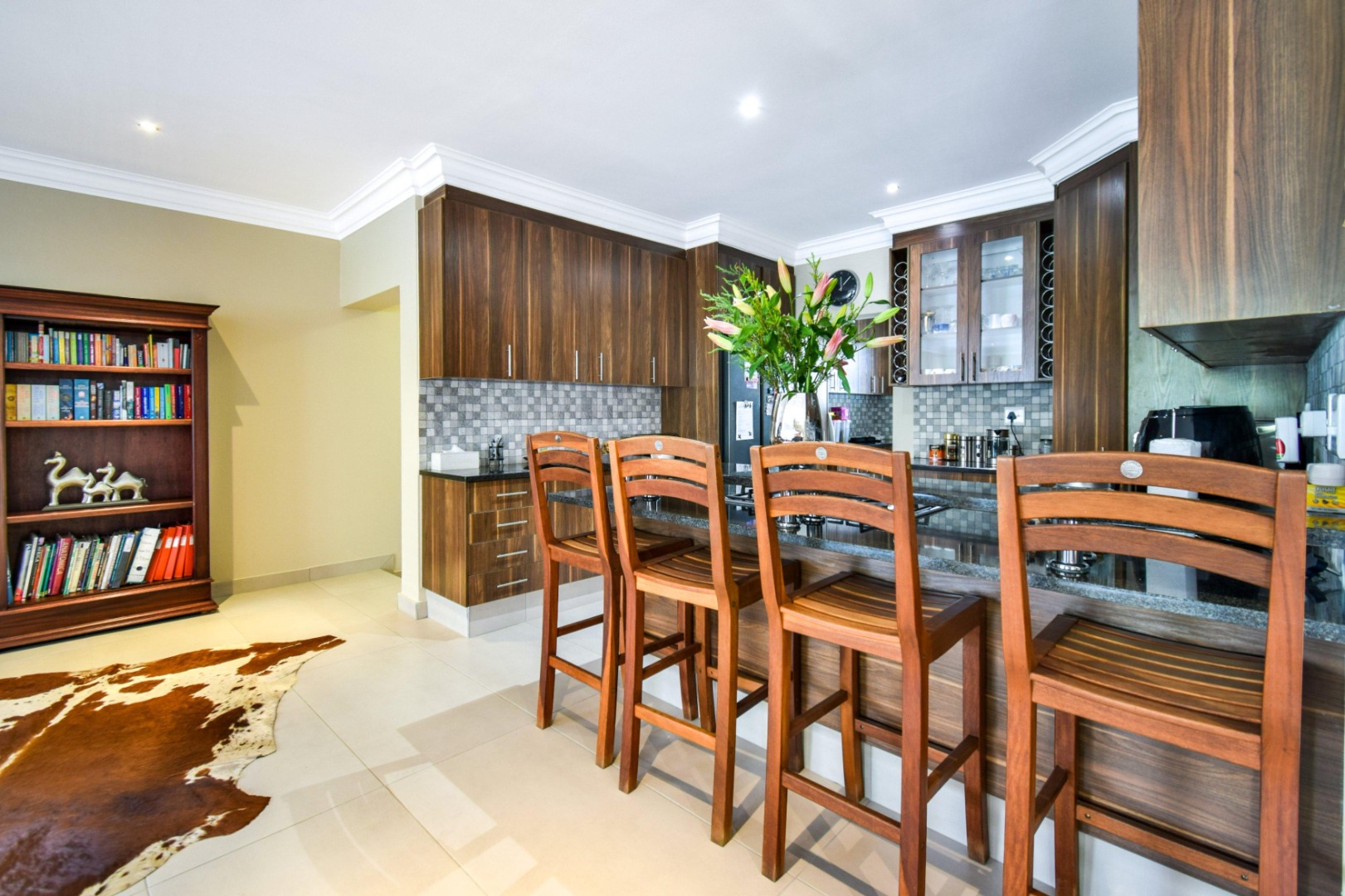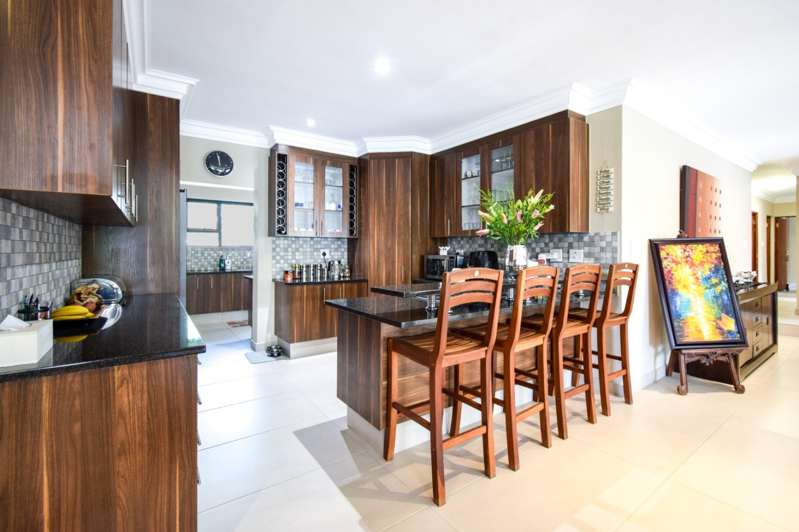 Step inside to a spacious open-plan lounge and dining area, enhanced with modern downlighting, tiled flooring, and blinds throughout. The kitchen is both functional and elegant, featuring granite countertops, a gas stove, breakfast counter, pantry cupboard, and a scullery with space for three appliances.