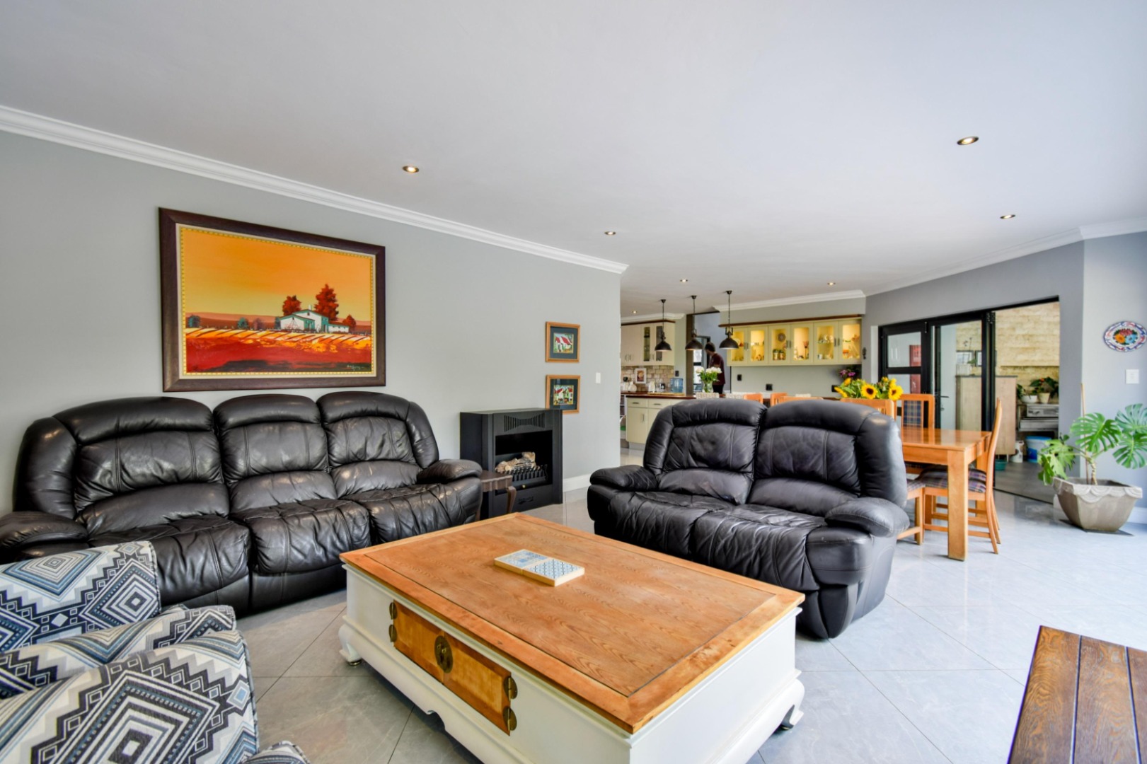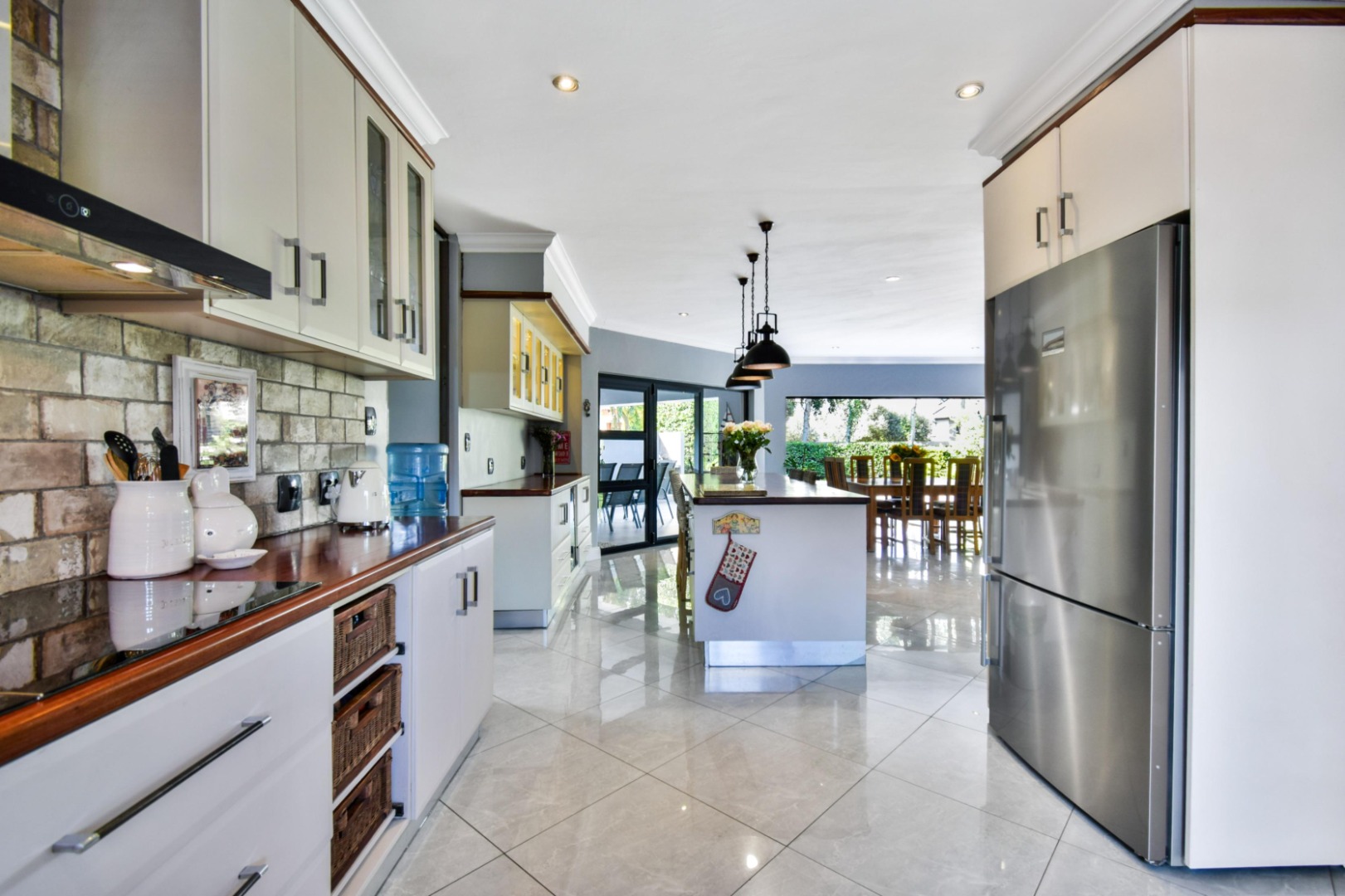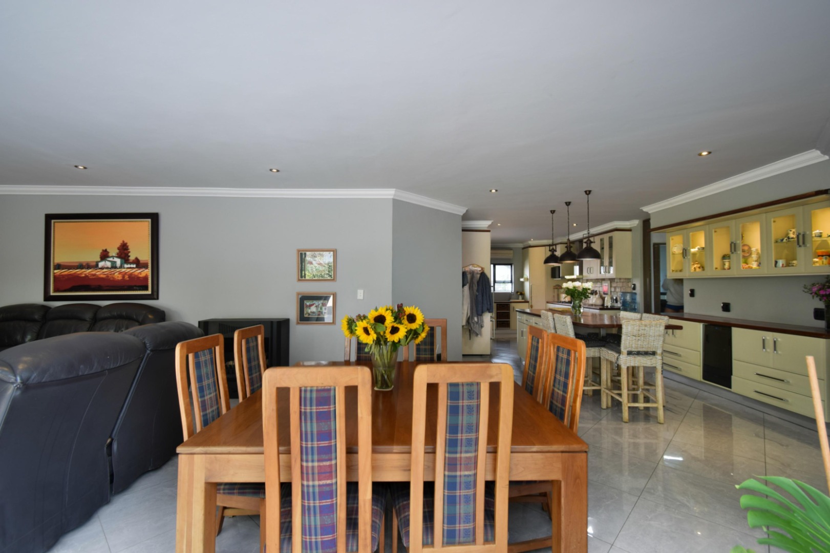 Step through the beautiful front door into an open-plan living area featuring stackable doors, a gas fireplace, and a seamless flow between the lounge and dining room. The modern kitchen boasts a center island breakfast counter, gas and electric stove tops, double eye-level oven, double pantry cupboards, and a separate scullery with space for three appliances and a double basin. The home also offers a guest bedroom with a bathroom downstairs and a dedicated office space, ideal for working from home. Blinds are fitted throughout the house for a clean and elegant look.
