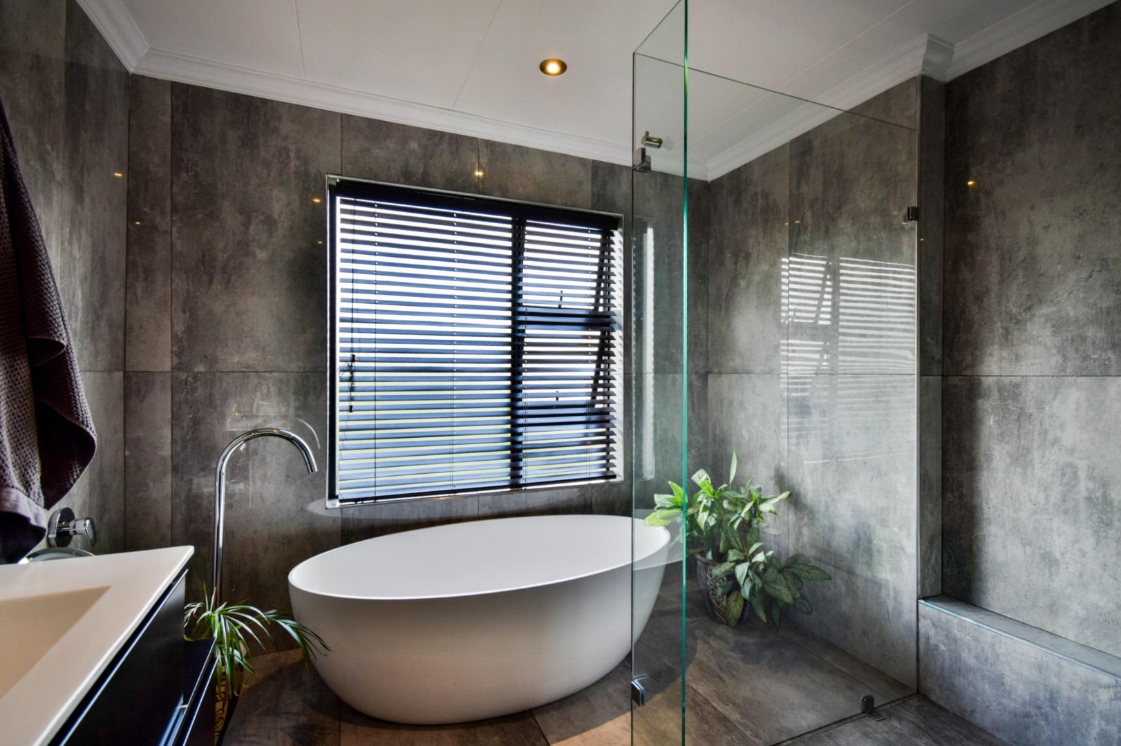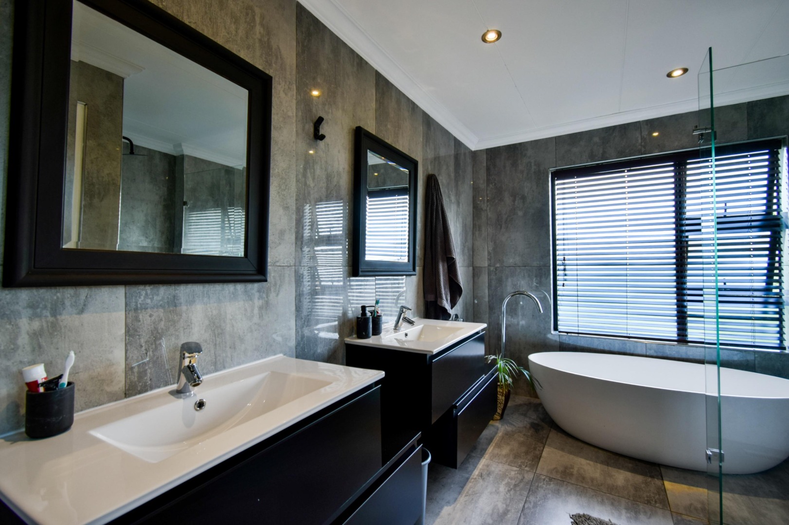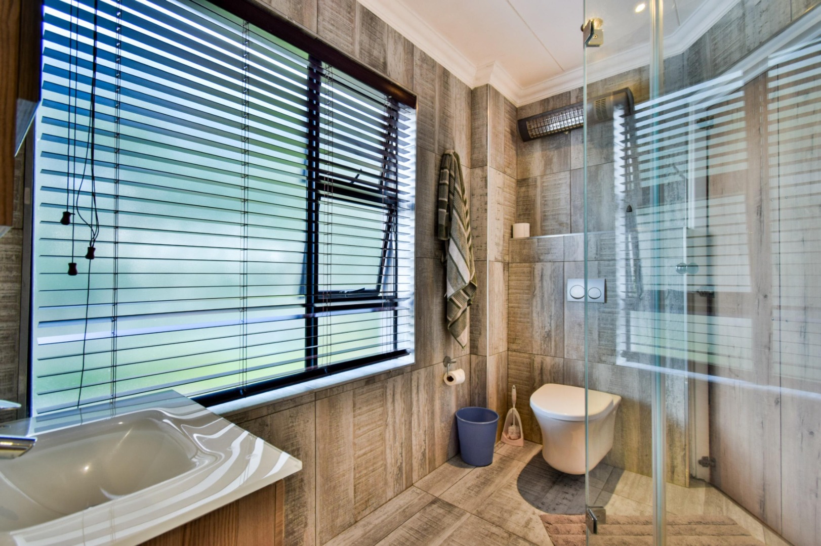 Step through the beautiful front door into an open-plan living area featuring stackable doors, a gas fireplace, and a seamless flow between the lounge and dining room. The modern kitchen boasts a center island breakfast counter, gas and electric stove tops, double eye-level oven, double pantry cupboards, and a separate scullery with space for three appliances and a double basin. The home also offers a guest bedroom with a bathroom downstairs and a dedicated office space, ideal for working from home. Blinds are fitted throughout the house for a clean and elegant look.