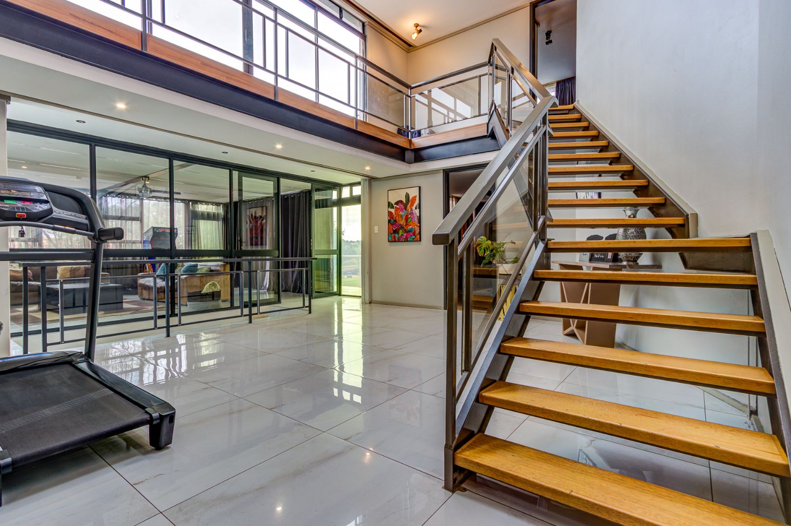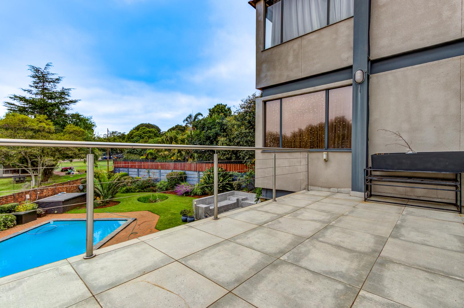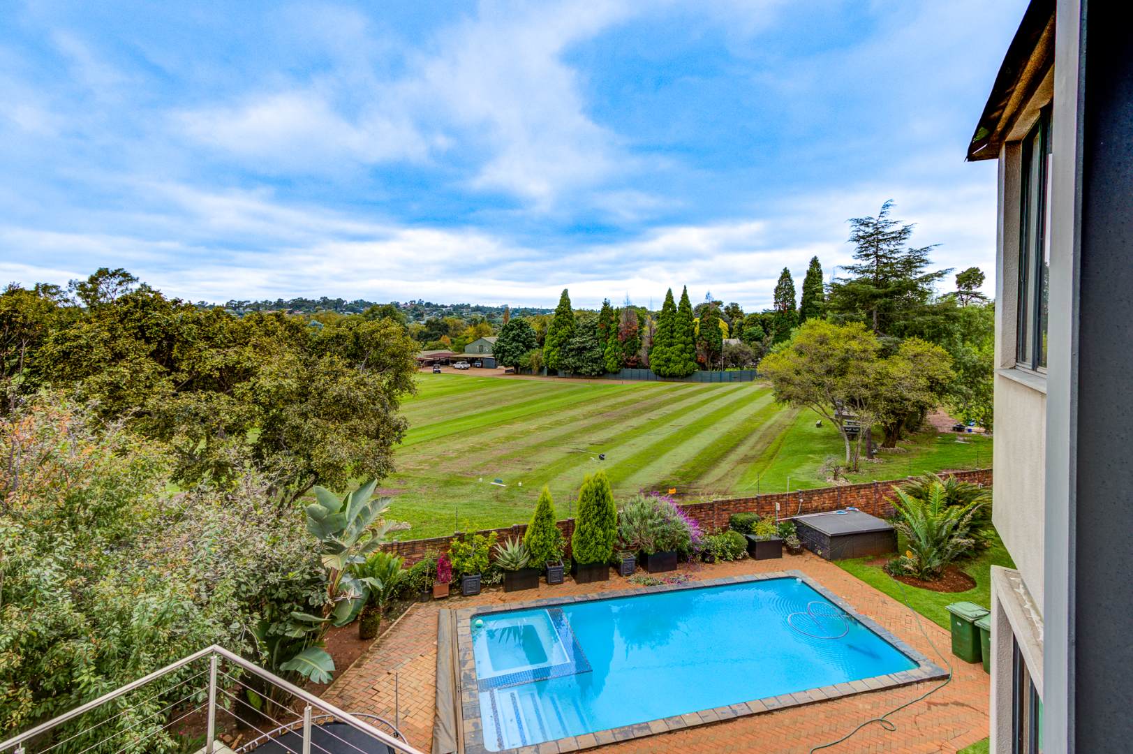 Further enhancing this exceptional property are a dedicated study, a private balcony, and a spacious patio, perfect for outdoor enjoyment. The meticulously maintained garden features a swimming pool and a built-in braai. Additional amenities include staff quarters, a separate flatlet, domestic rooms, a laundry, and ample storage. The property benefits from two garages and nine additional parking spaces. Security is paramount, with features such as a security gate, electric fencing, 24-hour security, and its location within a secure complex. Modern conveniences such as a battery inverter and fibre connectivity are also present, alongside a built-in bar and an open-plan design that enhances the sense of spaciousness. Enjoy scenic views from various vantage points within this totally walled and secure abode.