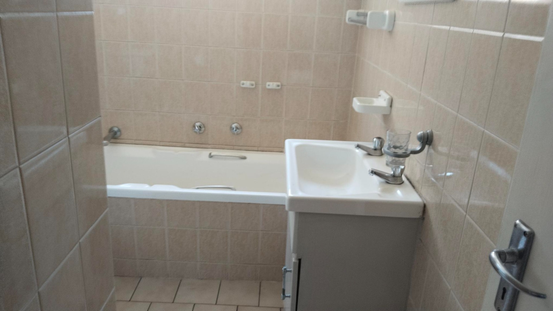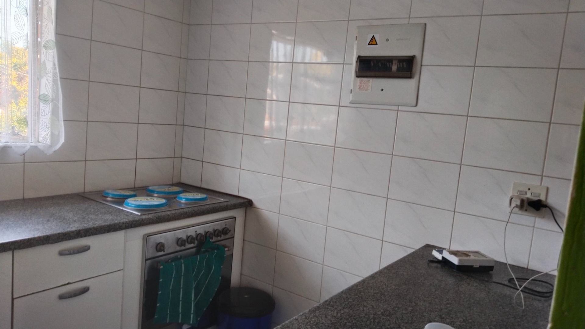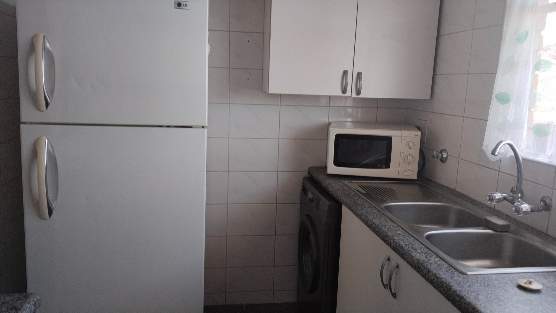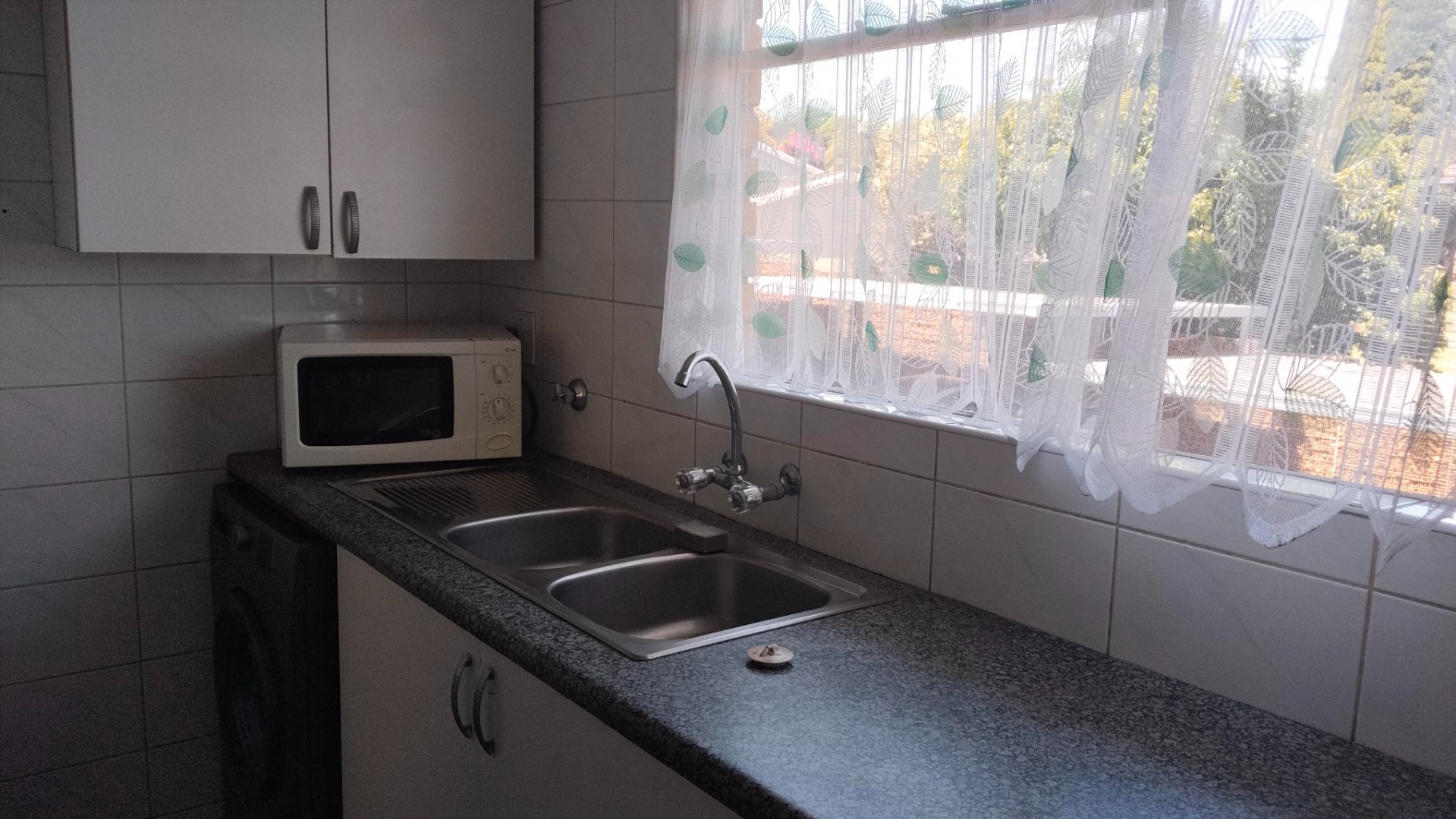 The practical kitchen features tiled walls, an integrated electric stove, and a double sink, with space for your washing machine.