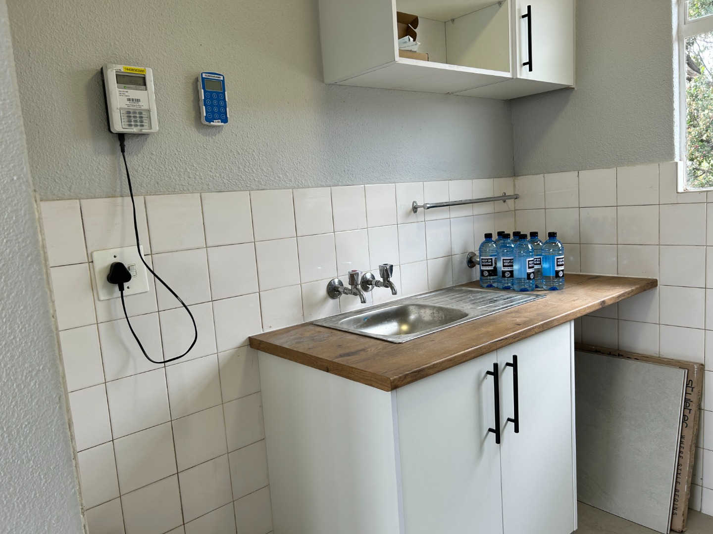 The main living area provides direct access to a private balcony, perfect for enjoying the expansive urban views. The kitchen features sleek white cabinets, attractive wood-look laminate countertops, a stainless steel sink, and a new black electric stove. An additional utility area includes convenient prepaid electricity and water meters, ensuring efficient management of utilities.