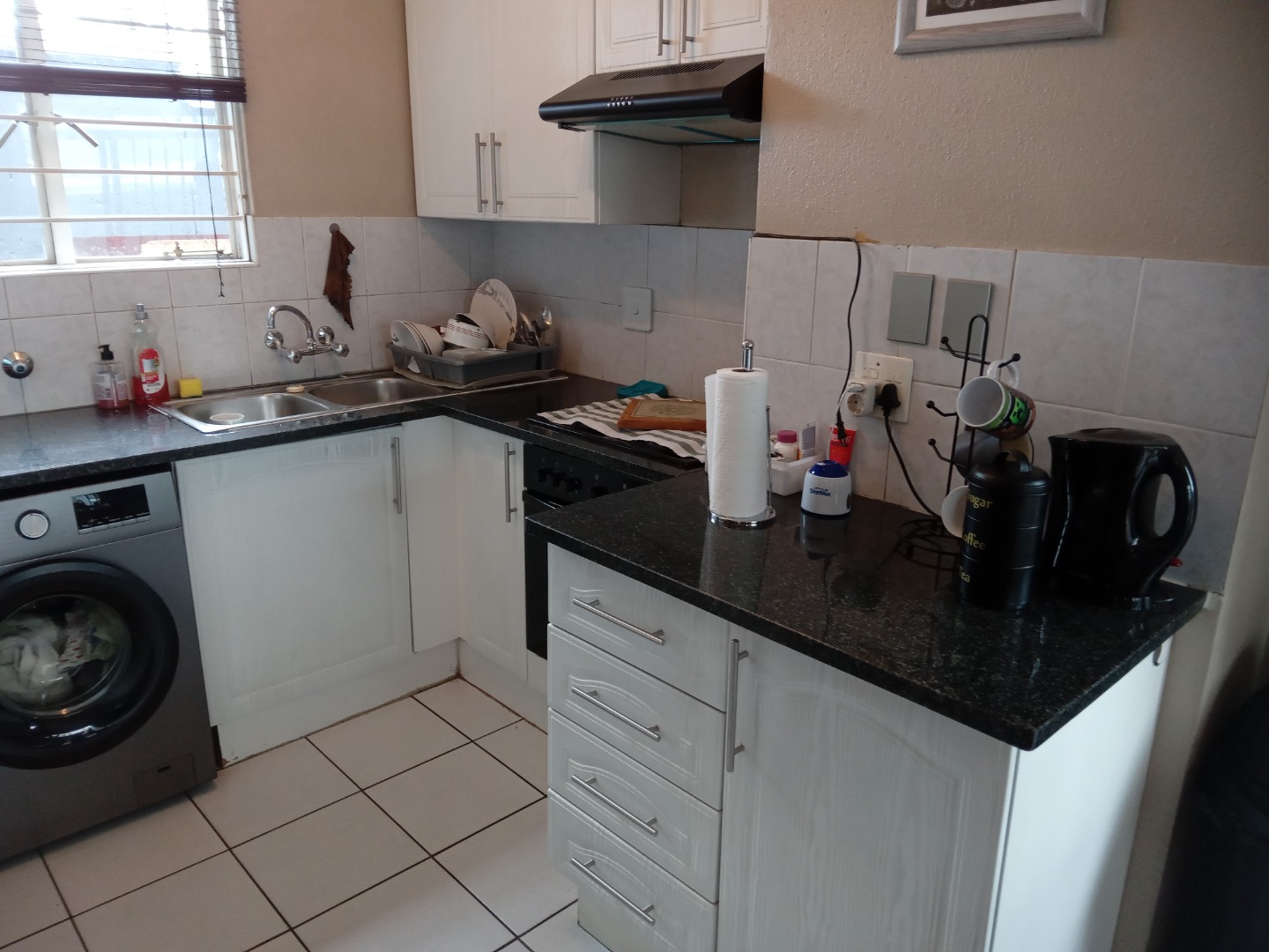 This inviting 3-bedroom, 1-bathroom residential sale property is situated within a secure gated community in Hurlyvale, Edenvale, South Africa. The home features an open-plan living area with tiled flooring, a dedicated dining space, and a modern kitchen equipped with white cabinetry.