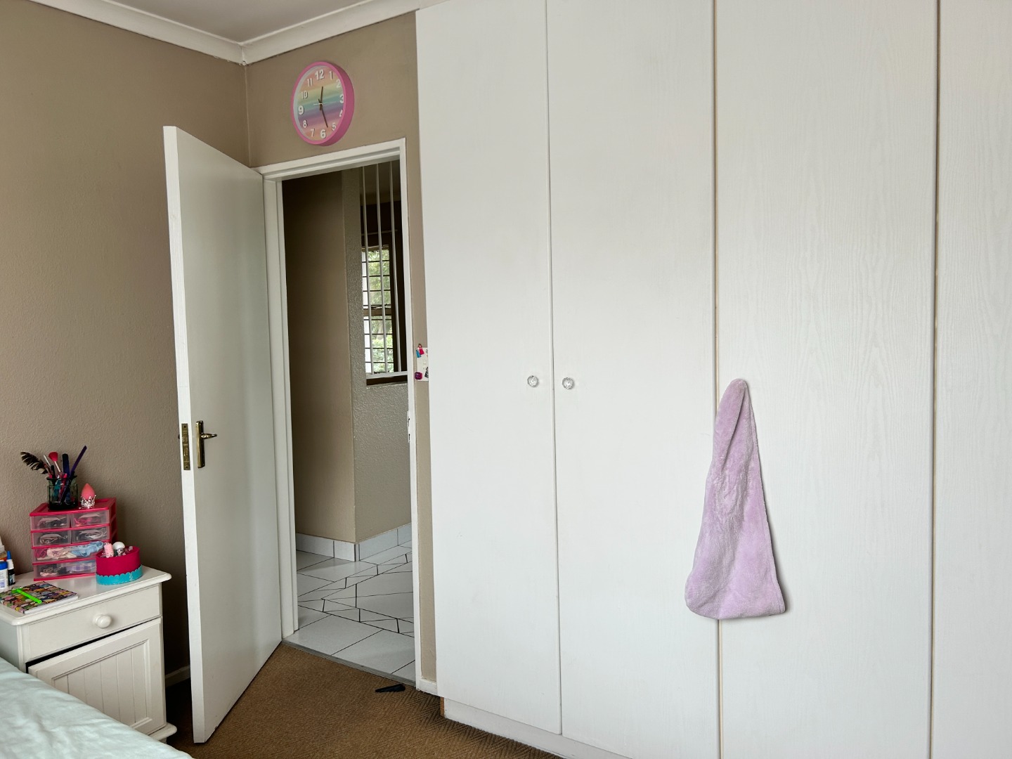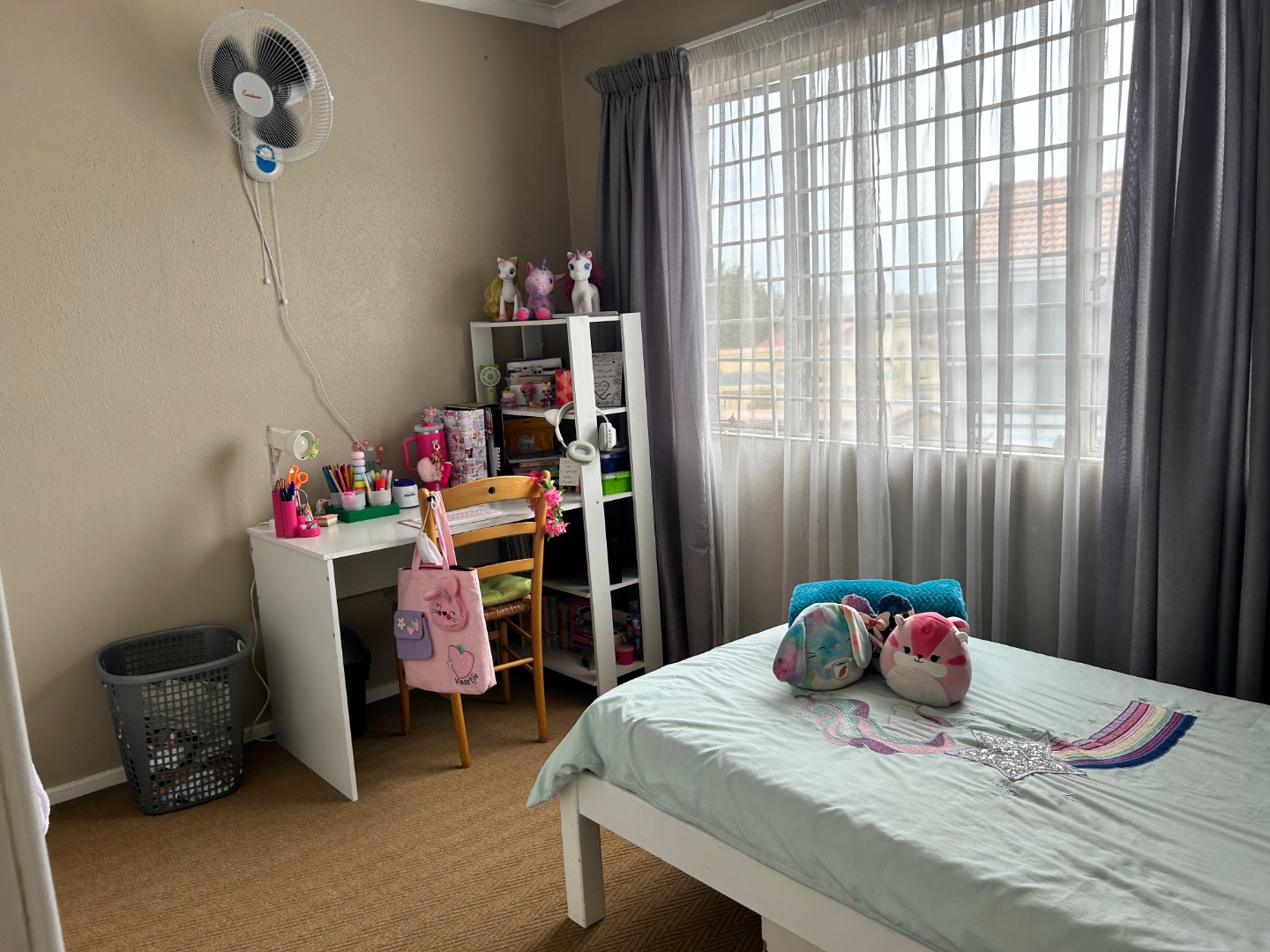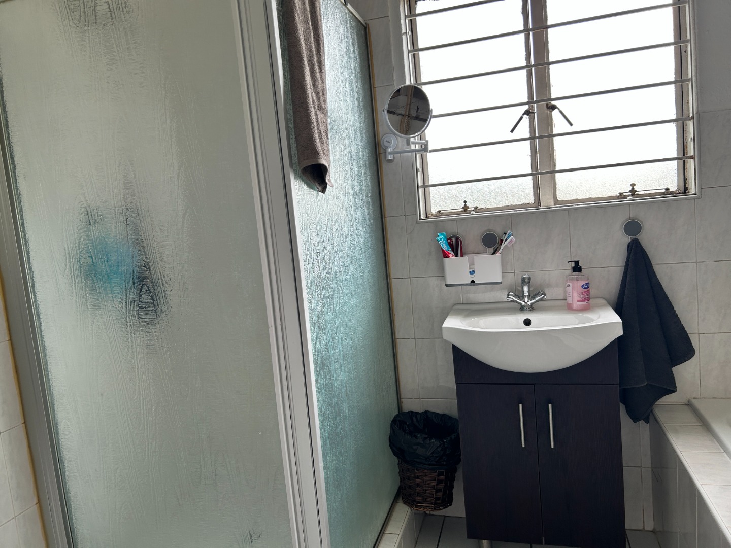 Upstairs, all three bedrooms are carpeted and fitted with built-in cupboards. The main bedroom opens onto an enclosed balcony, offering an additional flexible space. The family bathroom is fully tiled and includes a bath, shower, vanity, and toilet.