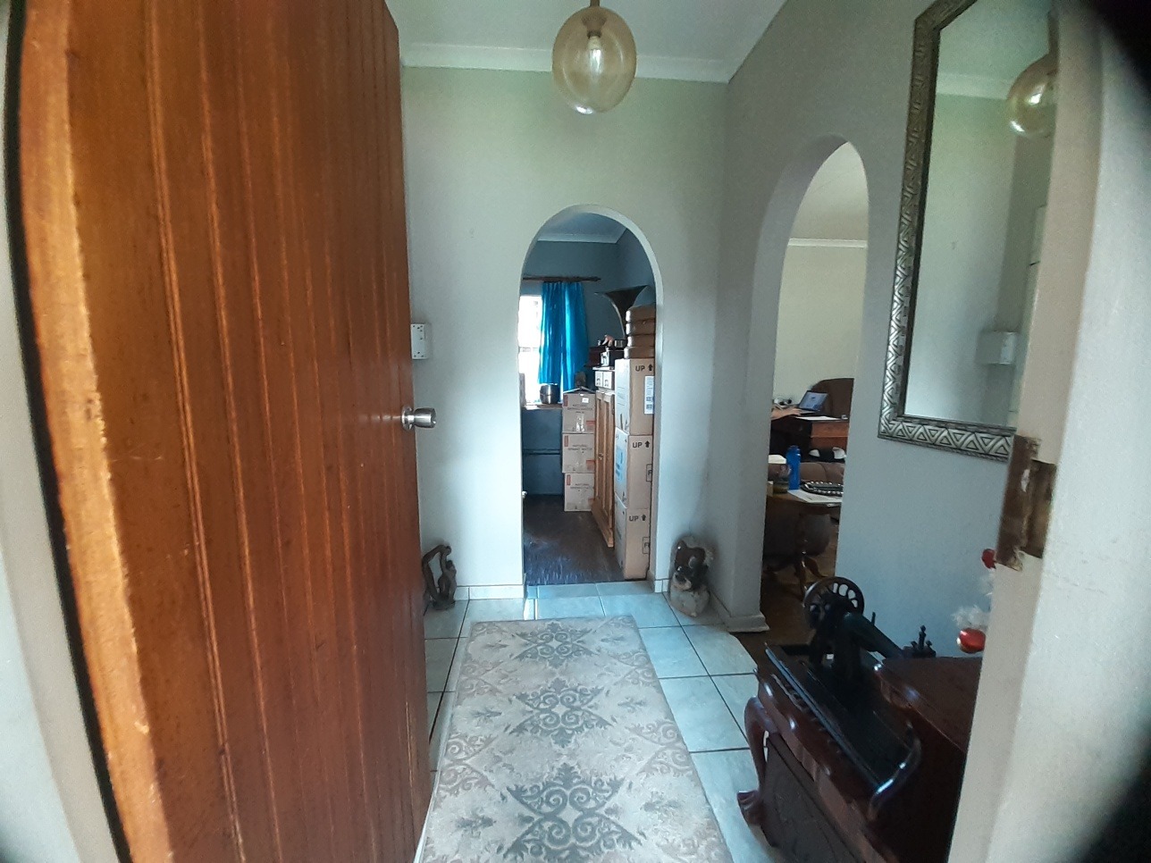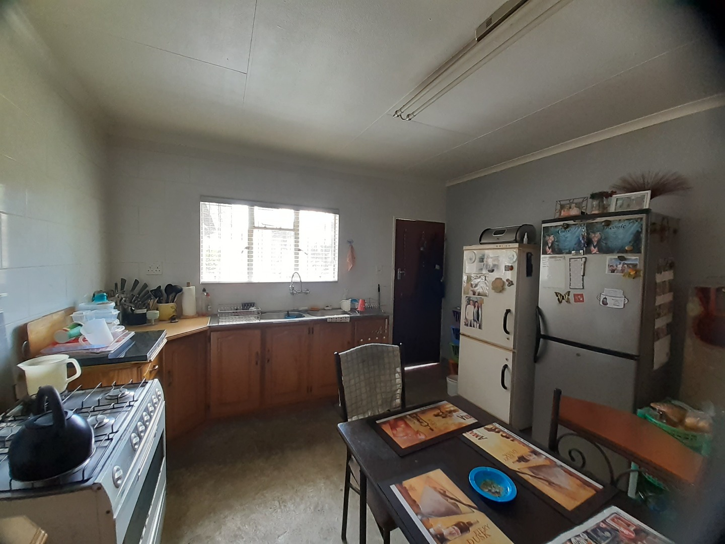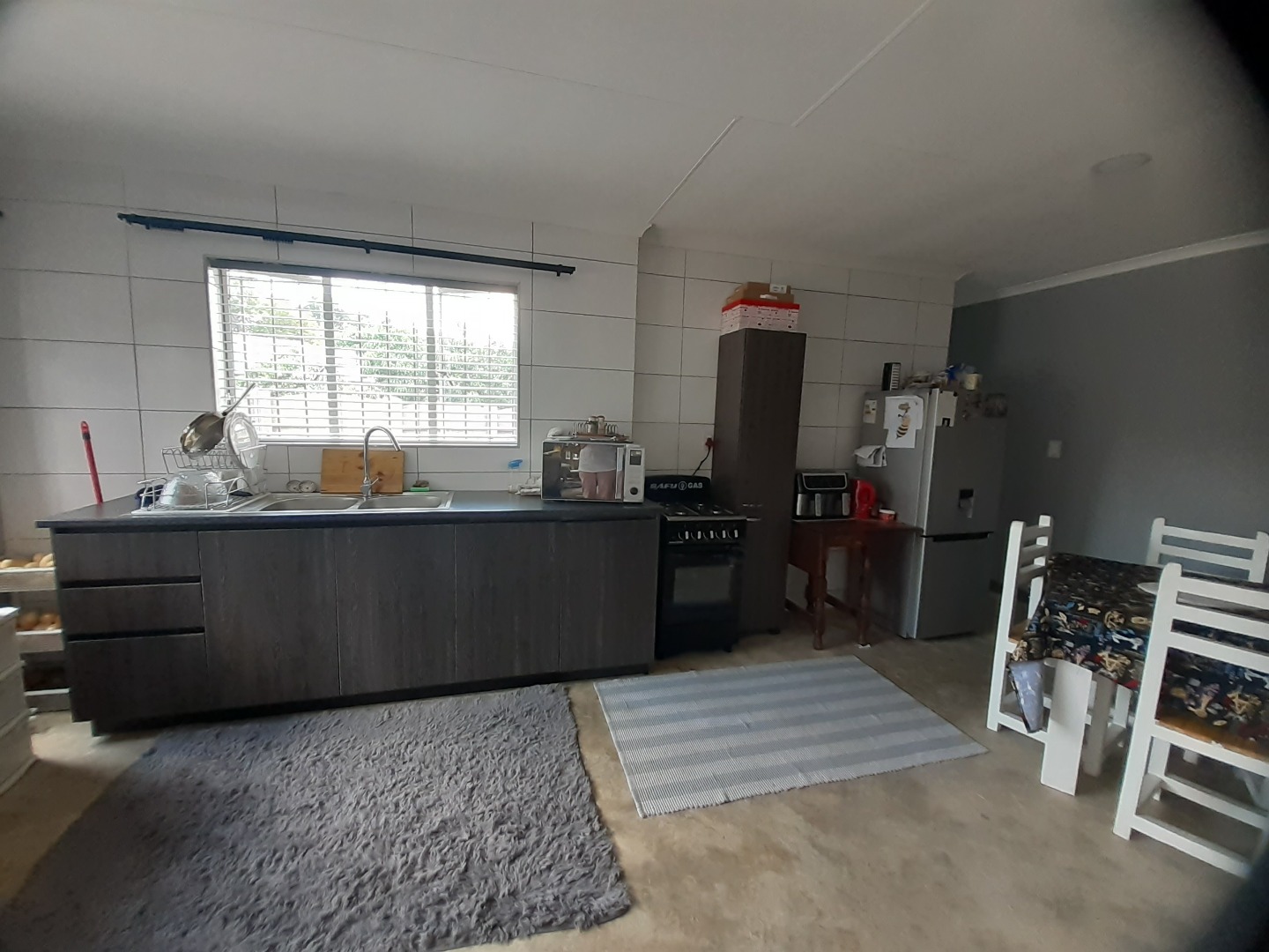 Step inside through a natural wood front door into an inviting entrance area featuring durable tiled flooring and elegant arched passages that guide you through the home. The interior boasts a spacious lounge, perfect for relaxation, and a dedicated dining room for family meals. The Kitchen offer wooden units with a free standing gas stove.