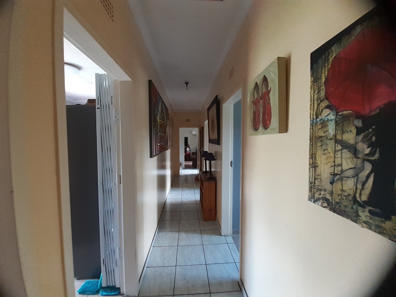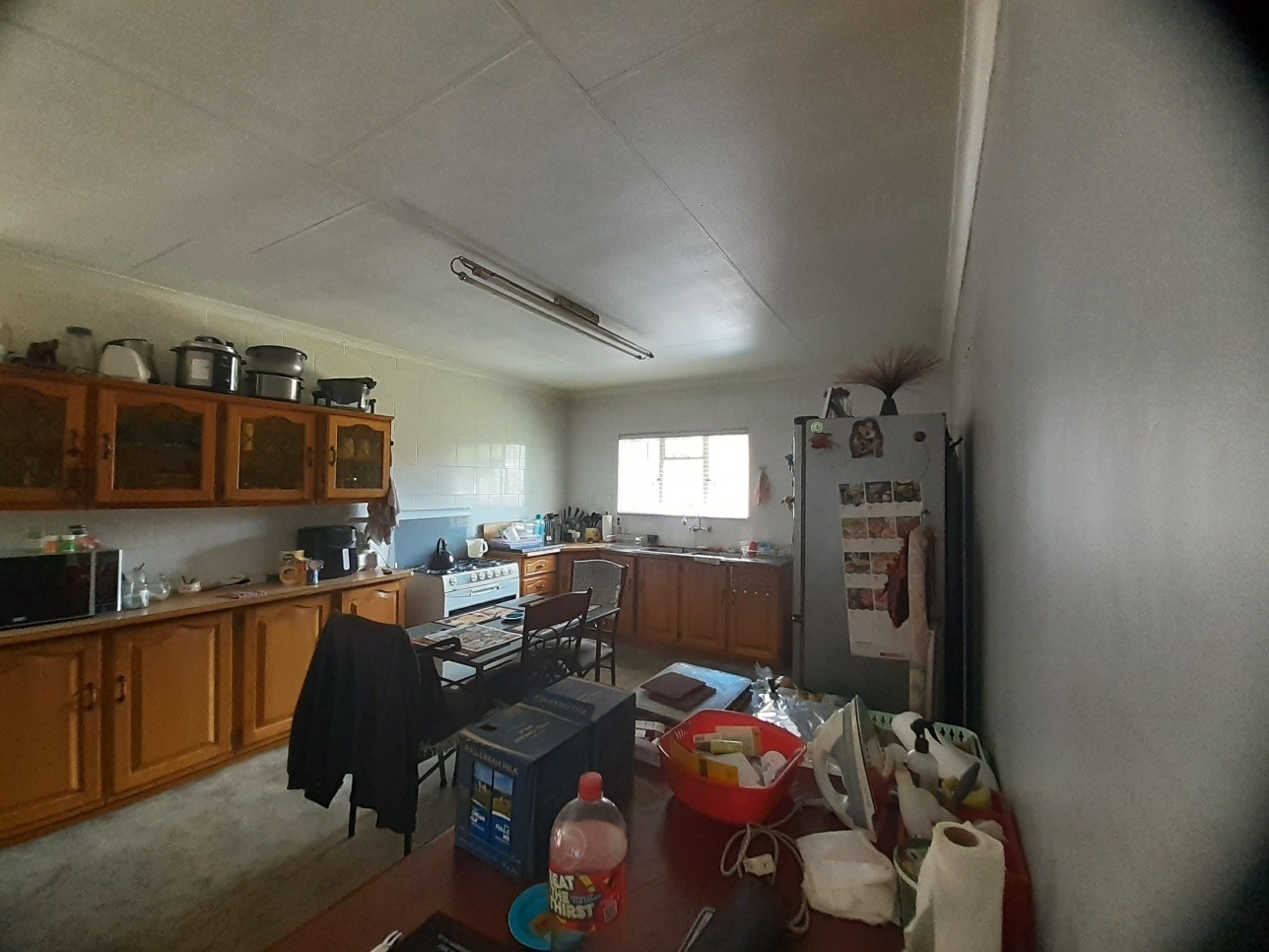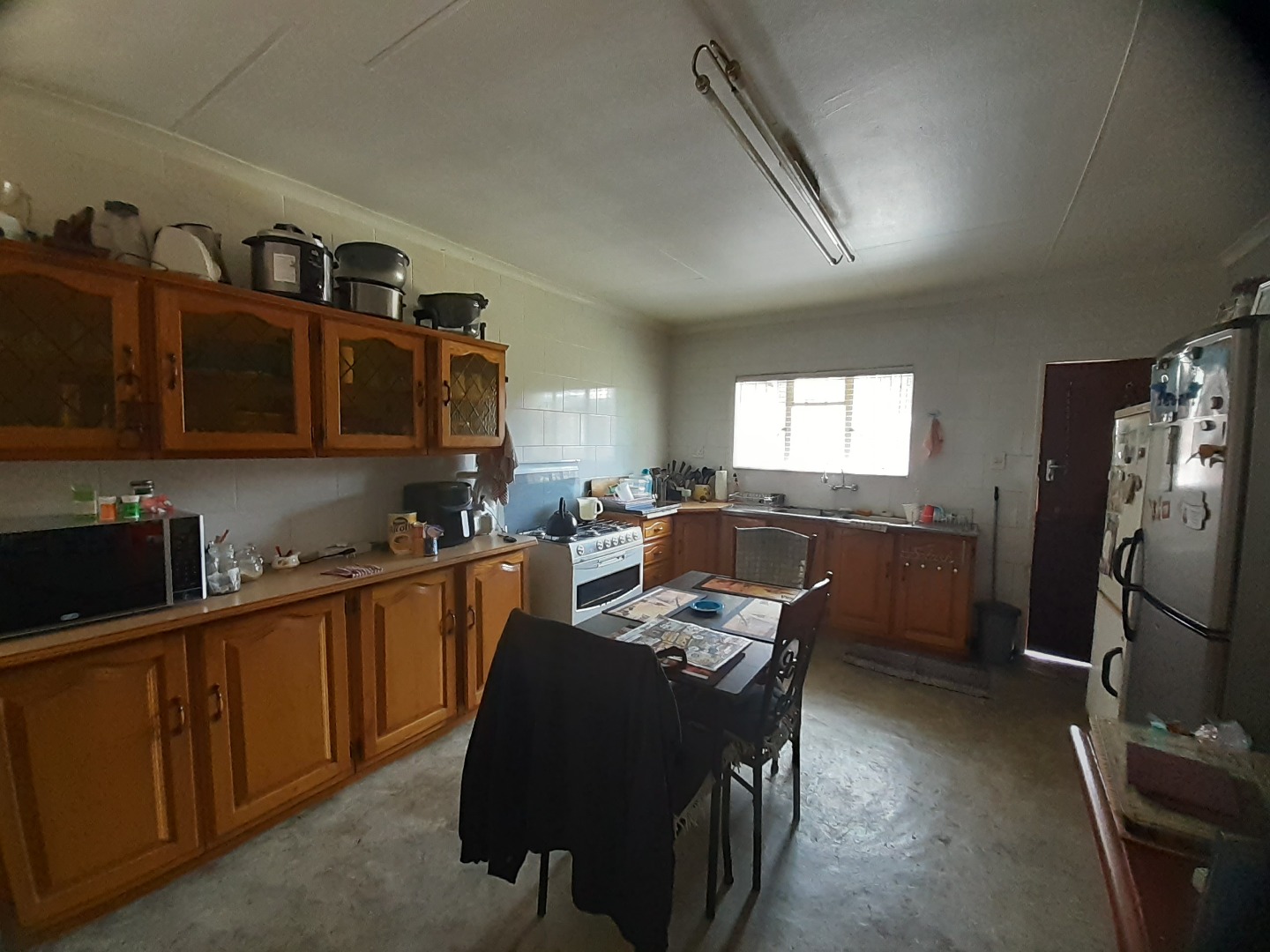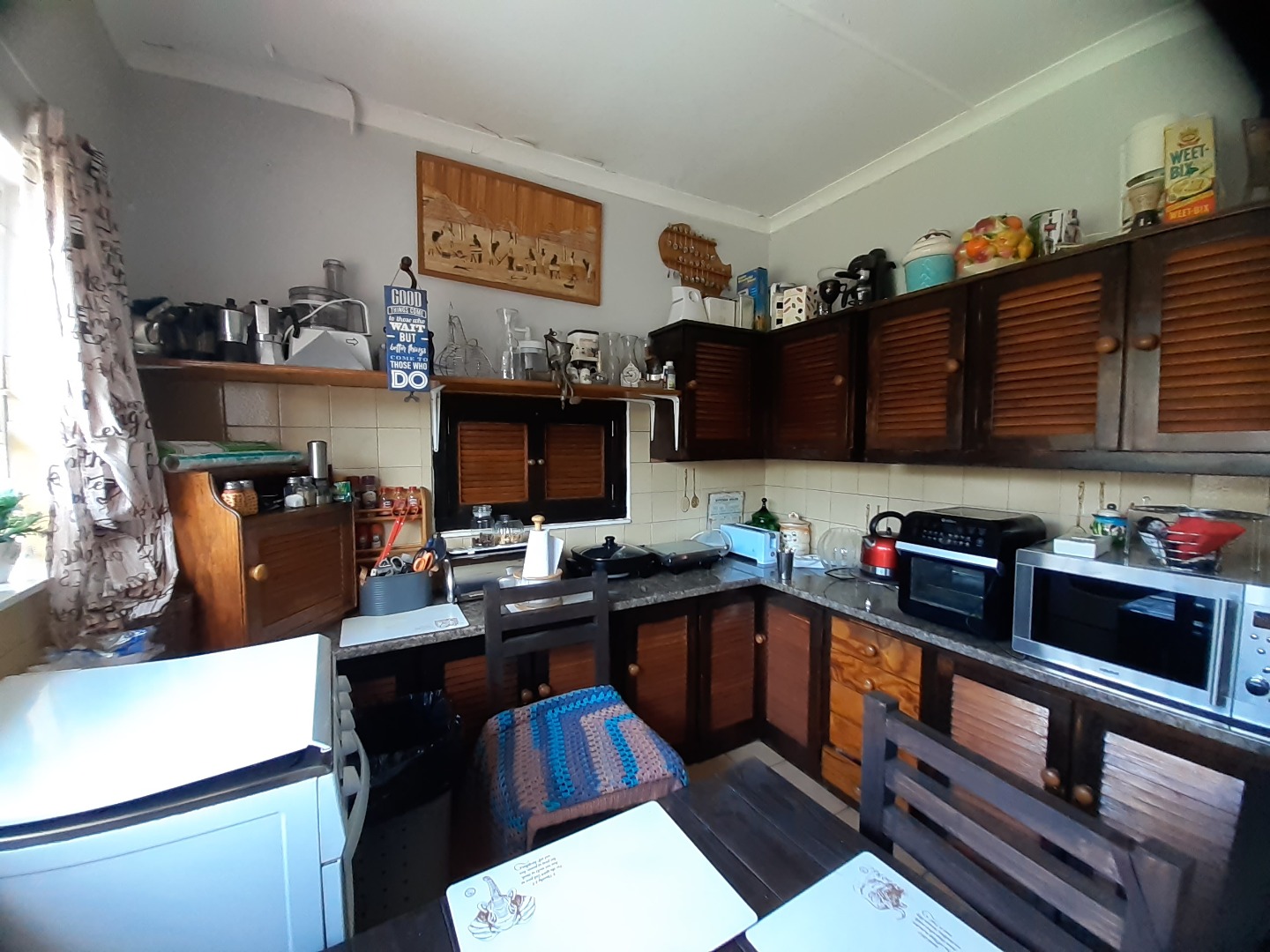 Step inside through a natural wood front door into an inviting entrance area featuring durable tiled flooring and elegant arched passages that guide you through the home. The interior boasts a spacious lounge, perfect for relaxation, and a dedicated dining room for family meals. The Kitchen offer wooden units with a free standing gas stove.